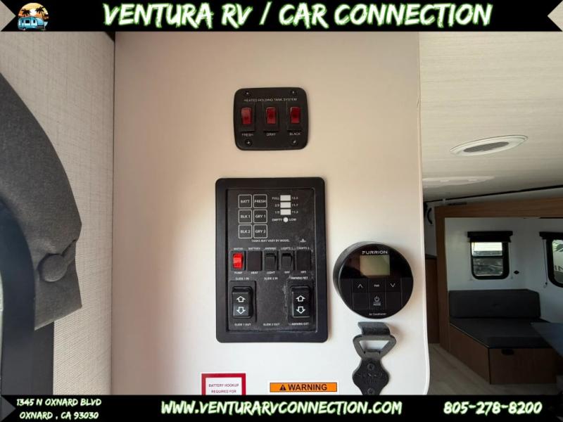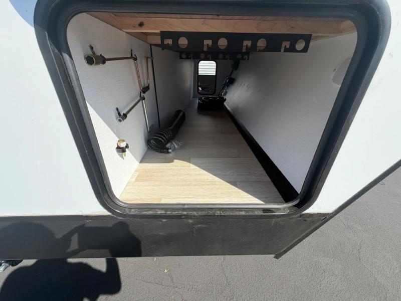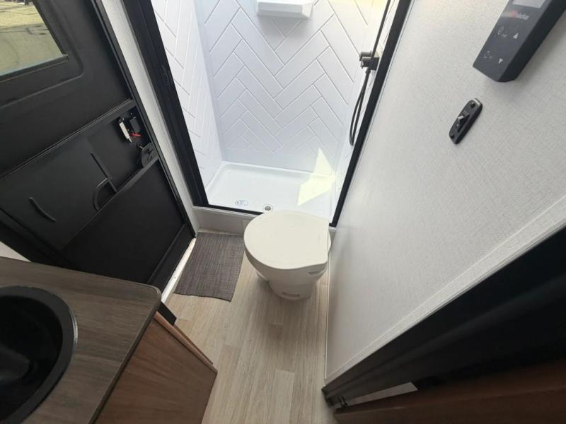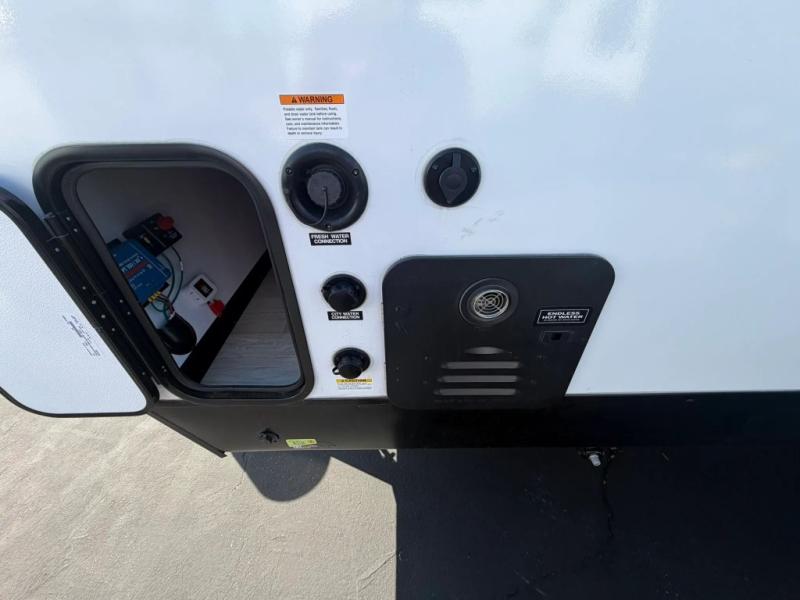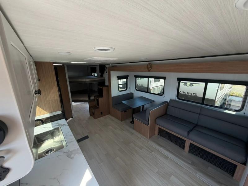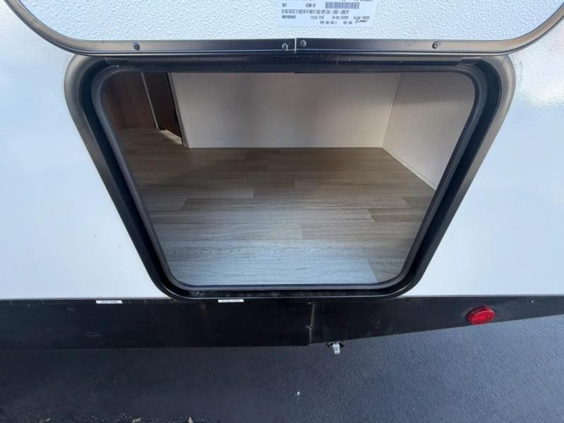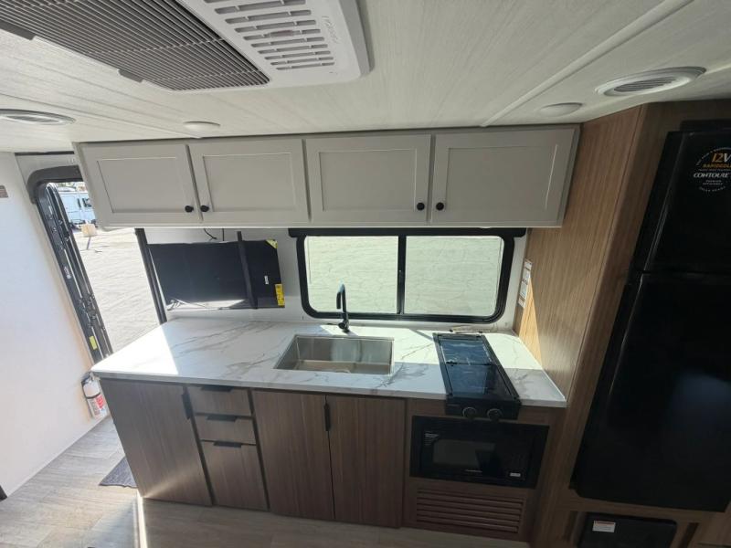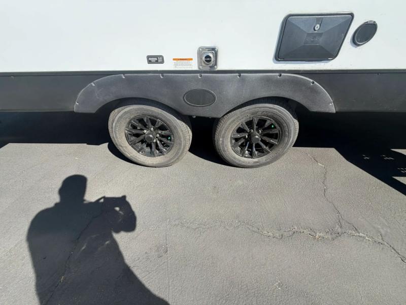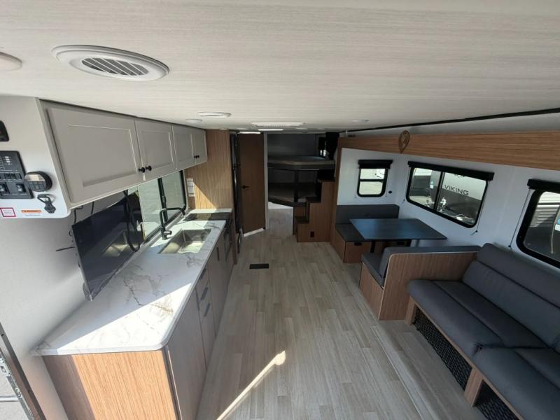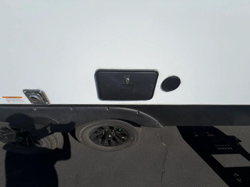 The double-size bunks in this spacious travel trailer make it family approved and perfect for camping with a larger group. You'll have your own private bedroom up front with a queen bed and dual bedside wardrobes, and there are sliding doors to the bedroom which help save space. The main living area and kitchen is made open thanks to the large slide out which houses the booth dinette and jack knife sofa. The fully equipped kitchen lets the chef of your group whip up their best meals, and the full bath with its own exterior entry door is sure to come in handy!
