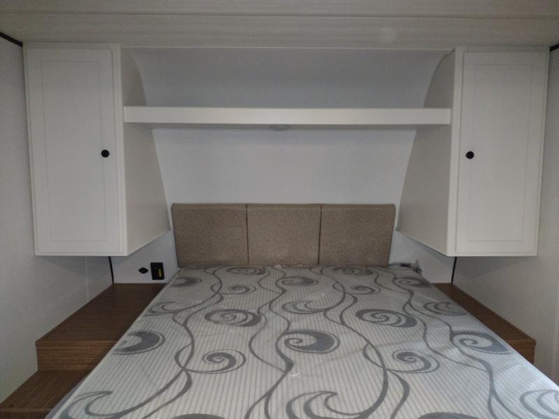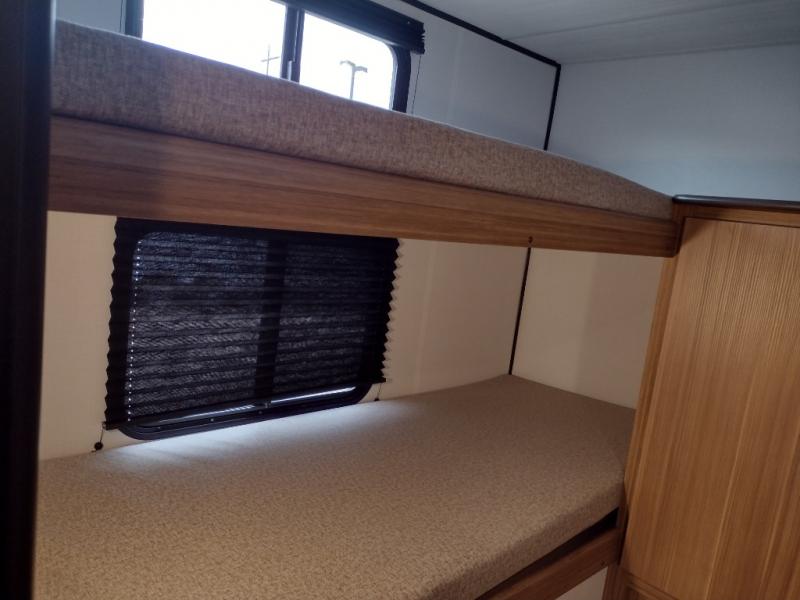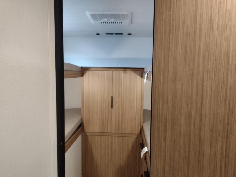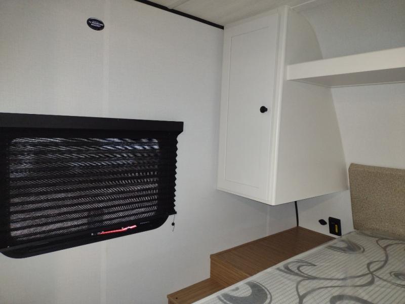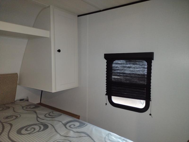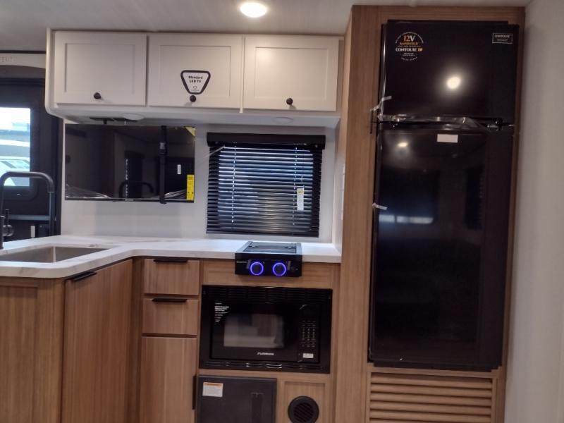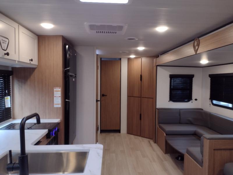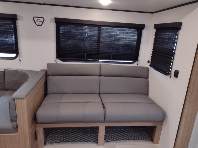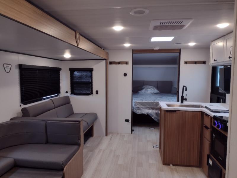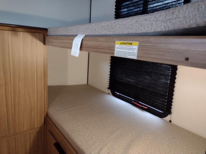 This spacious travel trailer is perfect for a large group or family since it can sleep eight to ten people each night. The bunkhouse will be a favorite spot for the littles ones to enjoy, especially with four bunk beds and a wardrobe with storage. You'll have a queen bed up front in the private bedroom, and if you have any other guests, they can sleep on the jack knife sofa and booth dinette! The two burner range and microwave oven allow you to make meals each day, and the large double door 12V refrigerator will keep leftovers fresh.
