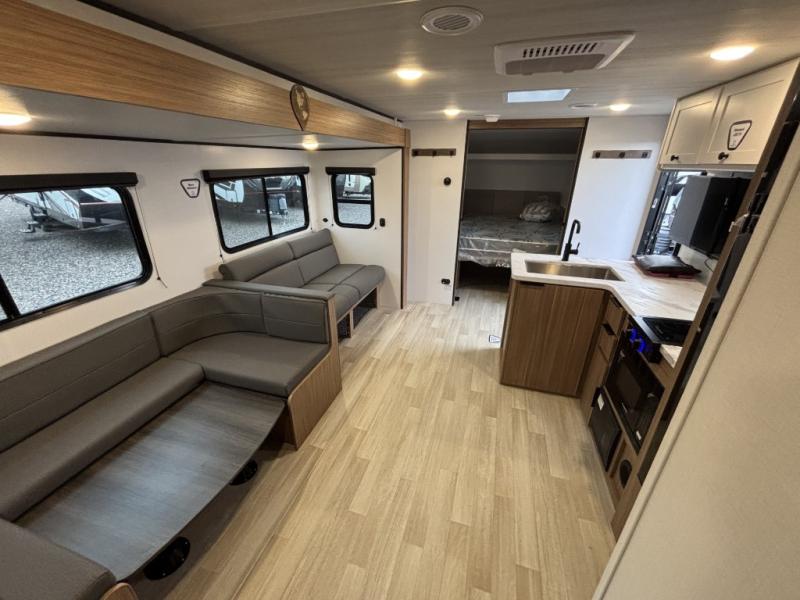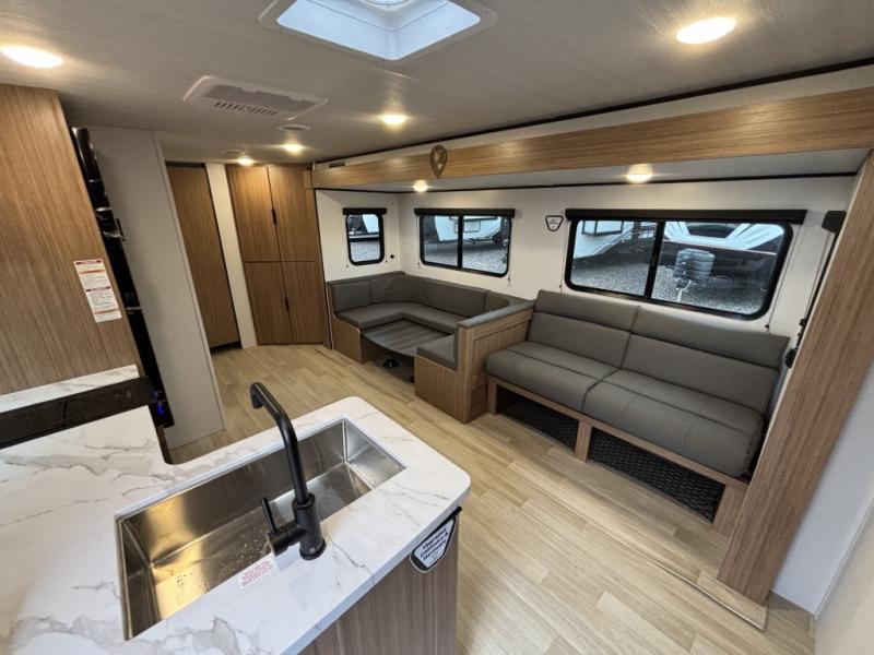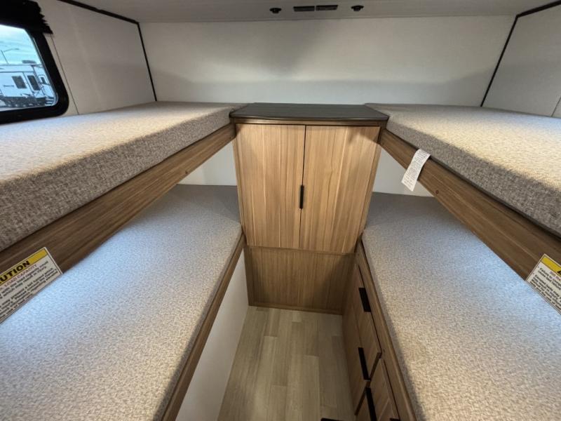 This spacious travel trailer is perfect for a large group or family since it can sleep eight to ten people each night. The bunkhouse will be a favorite spot for the littles ones to enjoy, especially with four bunk beds and a wardrobe with storage. You'll have a queen bed up front in the private bedroom, and if you have any other guests, they can sleep on the jack knife sofa and booth dinette! The two burner range and microwave oven allow you to make meals each day, and the large double door 12V refrigerator will keep leftovers fresh.