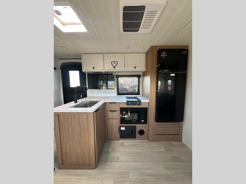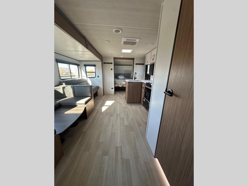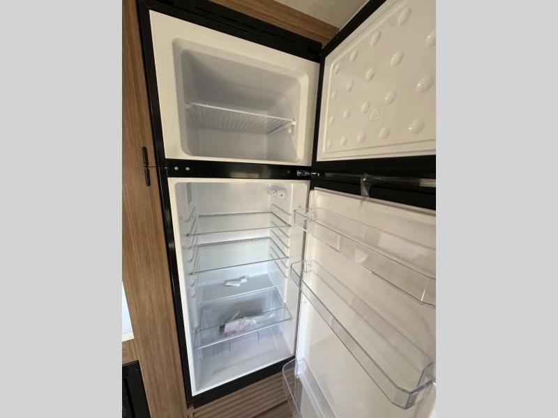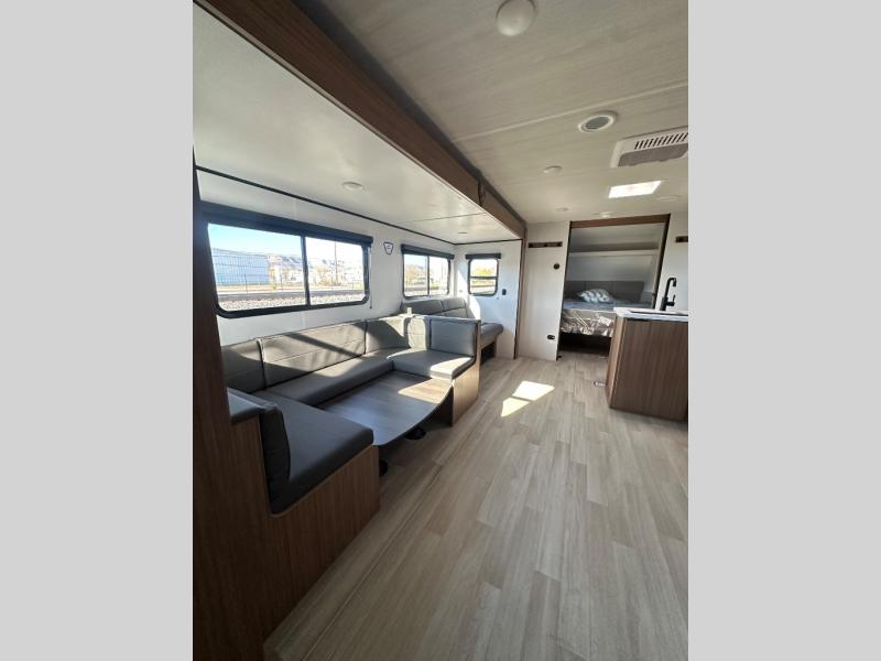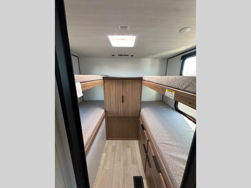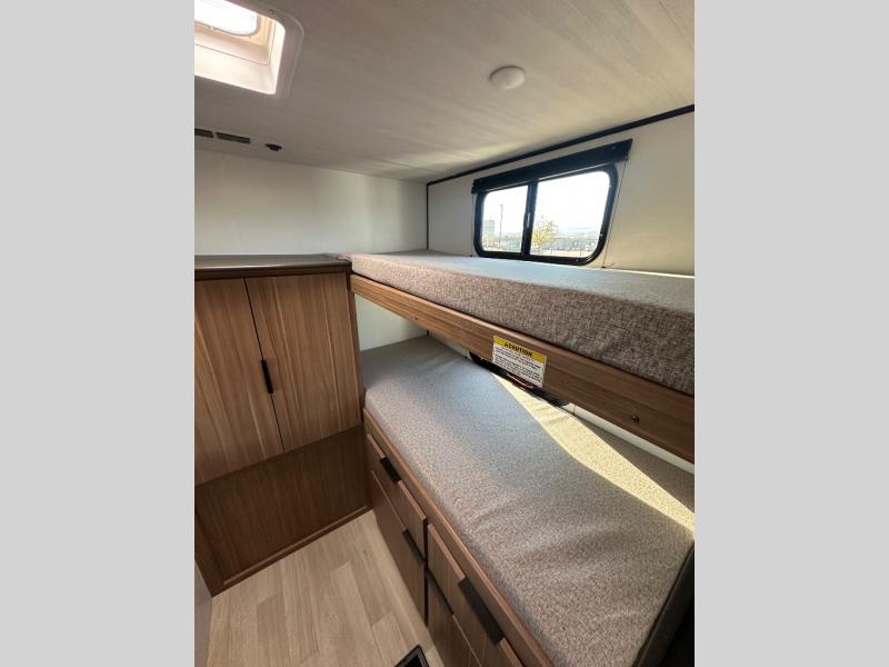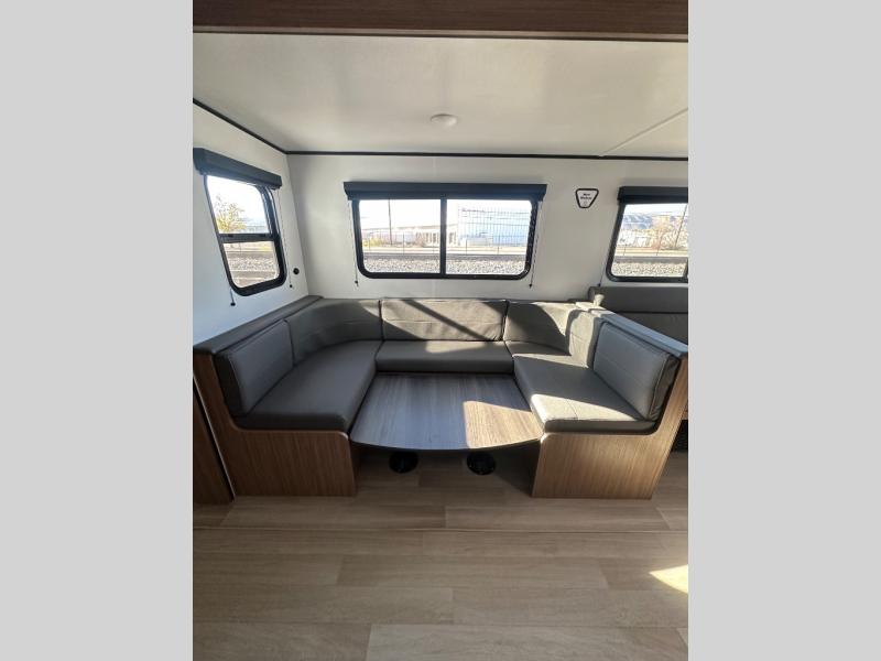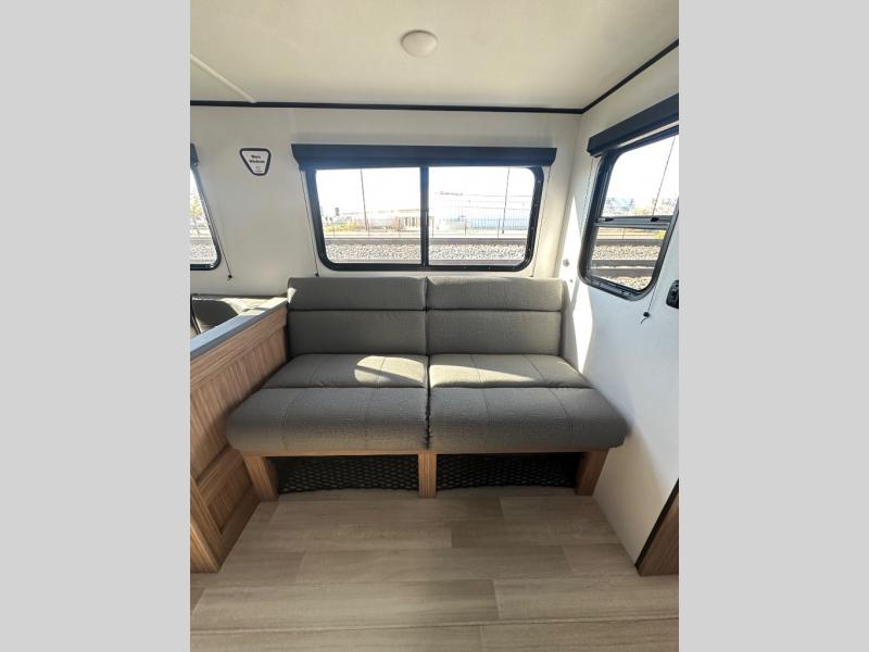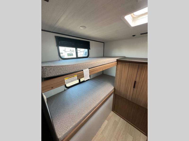 This spacious travel trailer is perfect for a large group or family since it can sleep eight to ten people each night. The bunkhouse will be a favorite spot for the littles ones to enjoy, especially with four bunk beds and a wardrobe with storage. You'll have a queen bed up front in the private bedroom, and if you have any other guests, they can sleep on the jack knife sofa and booth dinette! The two burner range and microwave oven allow you to make meals each day, and the large double door 12V refrigerator will keep leftovers fresh.