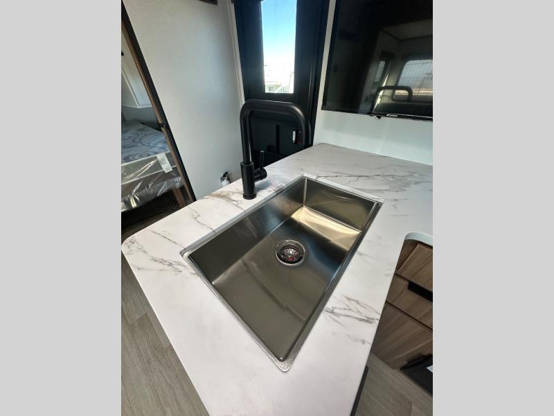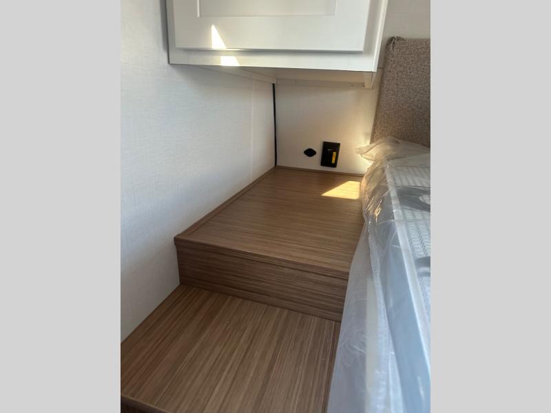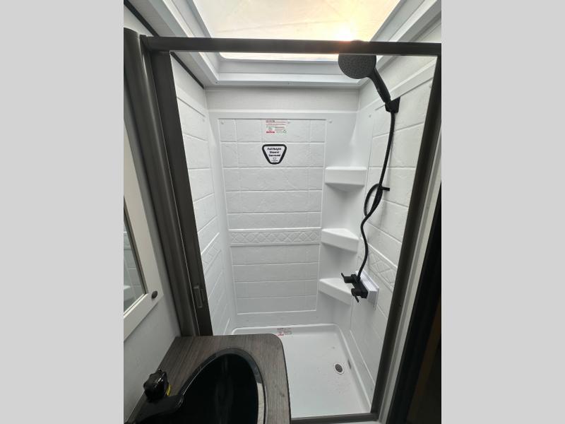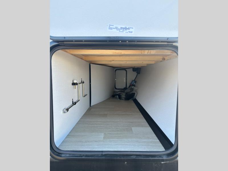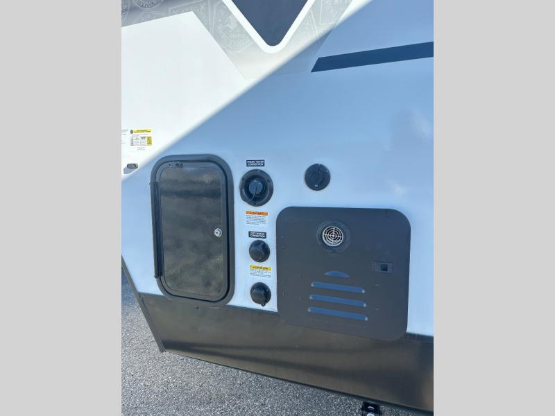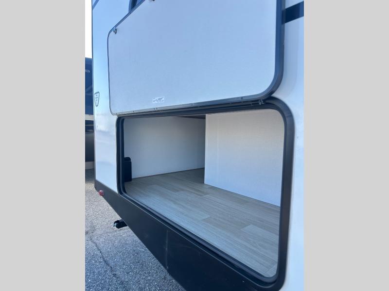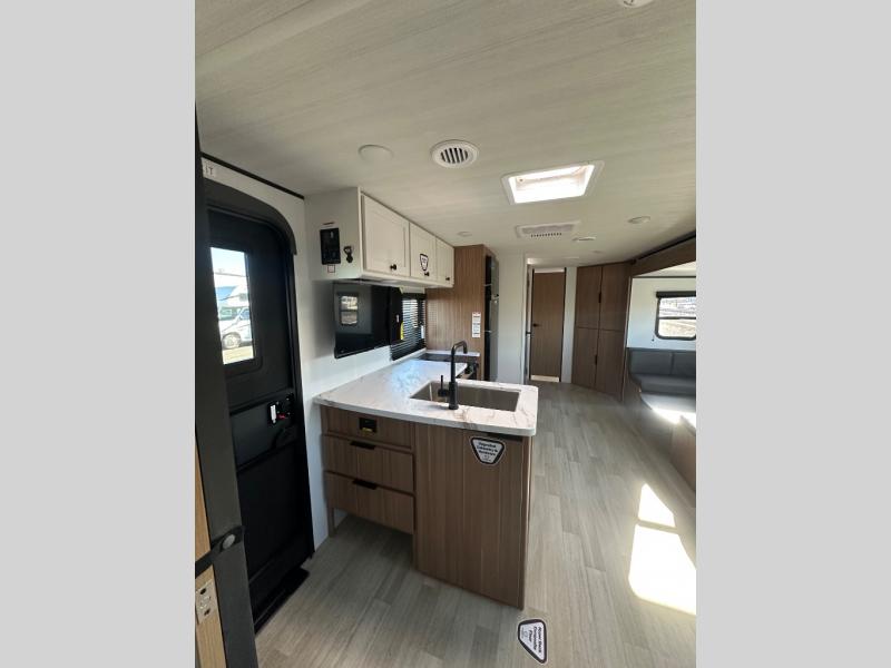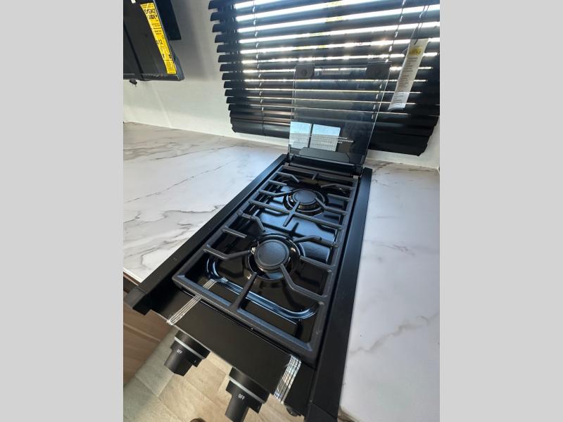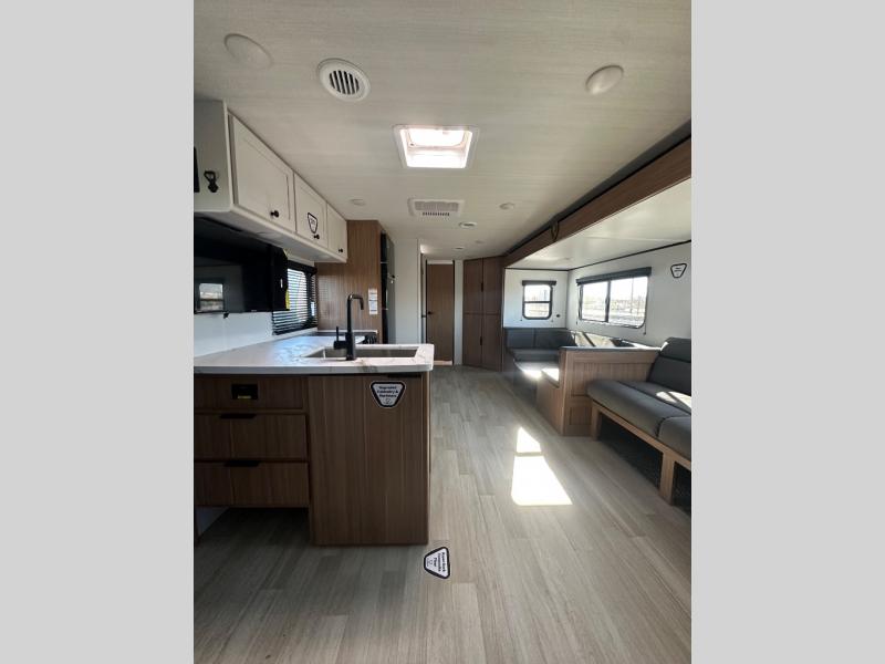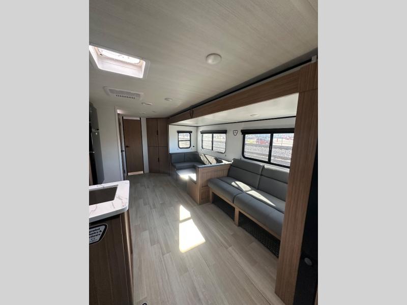This spacious travel trailer is perfect for a large group or family since it can sleep eight to ten people each night. The bunkhouse will be a favorite spot for the littles ones to enjoy, especially with four bunk beds and a wardrobe with storage. You'll have a queen bed up front in the private bedroom, and if you have any other guests, they can sleep on the jack knife sofa and booth dinette! The two burner range and microwave oven allow you to make meals each day, and the large double door 12V refrigerator will keep leftovers fresh.