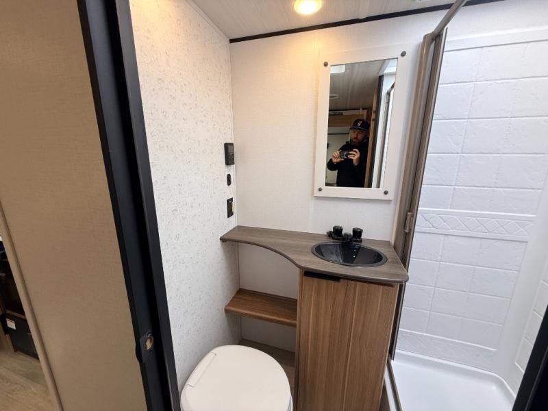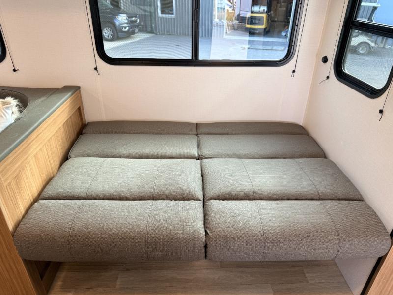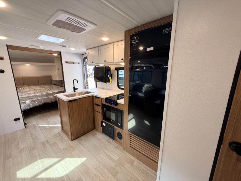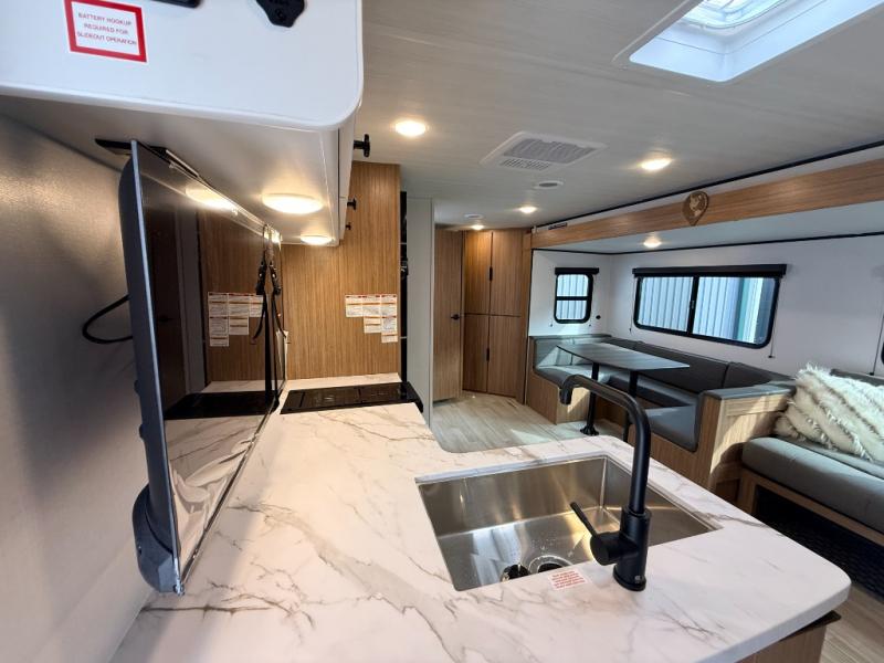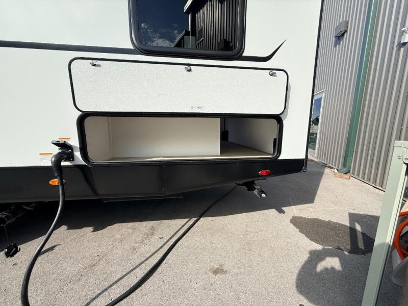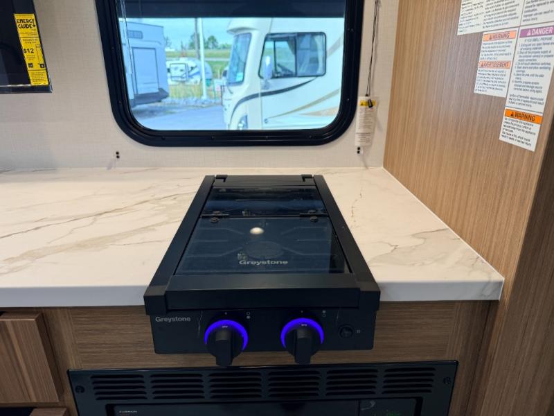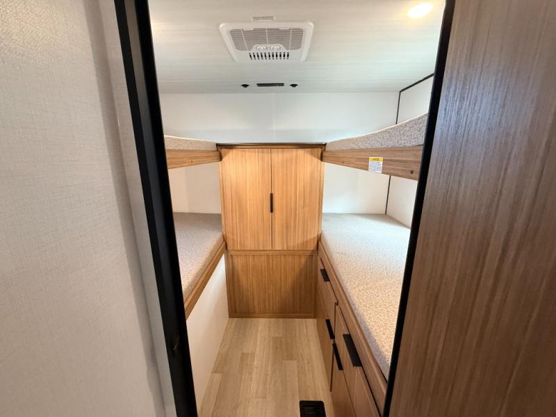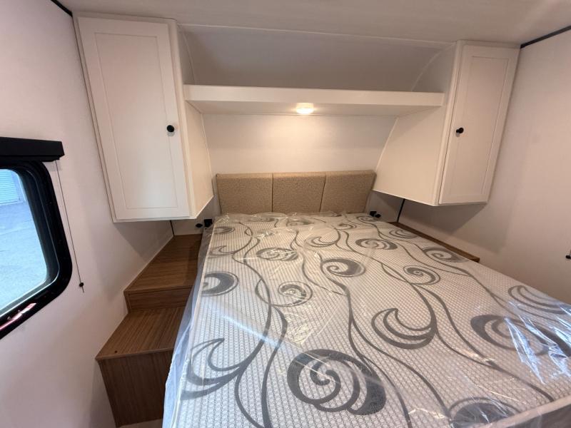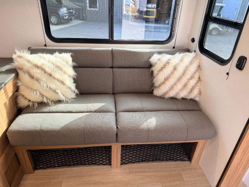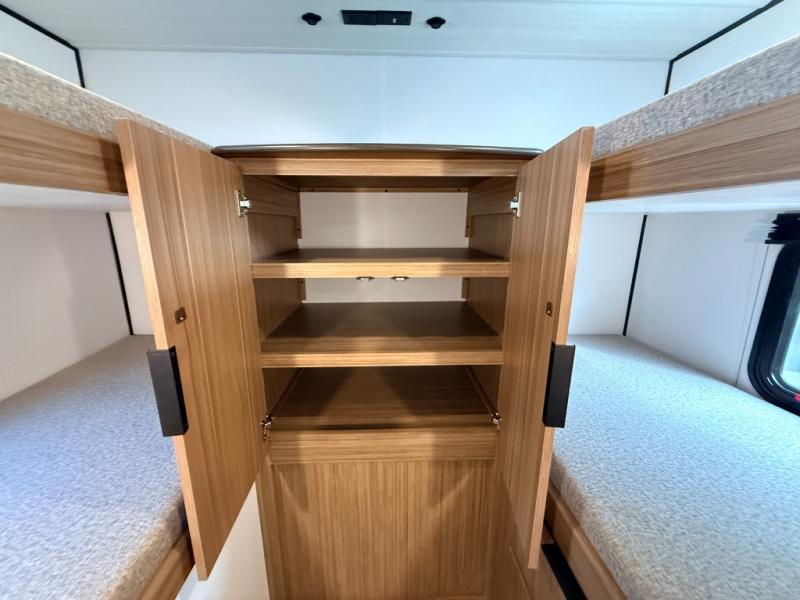 This spacious travel trailer is perfect for a large group or family since it can sleep eight to ten people each night. The bunkhouse will be a favorite spot for the littles ones to enjoy, especially with four bunk beds and a wardrobe with storage. You'll have a queen bed up front in the private bedroom, and if you have any other guests, they can sleep on the jack knife sofa and booth dinette! The two burner range and microwave oven allow you to make meals each day, and the large double door 12V refrigerator will keep leftovers fresh.