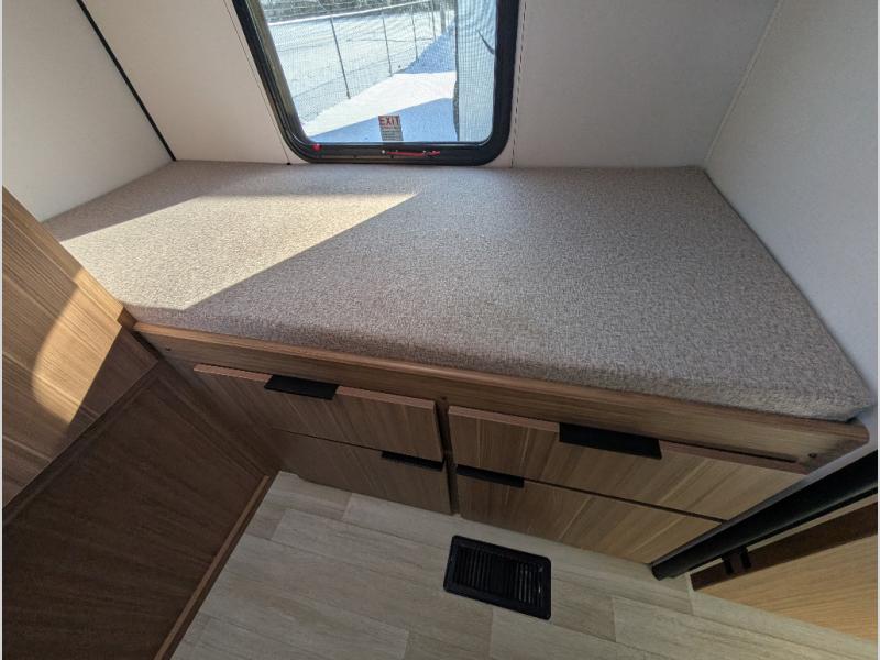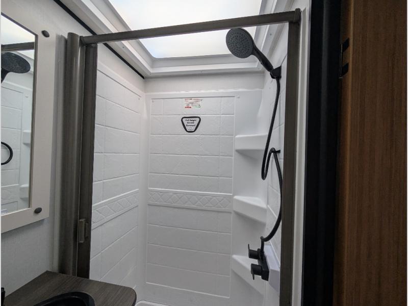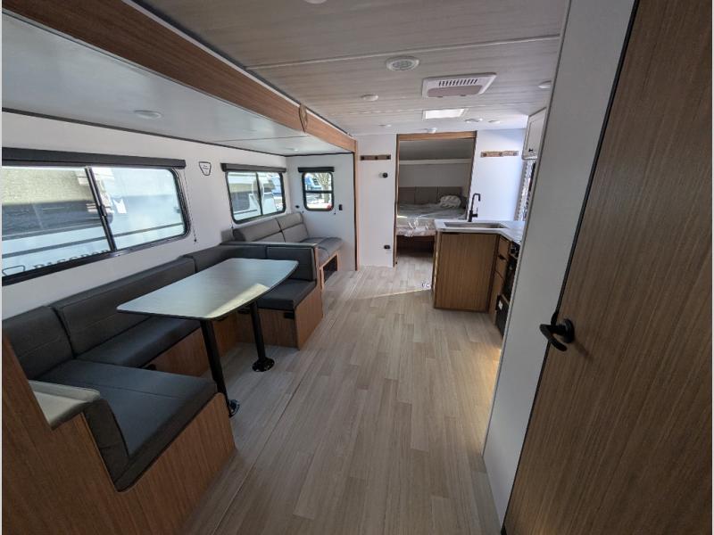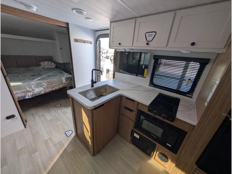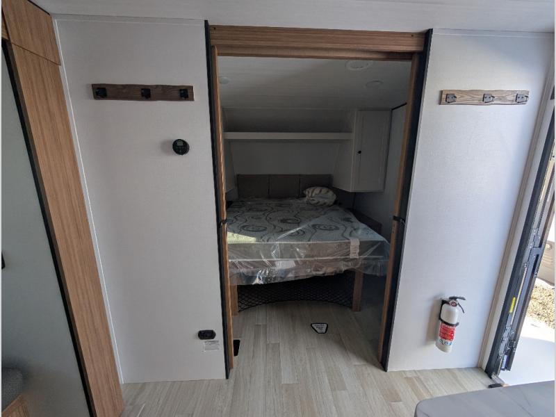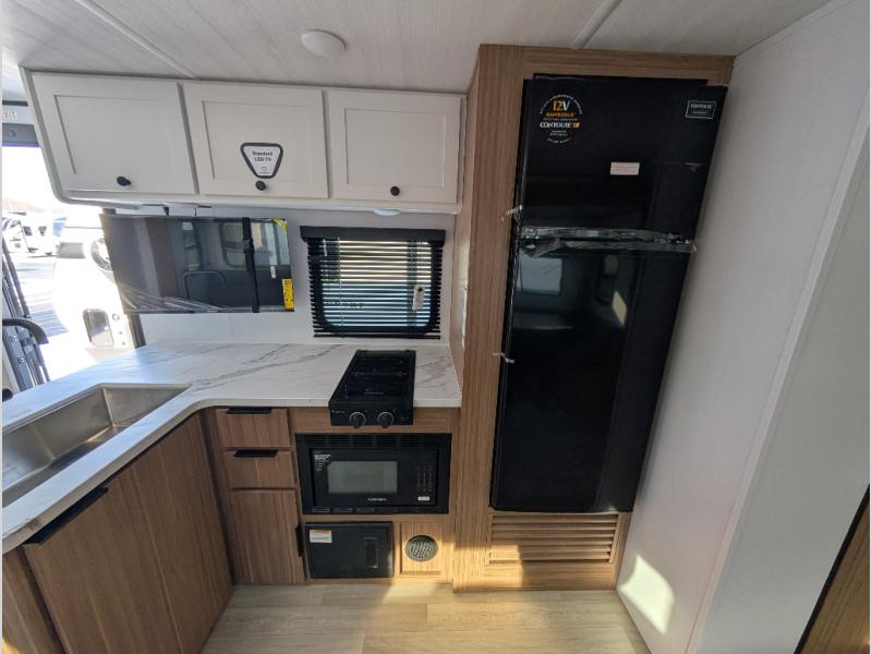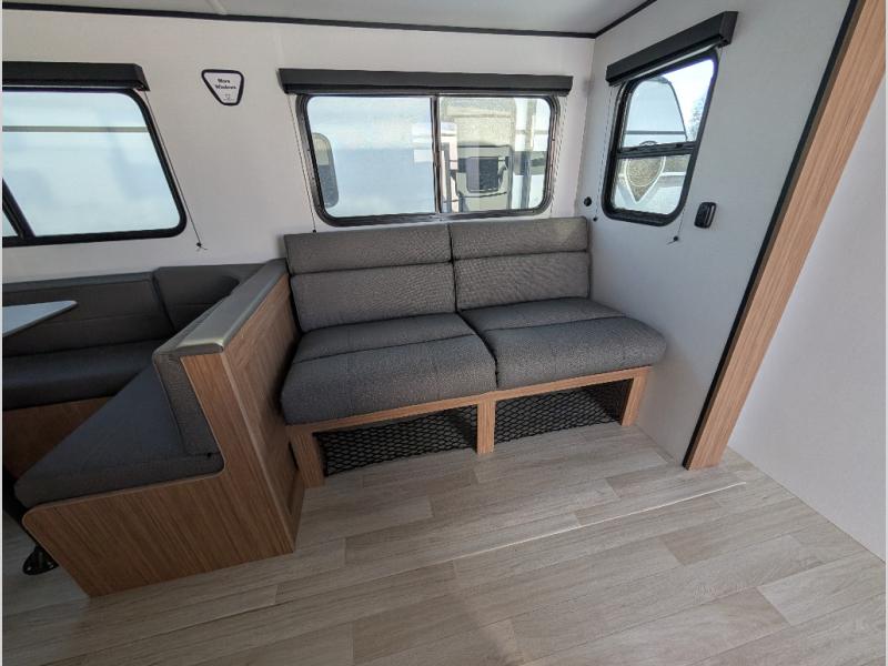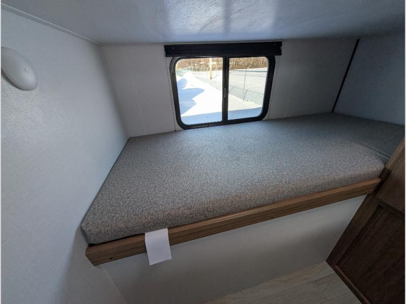 This spacious travel trailer is perfect for a large group or family since it can sleep eight to ten people each night. The bunkhouse will be a favorite spot for the littles ones to enjoy, especially with four bunk beds and a wardrobe with storage. You'll have a queen bed up front in the private bedroom, and if you have any other guests, they can sleep on the jack knife sofa and booth dinette! The two burner range and microwave oven allow you to make meals each day, and the large double door 12V refrigerator will keep leftovers fresh.