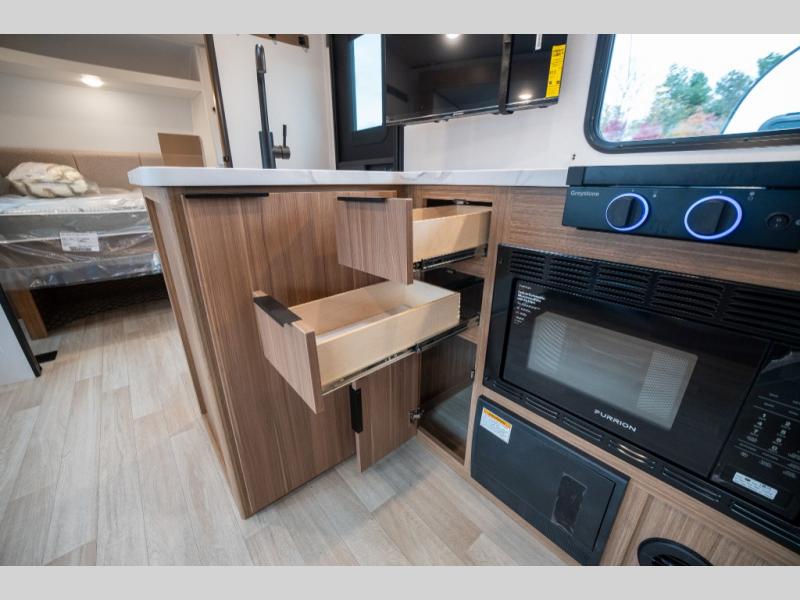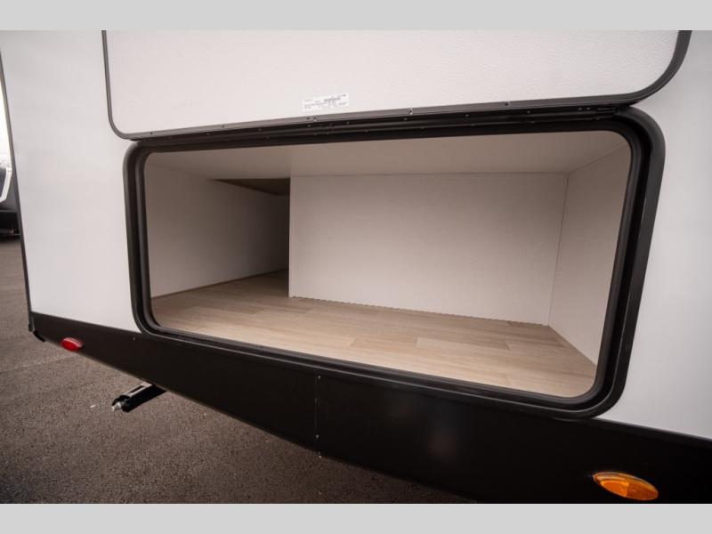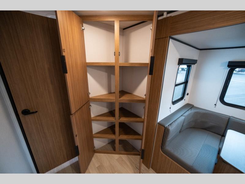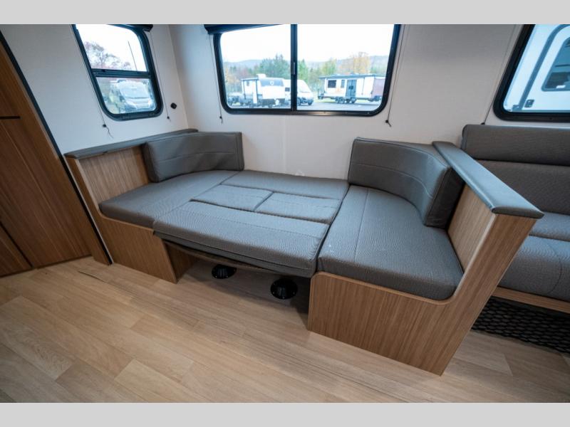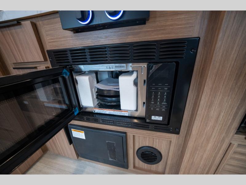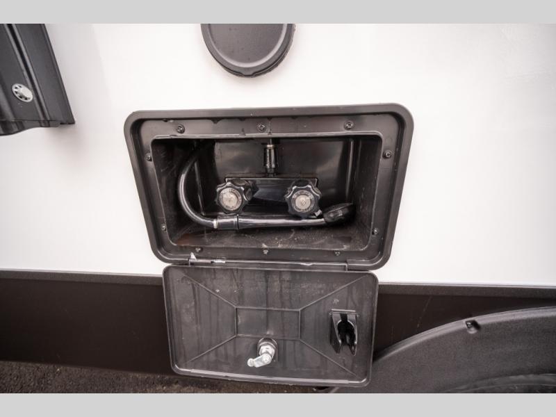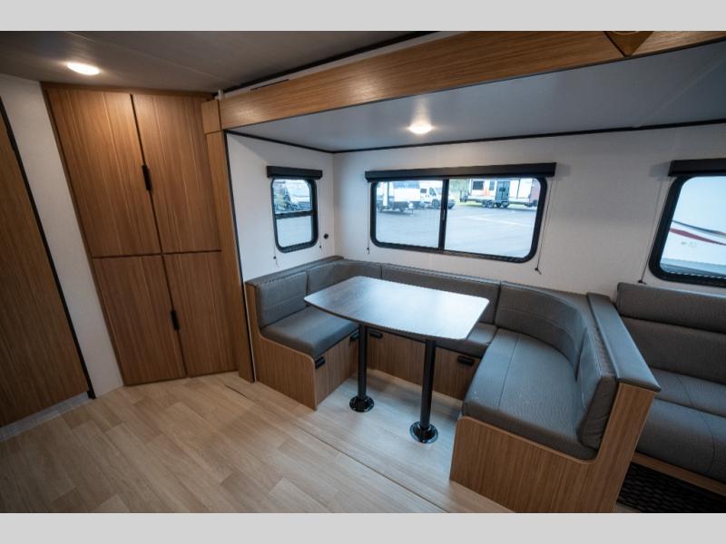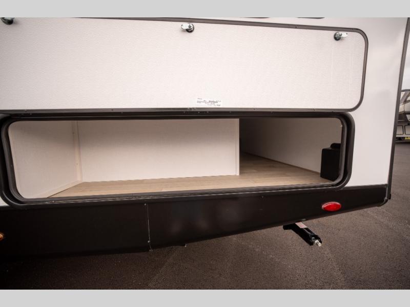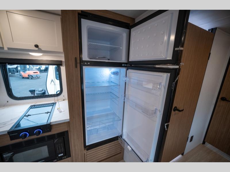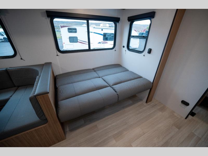 This spacious travel trailer is perfect for a large group or family since it can sleep eight to ten people each night. The bunkhouse will be a favorite spot for the littles ones to enjoy, especially with four bunk beds and a wardrobe with storage. You'll have a queen bed up front in the private bedroom, and if you have any other guests, they can sleep on the jack knife sofa and booth dinette! The two burner range and microwave oven allow you to make meals each day, and the large double door 12V refrigerator will keep leftovers fresh.