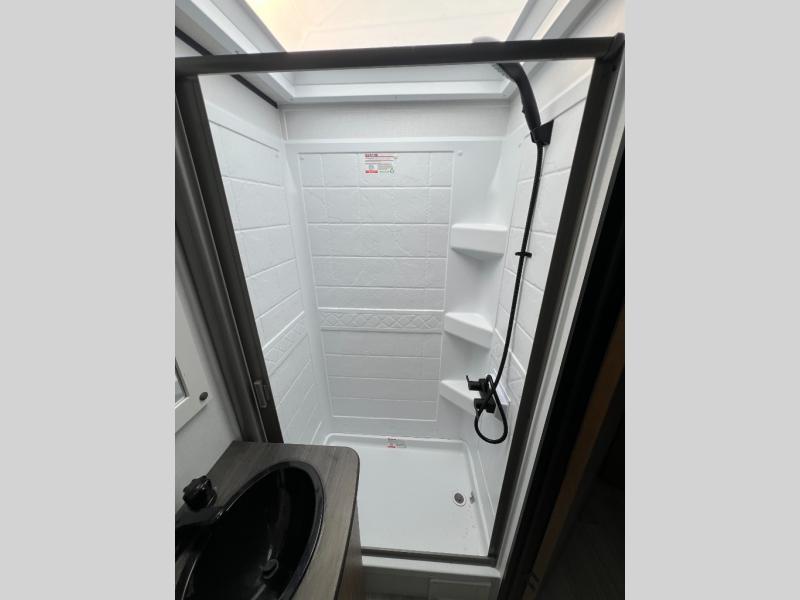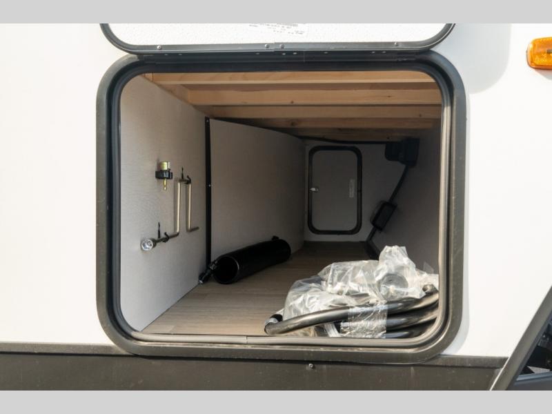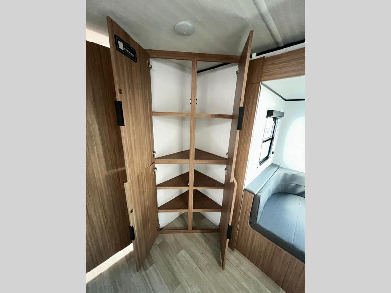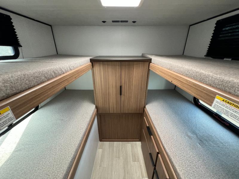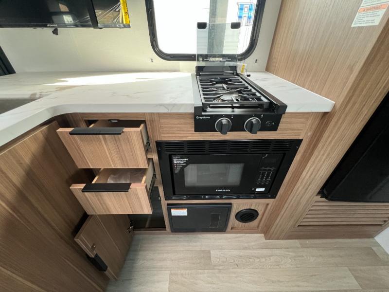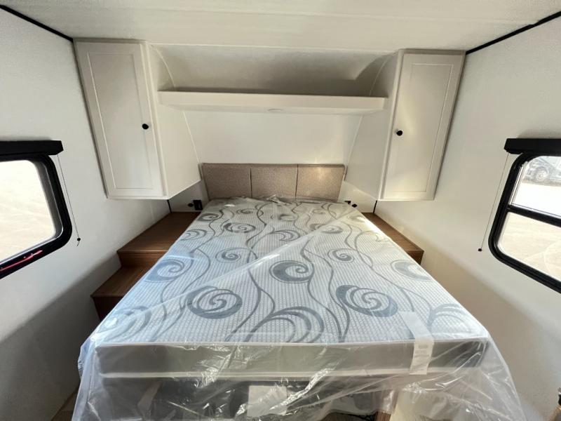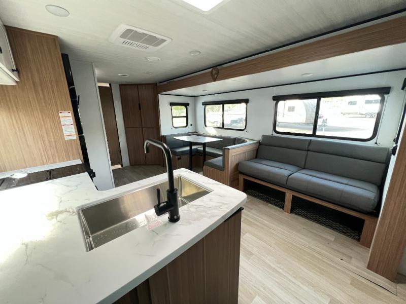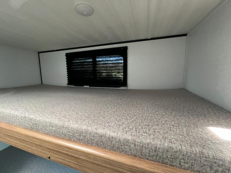 This spacious travel trailer is perfect for a large group or family since it can sleep eight to ten people each night. The bunkhouse will be a favorite spot for the littles ones to enjoy, especially with four bunk beds and a wardrobe with storage. You'll have a queen bed up front in the private bedroom, and if you have any other guests, they can sleep on the jack knife sofa and booth dinette! The two burner range and microwave oven allow you to make meals each day, and the large double door 12V refrigerator will keep leftovers fresh.