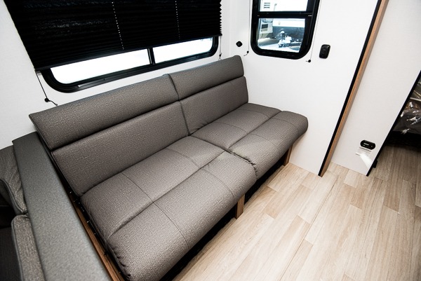 This spacious travel trailer is perfect for a large group or family since it can sleep eight to ten people each night. The bunkhouse will be a favorite spot for the little ones to enjoy, especially with four bunk beds and a wardrobe with storage. You'll have a queen bed up front in the private bedroom, and if you have any other guests, they can sleep on the jack knife sofa and U-shaped dinette! The two-burner range and microwave oven allow you to make meals each day, and the large double door 12V refrigerator will keep leftovers fresh.