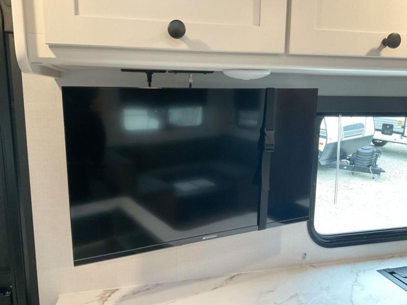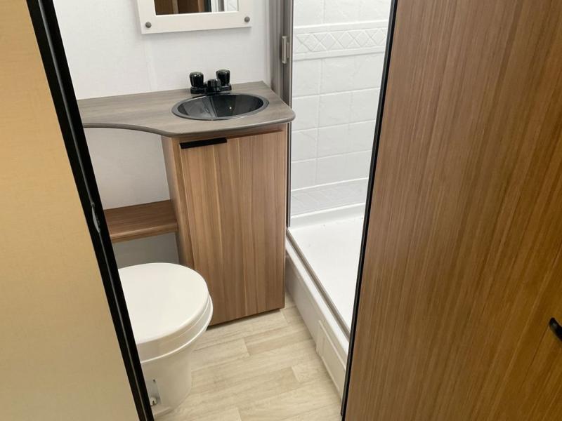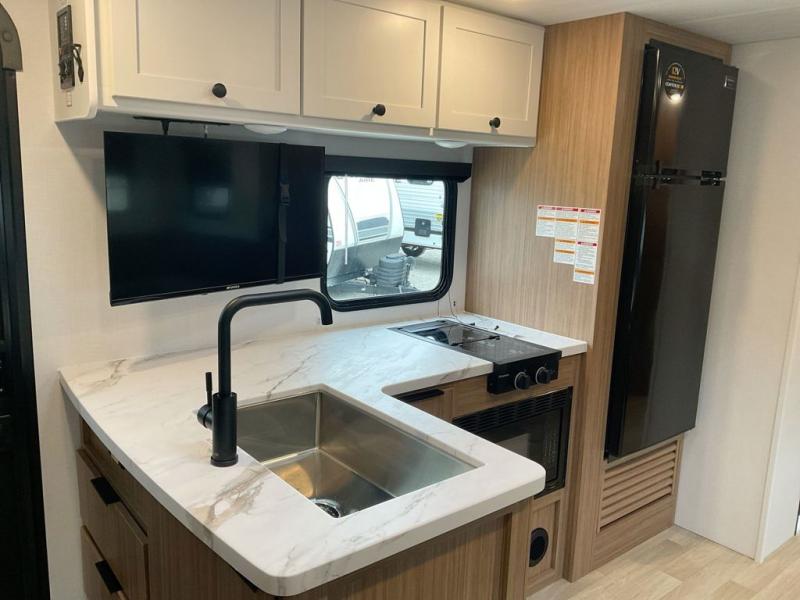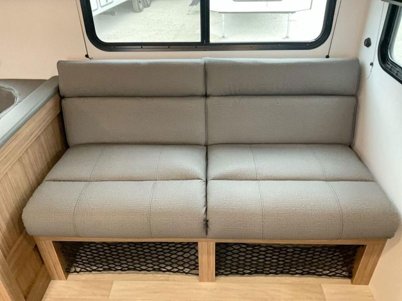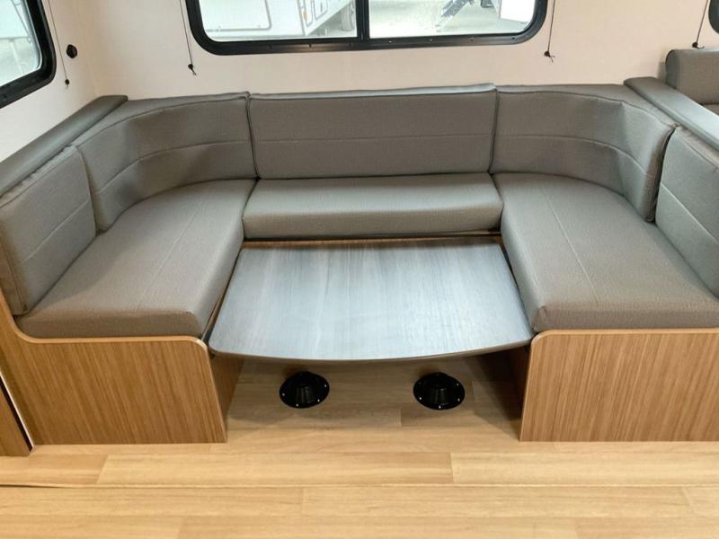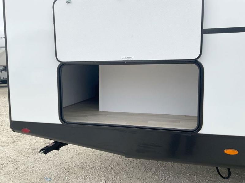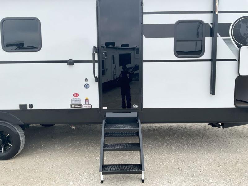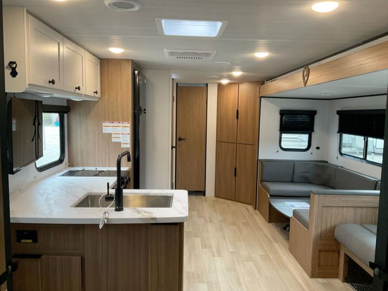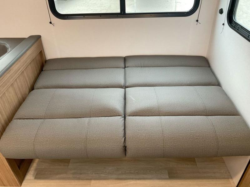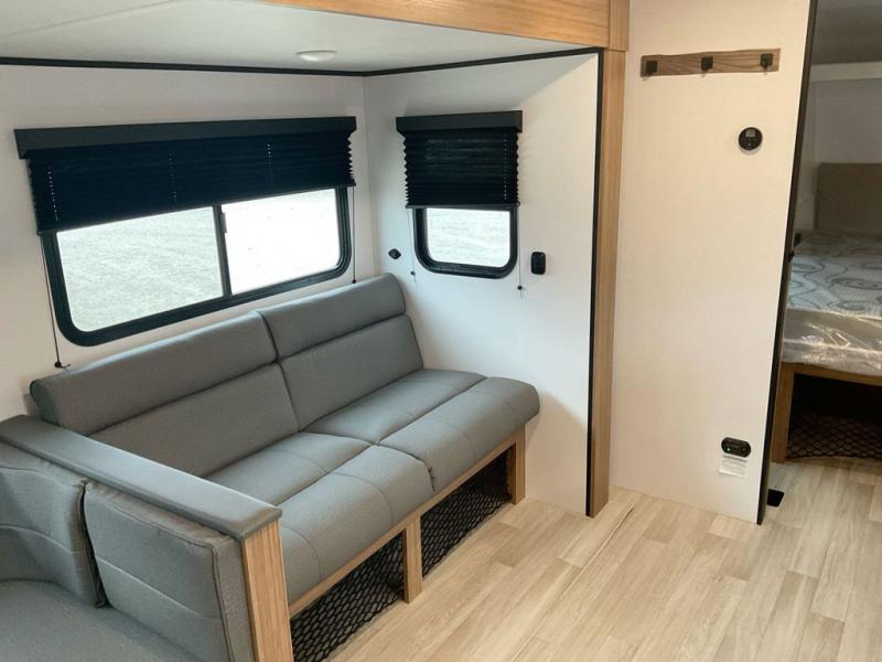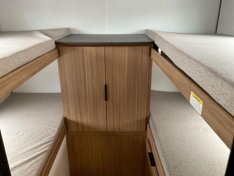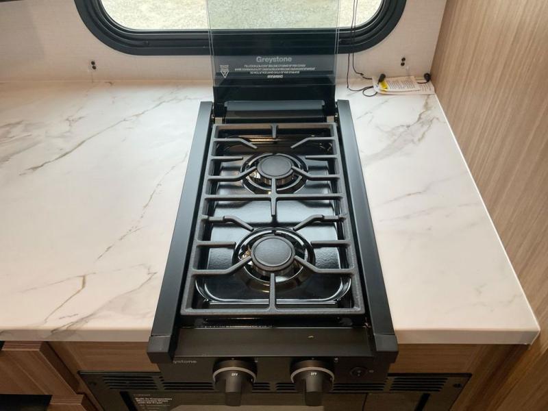 This spacious travel trailer is perfect for a large group or family since it can sleep eight to ten people each night. The bunkhouse will be a favorite spot for the little ones to enjoy, especially with four bunk beds and a wardrobe with storage. You'll have a queen bed up front in the private bedroom, and if you have any other guests, they can sleep on the jack knife sofa and U-shaped dinette! The two-burner range and microwave oven allow you to make meals each day, and the large double door 12V refrigerator will keep leftovers fresh.