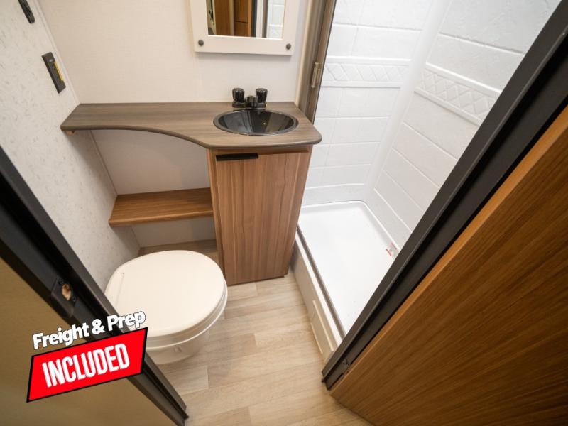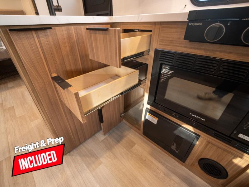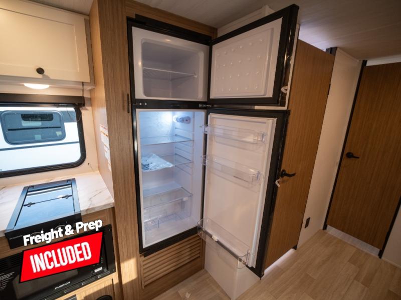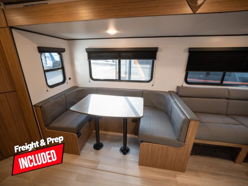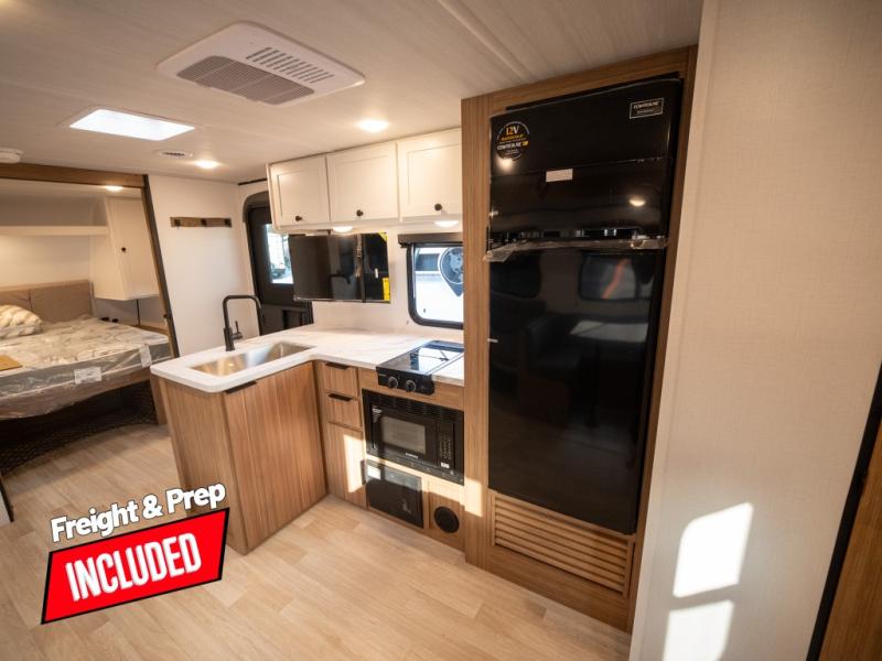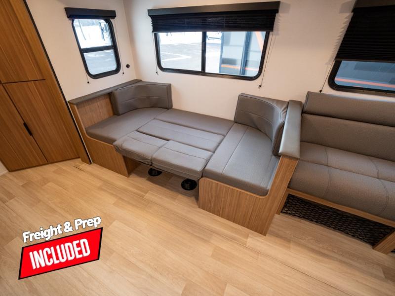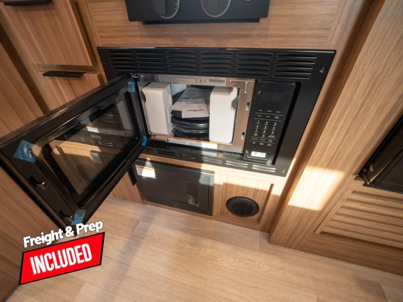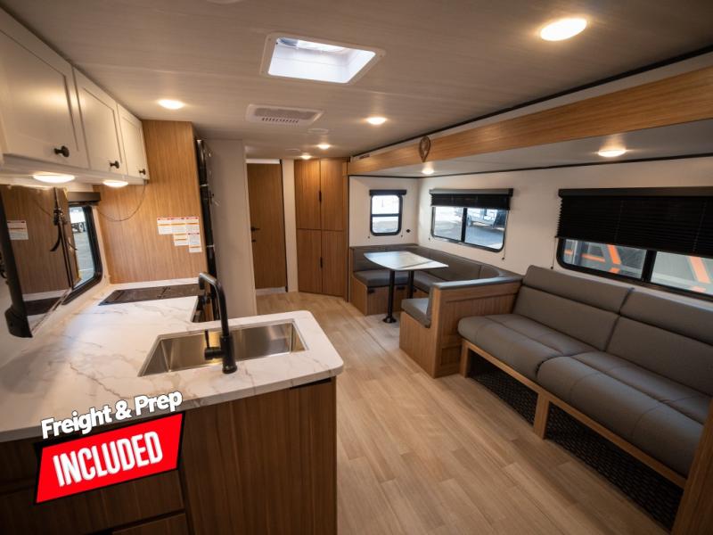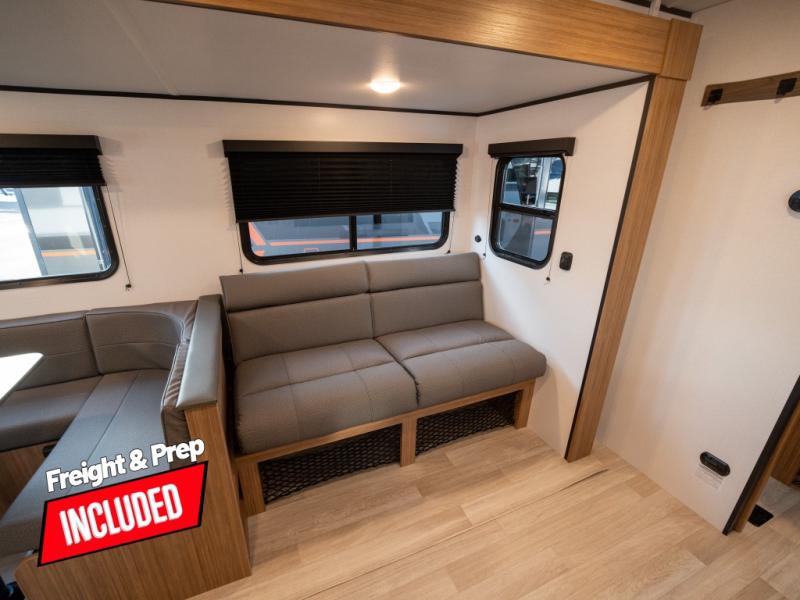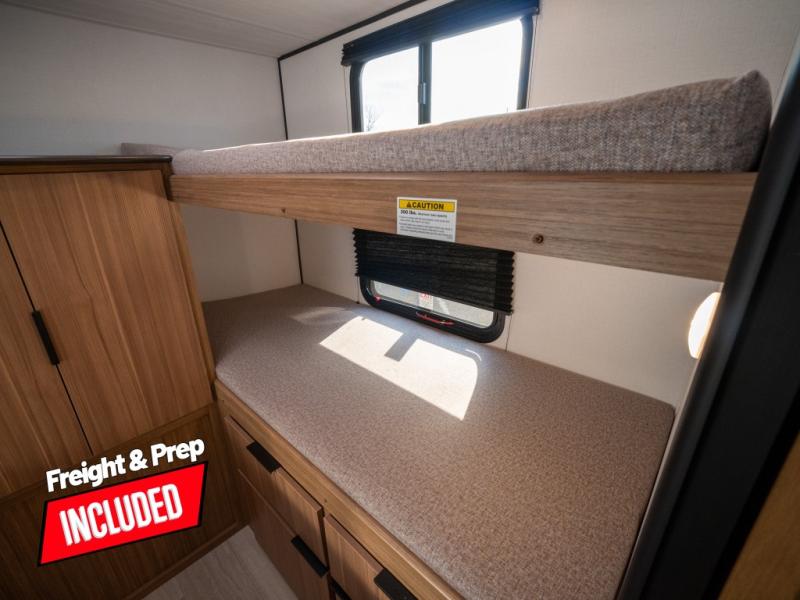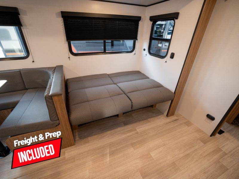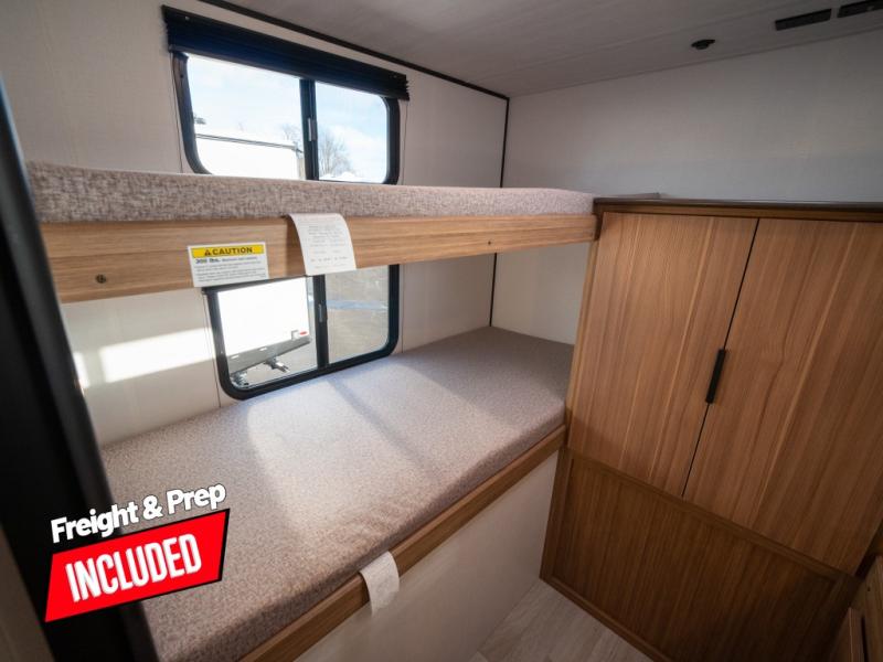 This spacious travel trailer is perfect for a large group or family since it can sleep eight to ten people each night. The bunkhouse will be a favorite spot for the little ones to enjoy, especially with four bunk beds and a wardrobe with storage. You'll have a queen bed up front in the private bedroom, and if you have any other guests, they can sleep on the jack knife sofa and U-shaped dinette! The two-burner range and microwave oven allow you to make meals each day, and the large double door 12V refrigerator will keep leftovers fresh.