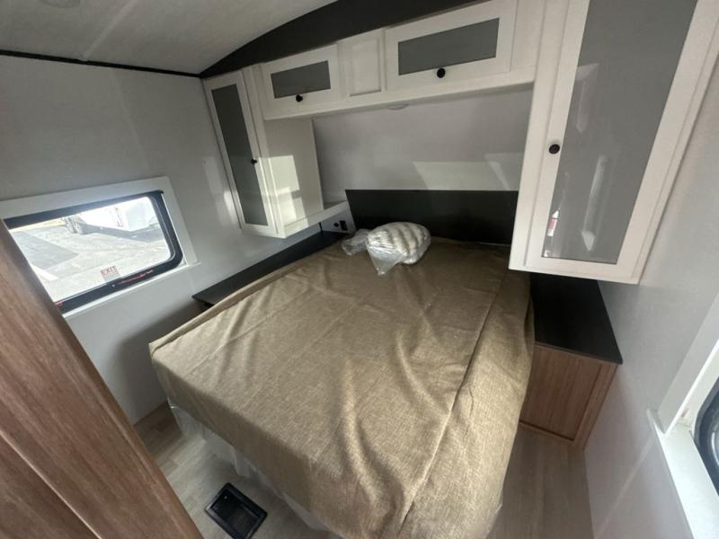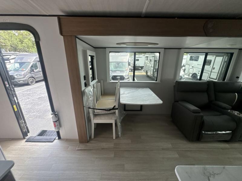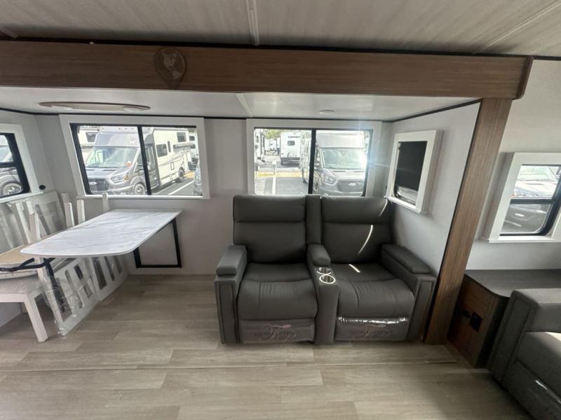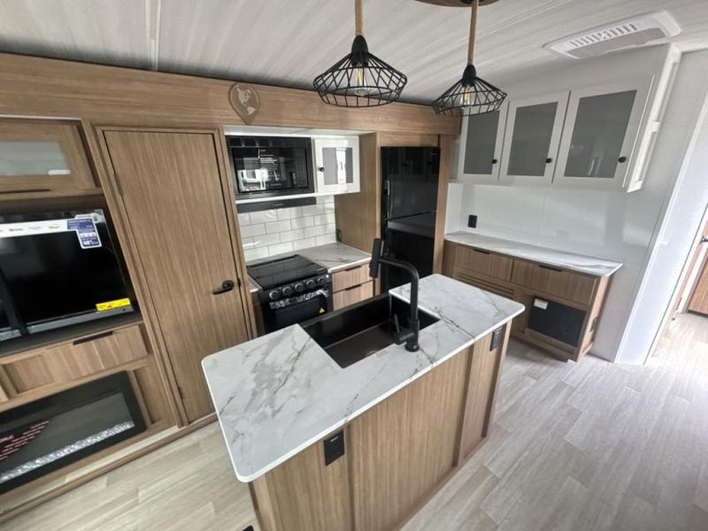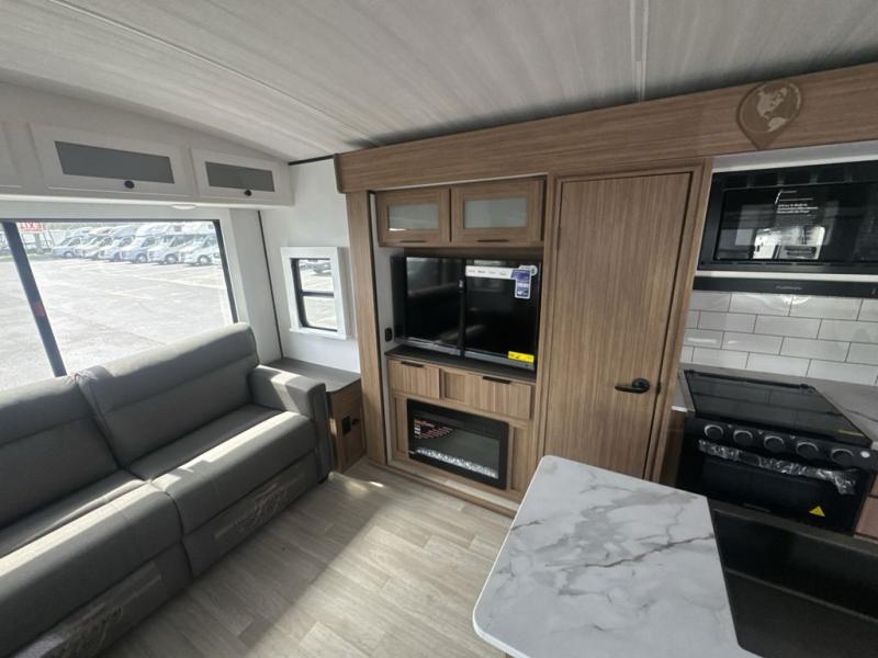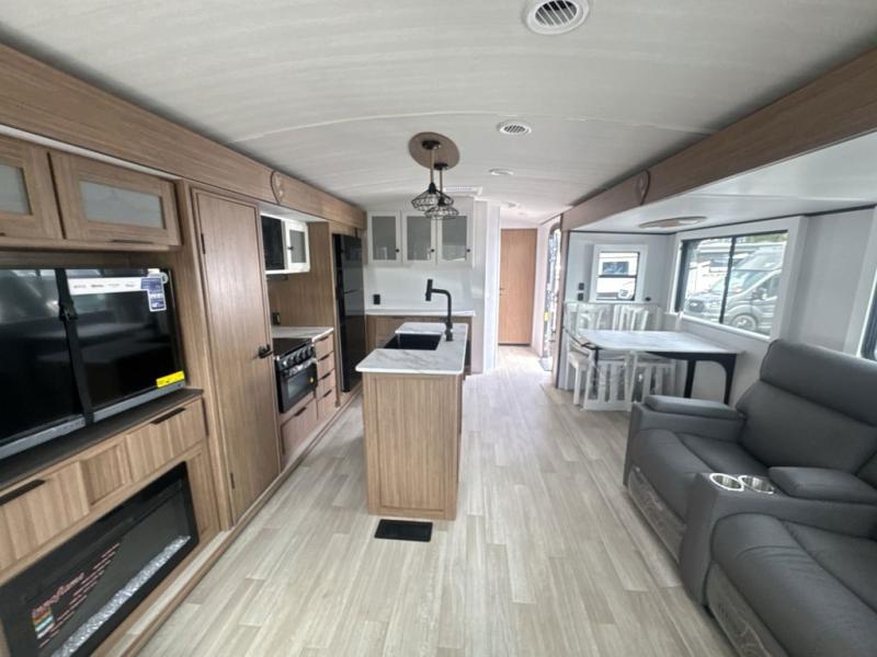 This is the travel trailer you've been searching for with a spacious interior, a front private bedroom, and a kitchen island for more counter space! Your crew can relax on the tri-fold sofa sleeper and luxury cinema theater seating, or play a game at the do-more dinette table. There is also an entertainment center and a fireplace to make this space feel more like home. A full kitchen, complete with a large pantry and 12V refrigerator will keep the chef of your group happy, and the full bath will let everyone clean up before bed. When it's time to call it a night, the front bedroom with a queen bed will be waiting for you, while your guests sleep on the sofa and dinette.