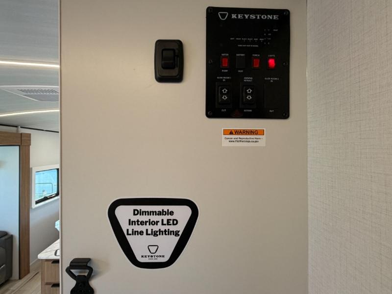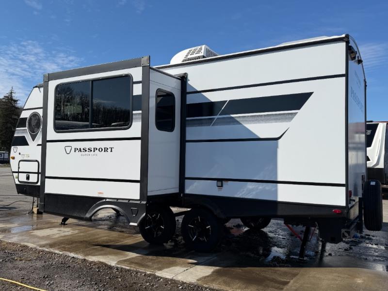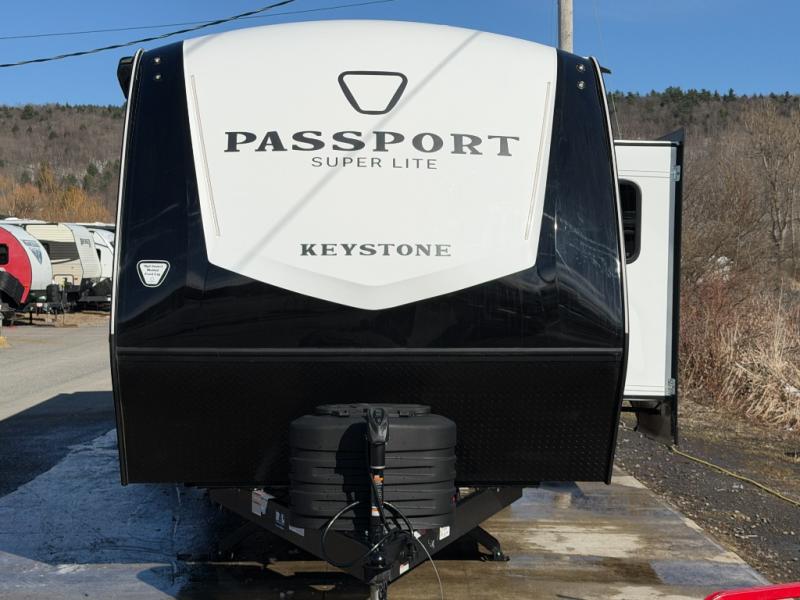 With any Keystone Passport Super Lite travel trailer you will enjoy lightweight towing and lots of interior comforts! The power tongue jack lets you hitch up at the drop of a hat, and the Dexter torsion axle rubber ride suspension will make towing easier than ever. You will appreciate having 4-point power stabilizer jacks for quick setup and an exterior convenience center to monitor tank levels. These trailers feature 5-sided aluminum construction, new premium aluminum wheels, a heated and enclosed underbelly, plus new composite solid entry steps. Inside, you'll enjoy seamless kitchen countertops, interior lights with a dimmer, a rainfall showerhead, and premium pull-down roller shades for added privacy.