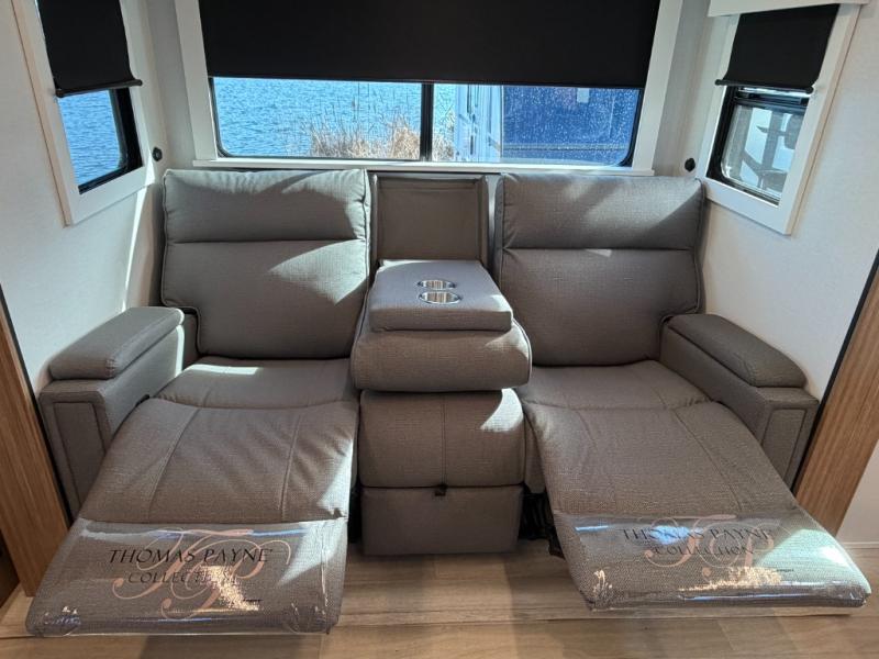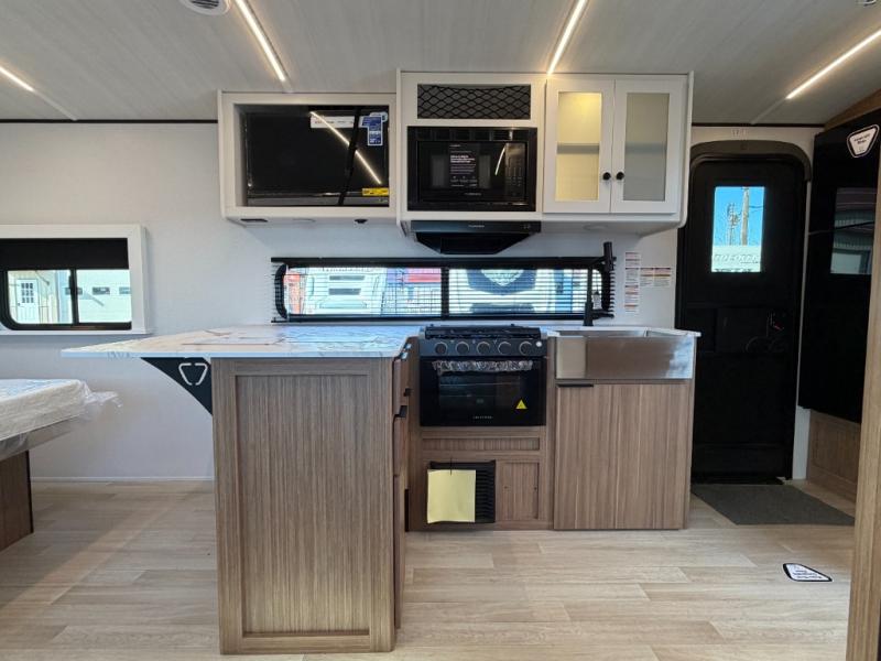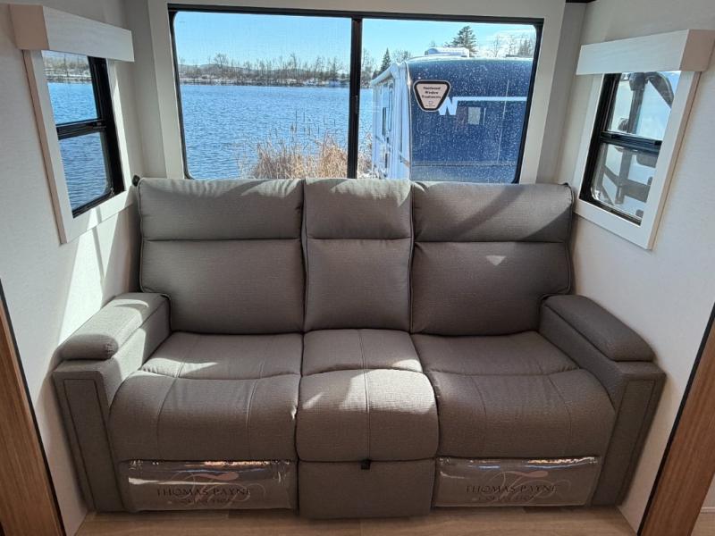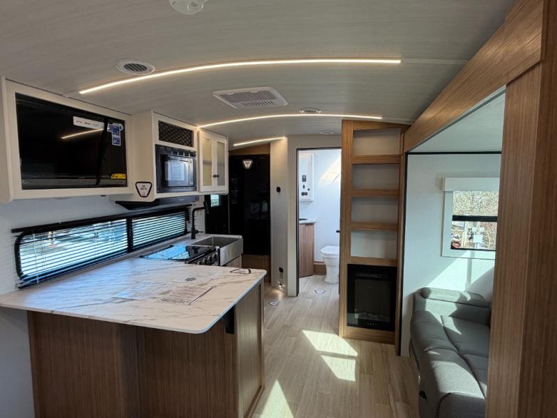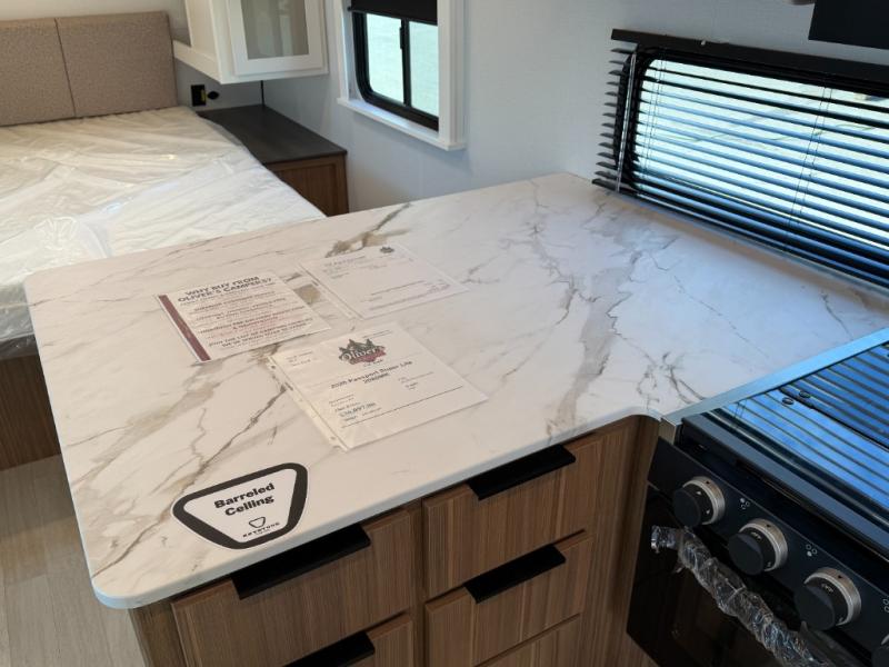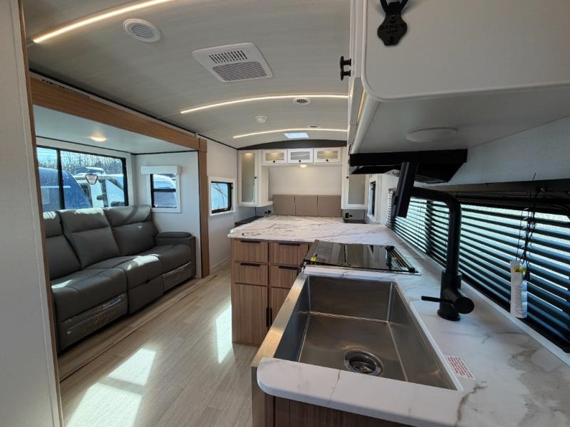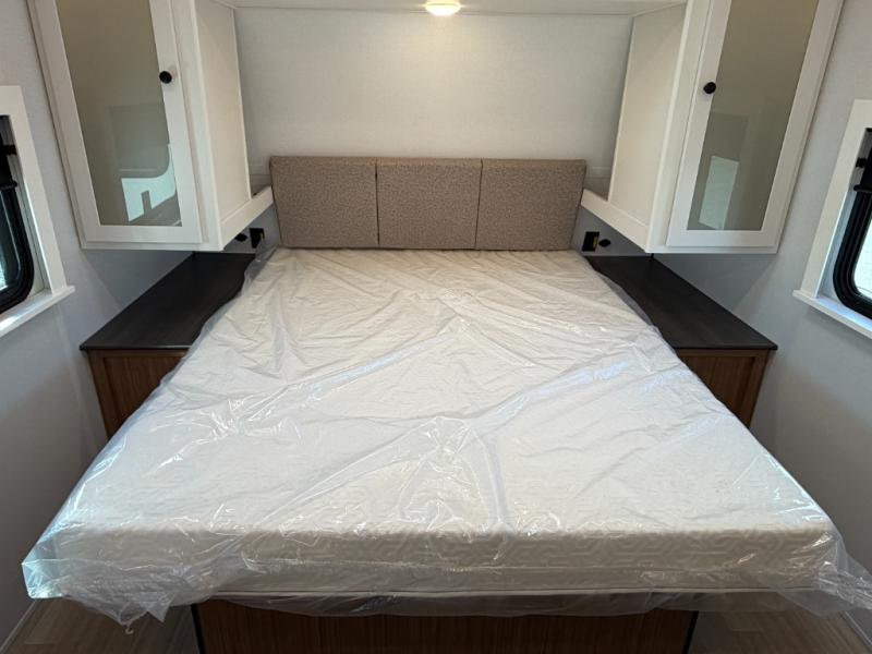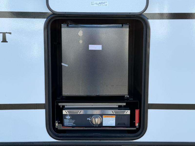 Camping trips are made complete in this spacious travel trailer for two happy campers. There is a front queen bed with dual bedside wardrobes to keep your things tidy, and you can easily clean up in the rear corner full bath before starting your day. The cooktop inside will let you make breakfast, or you can head outdoors to use the exterior griddle and small refrigerator. Back inside, there is a bar top with two stools for seating space, along with luxury style cinema theater seating within the slide out. This unit also includes a hidden pocket pantry in the kitchen, along with a second pantry, storage cubbies, and an exterior pass-thru storage so nothing gets left behind!