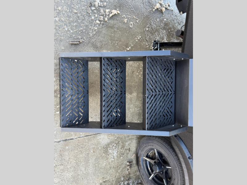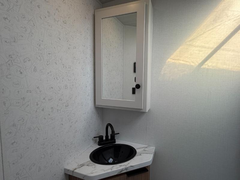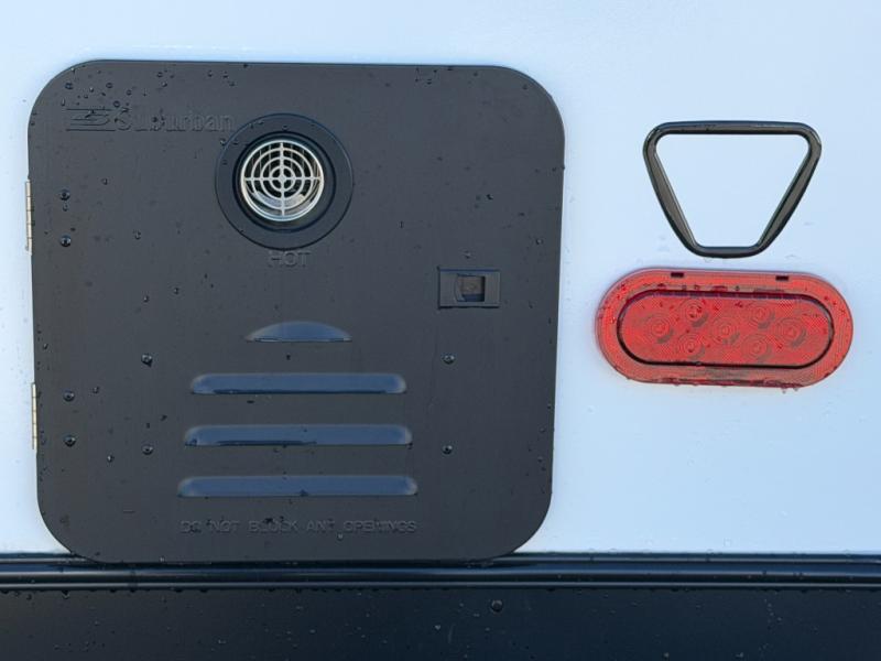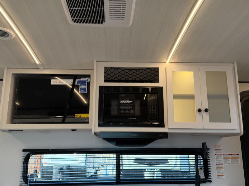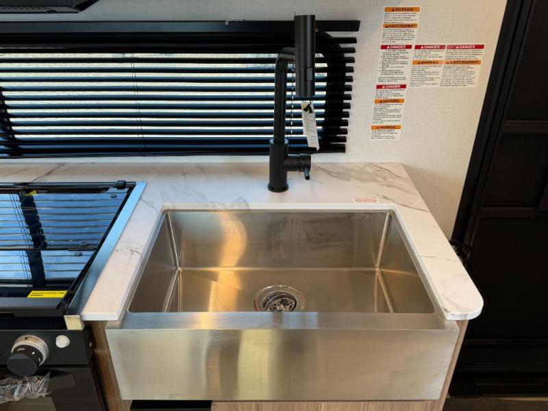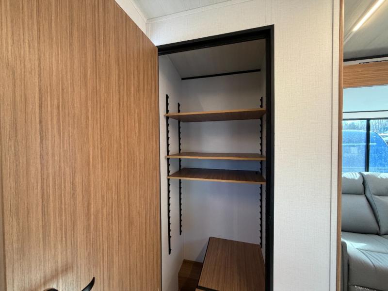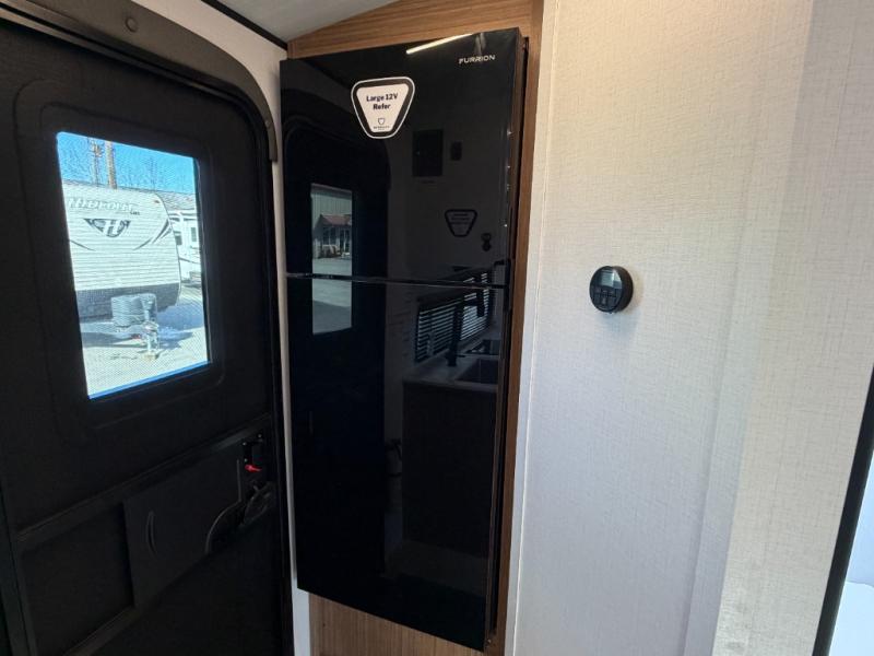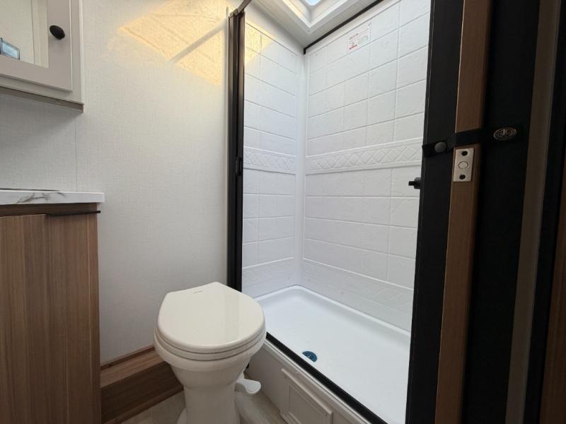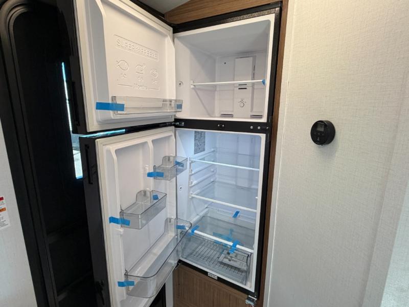 Camping trips are made complete in this spacious travel trailer for two happy campers. There is a front queen bed with dual bedside wardrobes to keep your things tidy, and you can easily clean up in the rear corner full bath before starting your day. The cooktop inside will let you make breakfast, or you can head outdoors to use the exterior griddle and small refrigerator. Back inside, there is a bar top with two stools for seating space, along with luxury style cinema theater seating within the slide out. This unit also includes a hidden pocket pantry in the kitchen, along with a second pantry, storage cubbies, and an exterior pass-thru storage so nothing gets left behind!