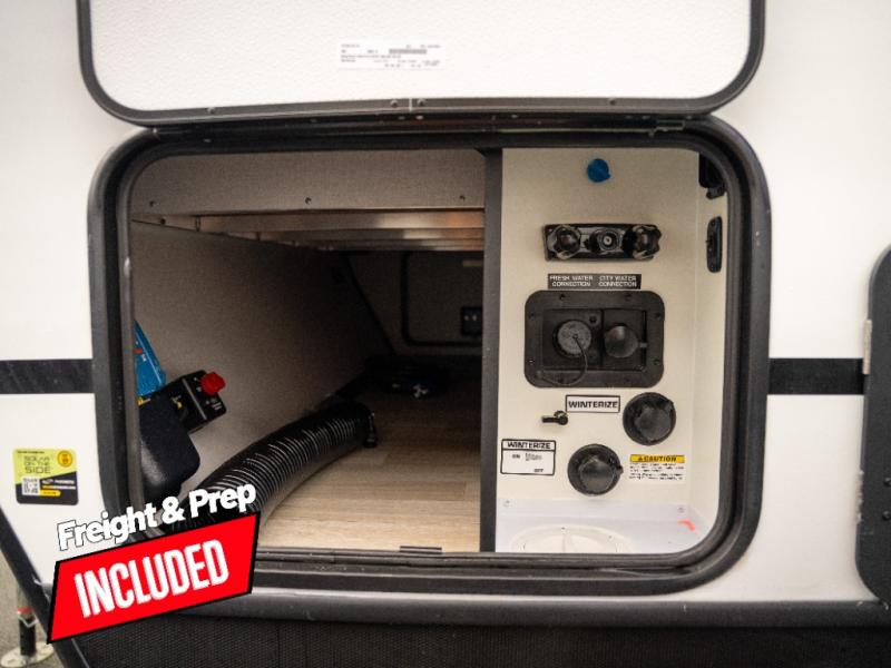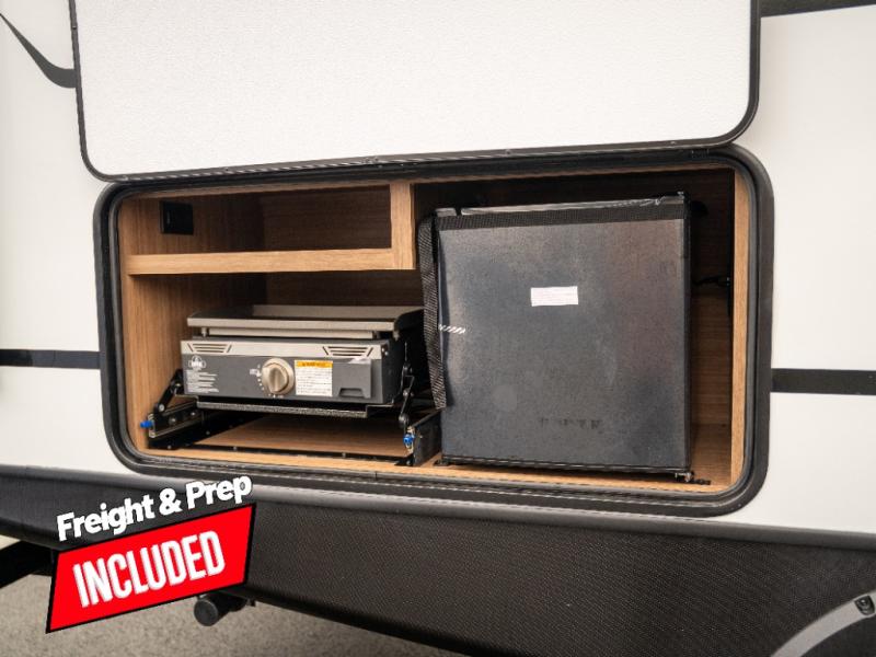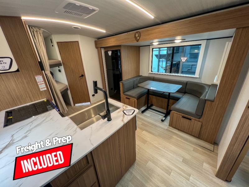 This spacious and versatile travel trailer will be perfect for your crew of seven! When the front Murphy bed is put up, you can relax on the jack knife sofa. There is a full kitchen inside, complete with a 12V refrigerator and bar top with stools, plus you'll find an outdoor kitchen to cook in the fresh air! Back inside, the booth dinette within the slide provides a place to dine together, play board games, and even let a guest sleep on if the double-size bunks are full. An exterior bike door under the bunks will let you easily store extra camp gear, plus there is a pass-thru storage for fishing poles and more!
