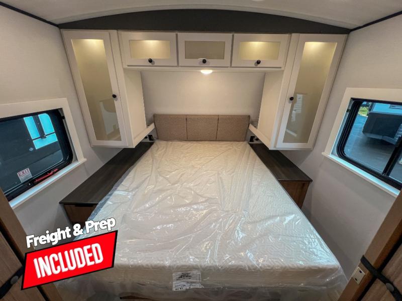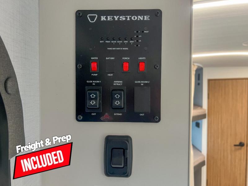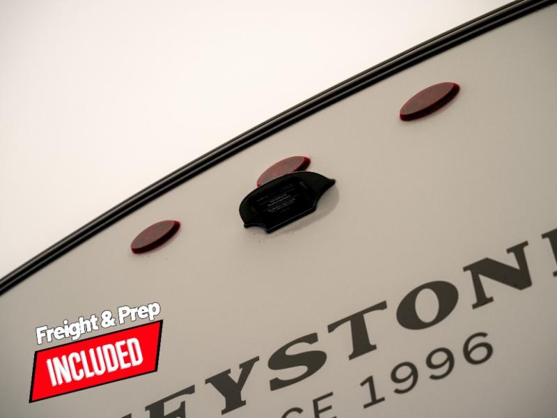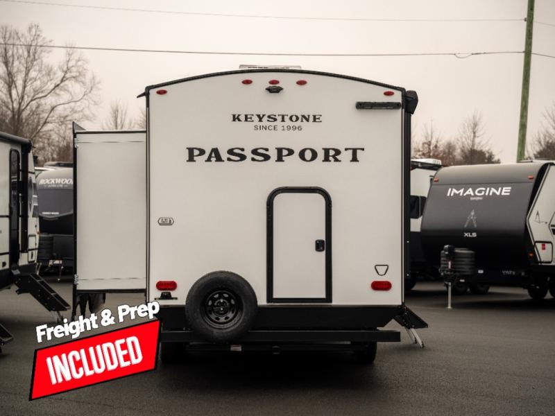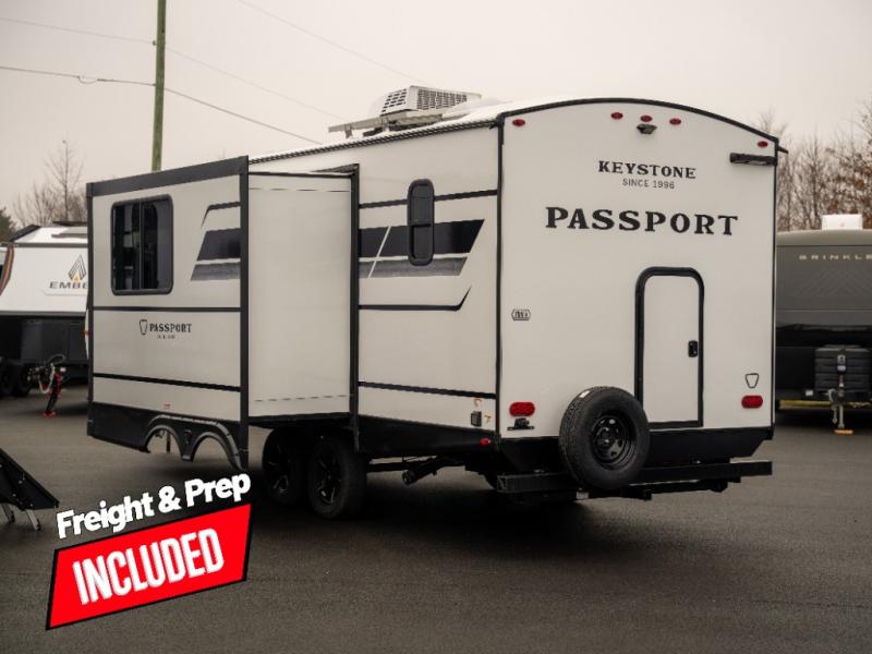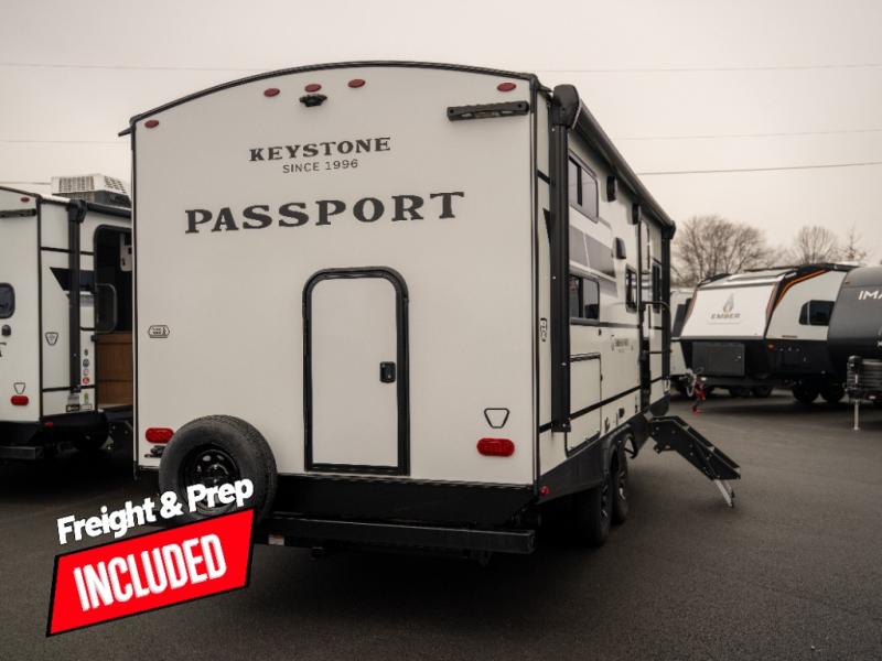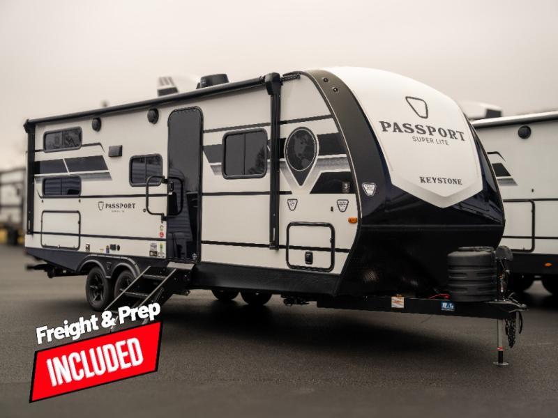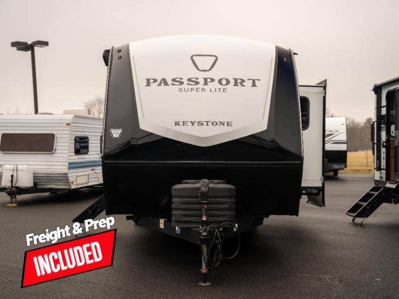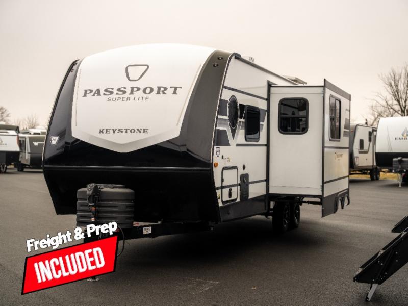 With any Keystone Passport Super Lite travel trailer you will enjoy lightweight towing and lots of interior comforts! The power tongue jack lets you hitch up at the drop of a hat, and the Dexter torsion axle rubber ride suspension will make towing easier than ever. You will appreciate having 4-point power stabilizer jacks for quick setup and an exterior convenience center to monitor tank levels. These trailers feature 5-sided aluminum construction, new premium aluminum wheels, a heated and enclosed underbelly, plus new composite solid entry steps. Inside, you'll enjoy seamless kitchen countertops, interior lights with a dimmer, a rainfall showerhead, and premium pull-down roller shades for added privacy.