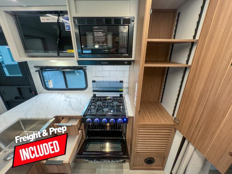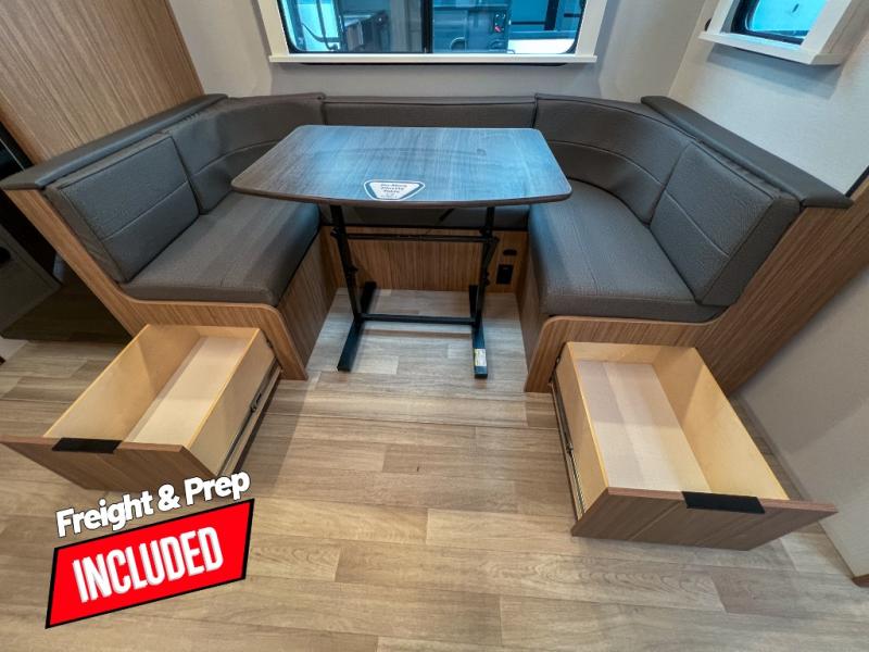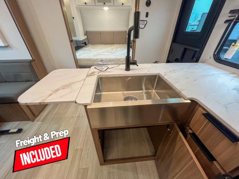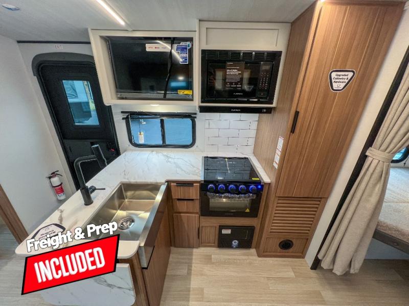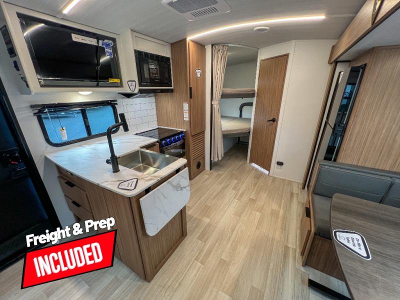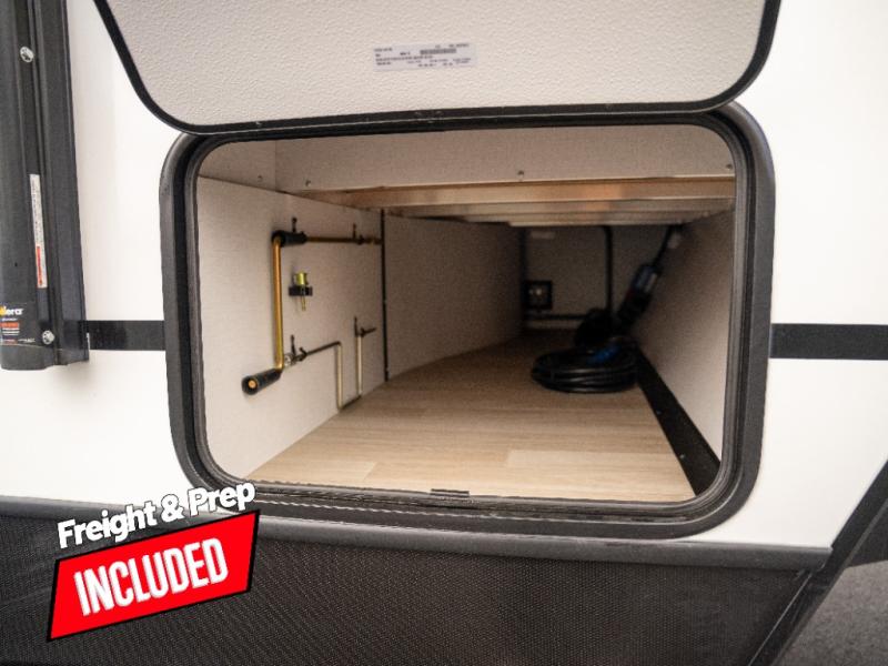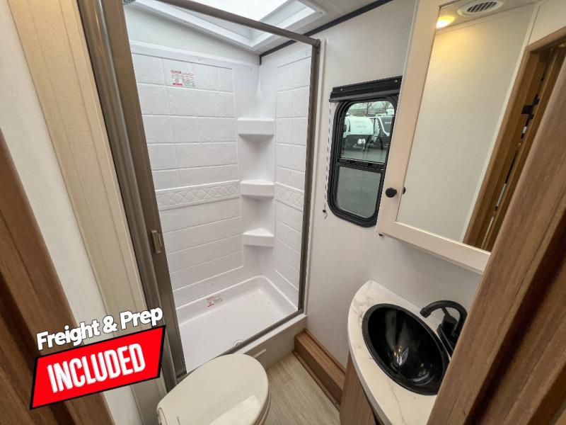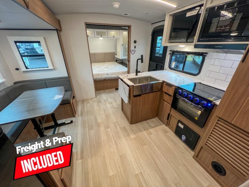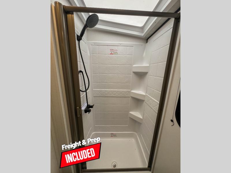 With any Keystone Passport Super Lite travel trailer you will enjoy lightweight towing and lots of interior comforts! The power tongue jack lets you hitch up at the drop of a hat, and the Dexter torsion axle rubber ride suspension will make towing easier than ever. You will appreciate having 4-point power stabilizer jacks for quick setup and an exterior convenience center to monitor tank levels. These trailers feature 5-sided aluminum construction, new premium aluminum wheels, a heated and enclosed underbelly, plus new composite solid entry steps. Inside, you'll enjoy seamless kitchen countertops, interior lights with a dimmer, a rainfall showerhead, and premium pull-down roller shades for added privacy.