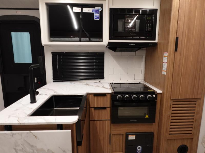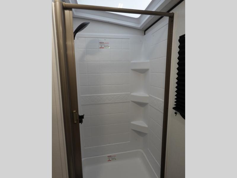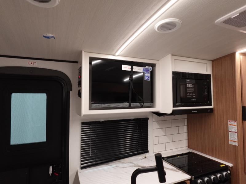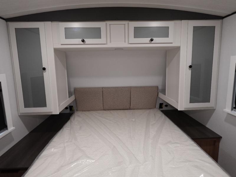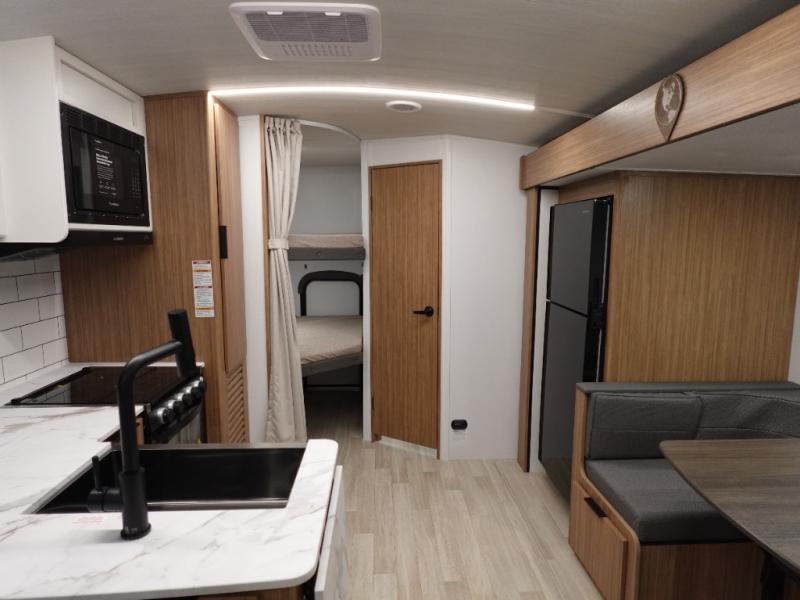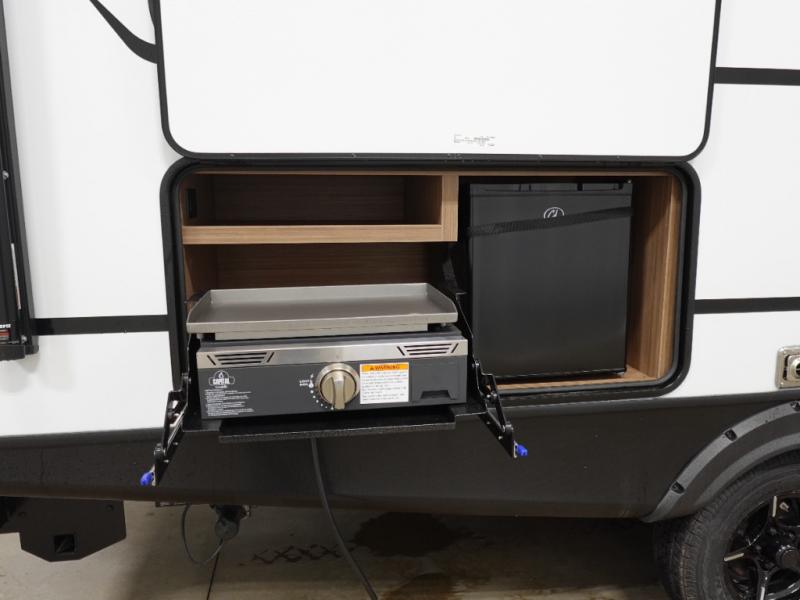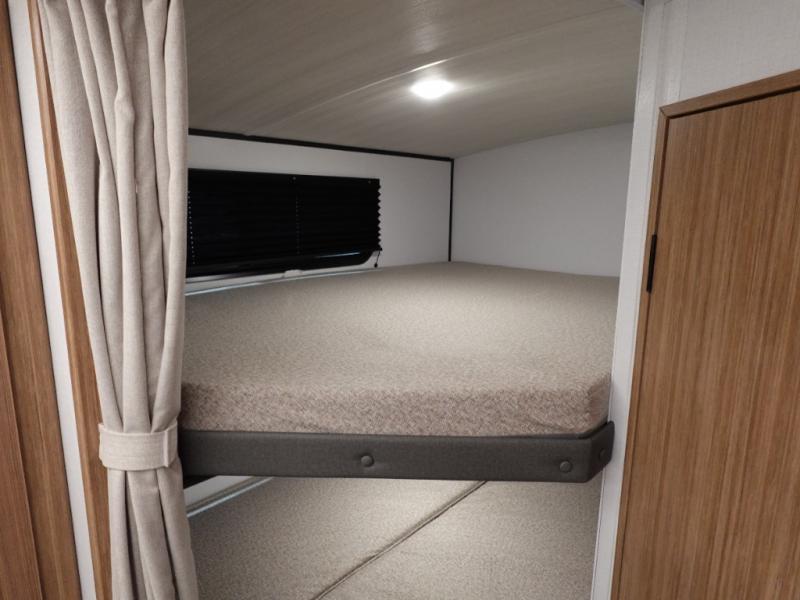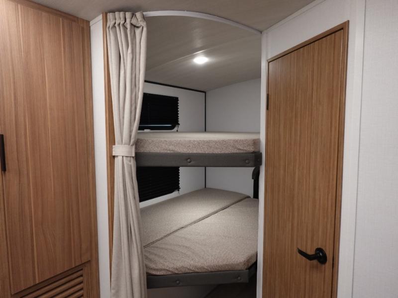 Trips to the lake with a larger group are made easy in this spacious travel trailer! The double-size bunks include a flip-up bunk for added storage, and there is a rear cargo door here so you can easily load gear from outside. The full bath is conveniently located right by the bunks for easy nighttime use, and the pantry is also close by if anyone needs a midnight snack! You will sleep like a baby in the front bedroom that includes a queen bed and dual wardrobes to keep your clothes tidy. In the morning, everyone can meet in the combined living area and kitchen while the chef makes breakfast on the three burner cooktop, and there is a U-shaped do-more dinette table to dine at. If the weather is nice, the chef just may want to cook on the outside kitchen with a griddle, and everyone can sit at the picnic table under the 15' awning!