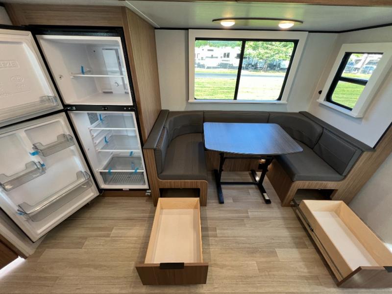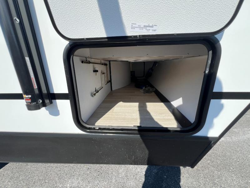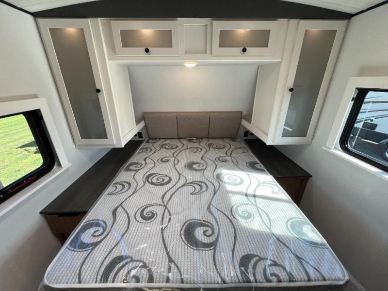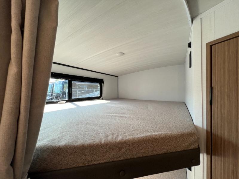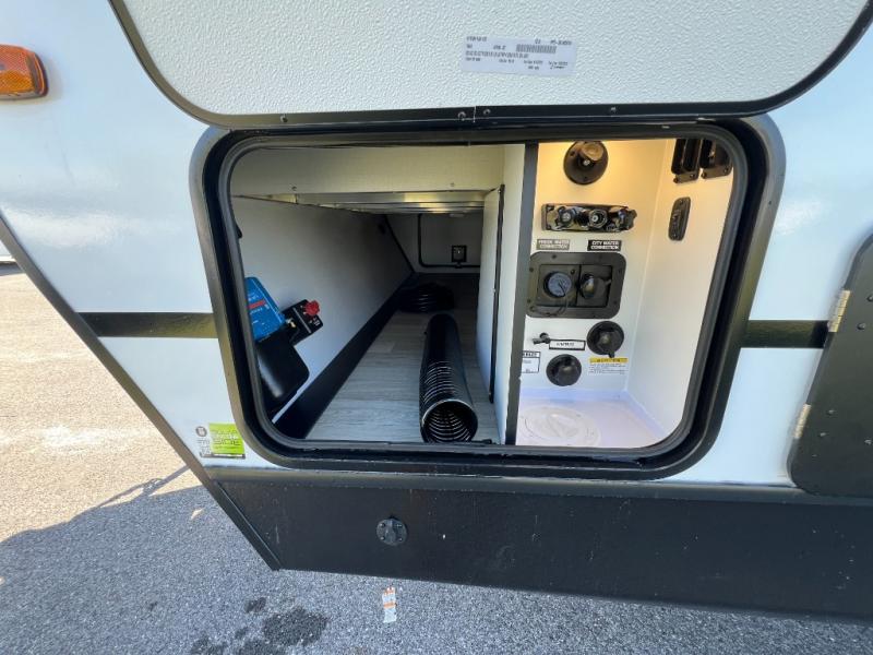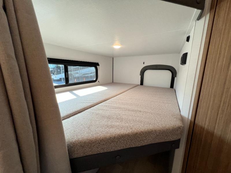 Trips to the lake with a larger group are made easy in this spacious travel trailer! The double-size bunks include a flip-up bunk for added storage, and there is a rear cargo door here so you can easily load gear from outside. The full bath is conveniently located right by the bunks for easy nighttime use, and the pantry is also close by if anyone needs a midnight snack! You will sleep like a baby in the front bedroom that includes a queen bed and dual wardrobes to keep your clothes tidy. In the morning, everyone can meet in the combined living area and kitchen while the chef makes breakfast on the three burner cooktop, and there is a U-shaped do-more dinette table to dine at. If the weather is nice, the chef just may want to cook on the outside kitchen with a griddle, and everyone can sit at the picnic table under the 15' awning!