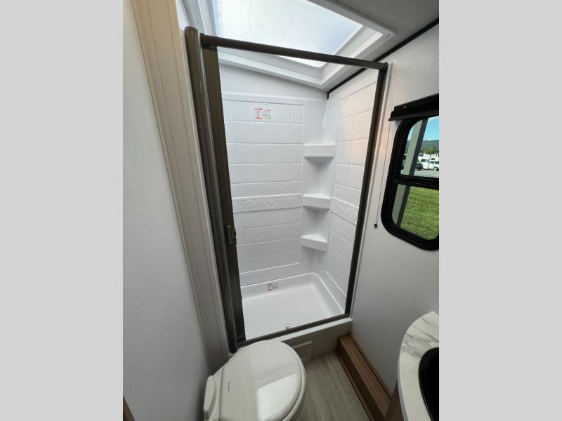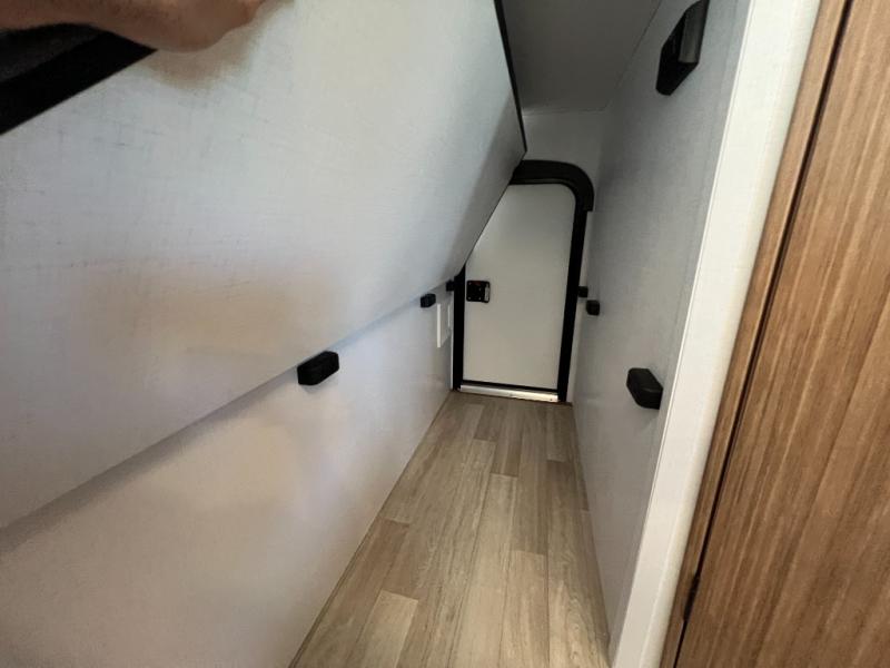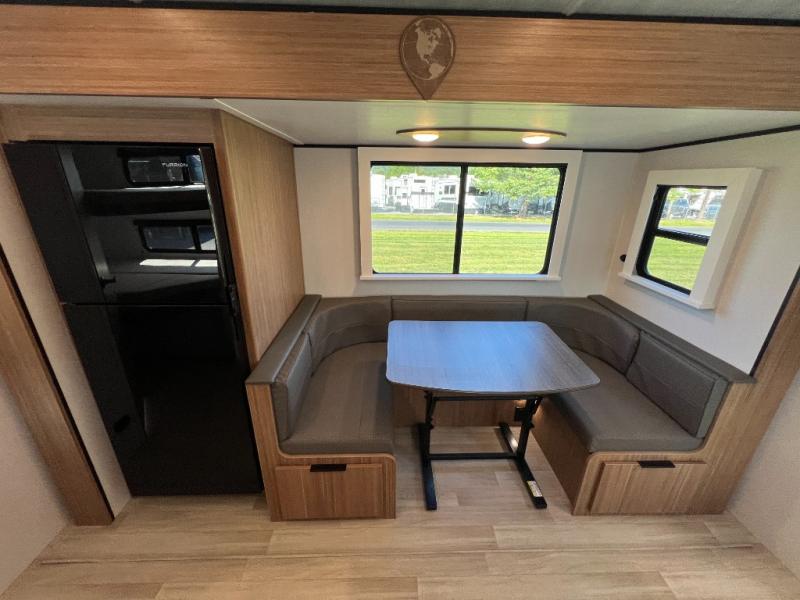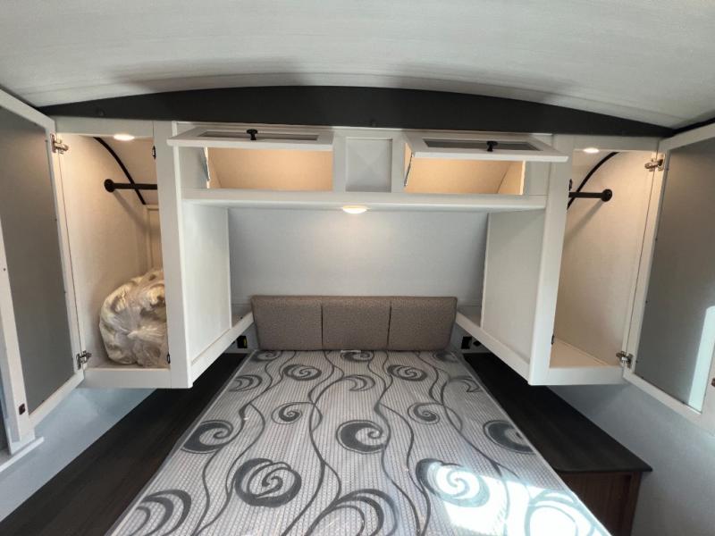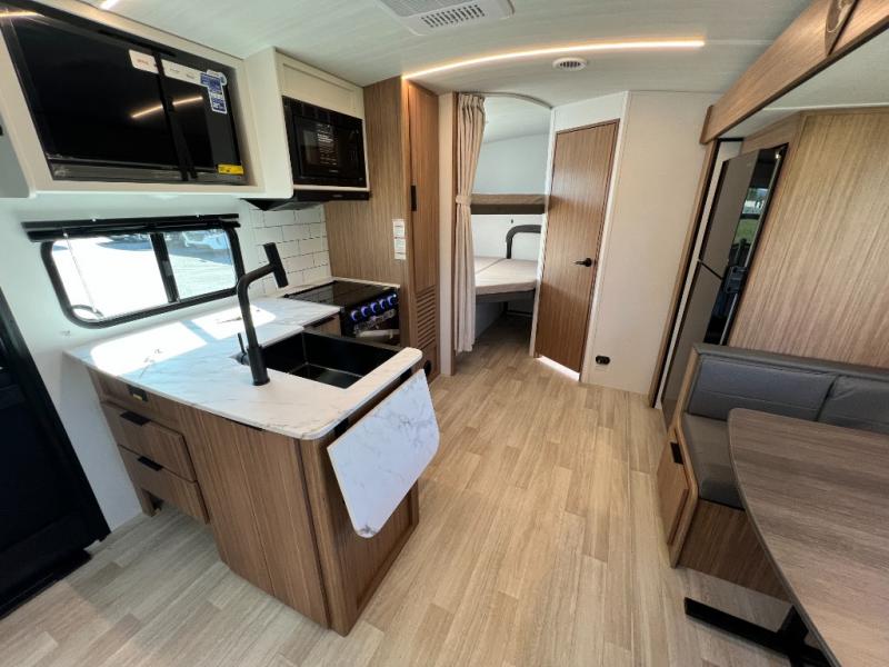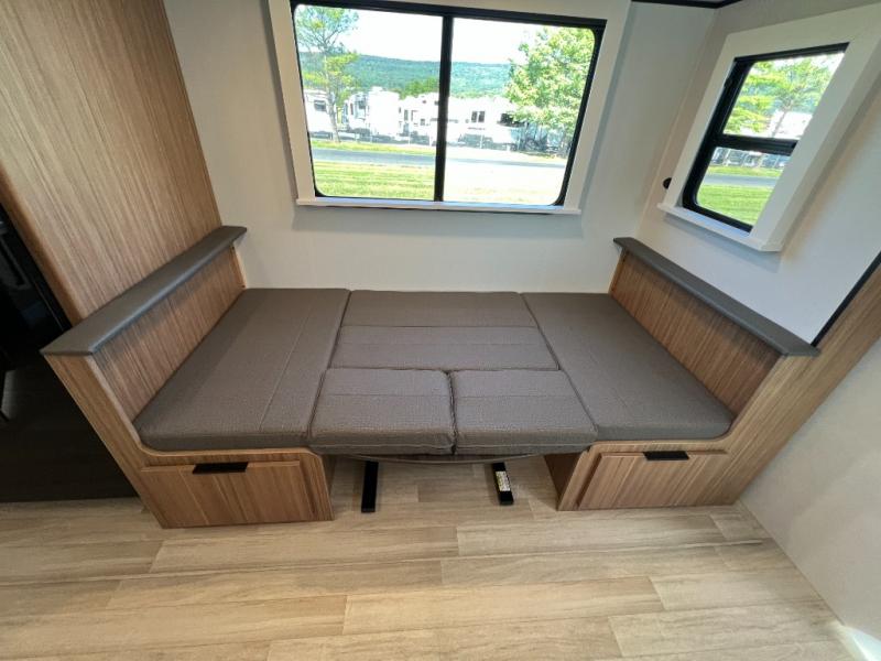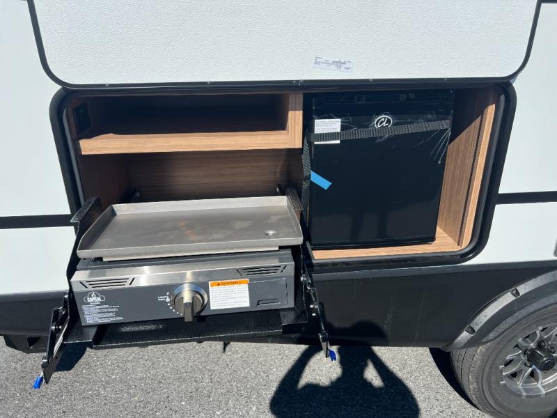Trips to the lake with a larger group are made easy in this spacious travel trailer! The double-size bunks include a flip-up bunk for added storage, and there is a rear cargo door here so you can easily load gear from outside. The full bath is conveniently located right by the bunks for easy nighttime use, and the pantry is also close by if anyone needs a midnight snack! You will sleep like a baby in the front bedroom that includes a queen bed and dual wardrobes to keep your clothes tidy. In the morning, everyone can meet in the combined living area and kitchen while the chef makes breakfast on the three burner cooktop, and there is a U-shaped do-more dinette table to dine at. If the weather is nice, the chef just may want to cook on the outside kitchen with a griddle, and everyone can sit at the picnic table under the 15' awning!