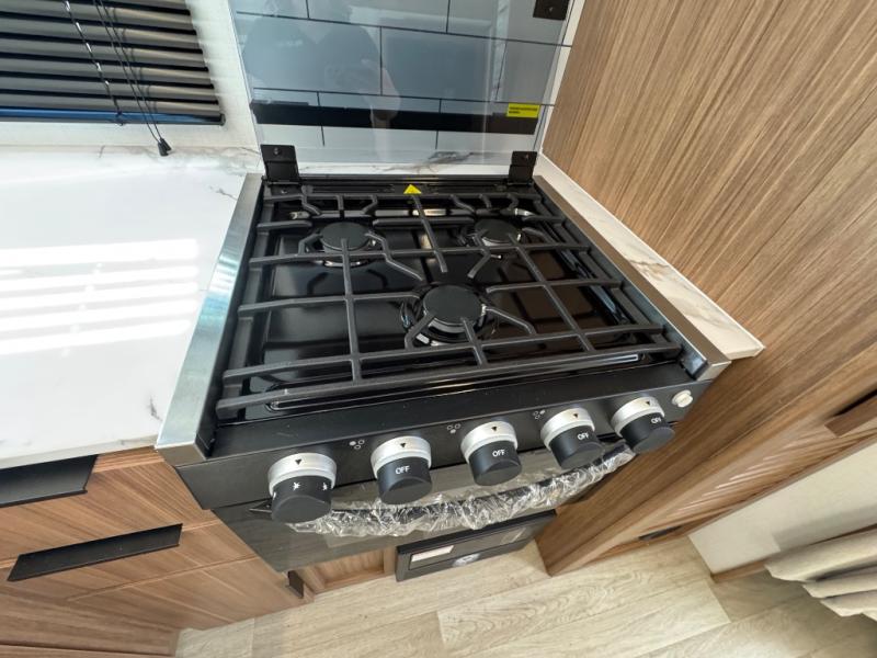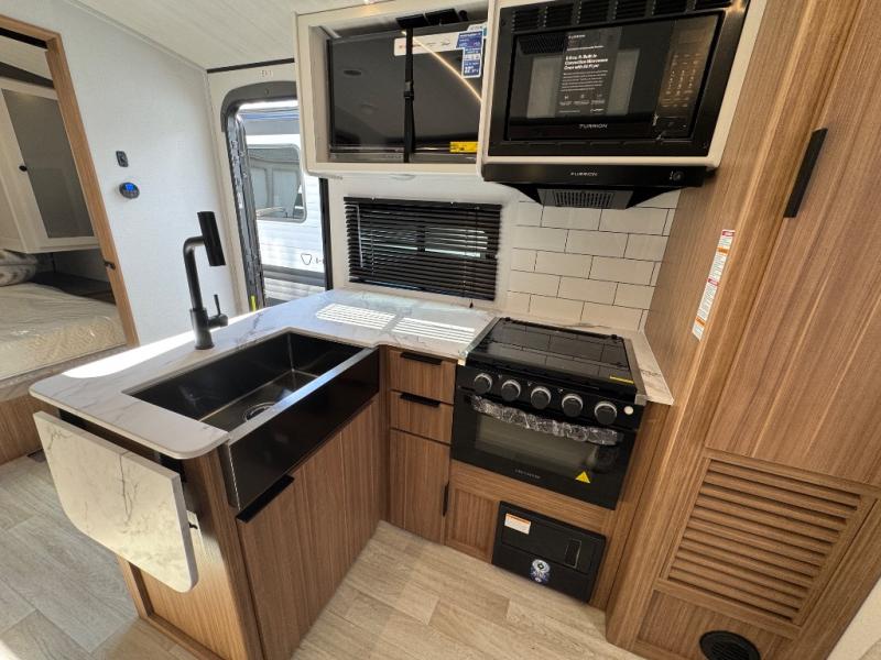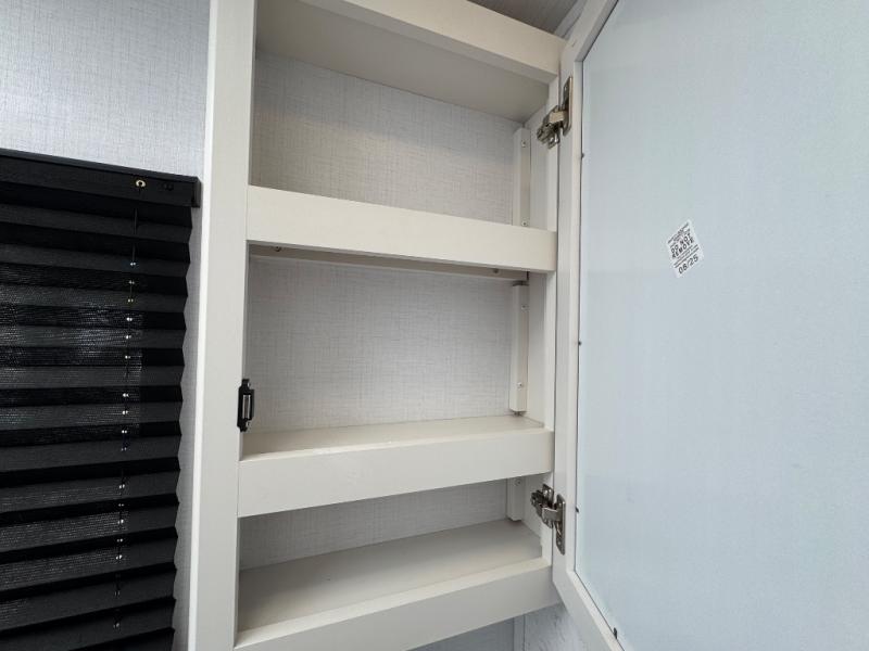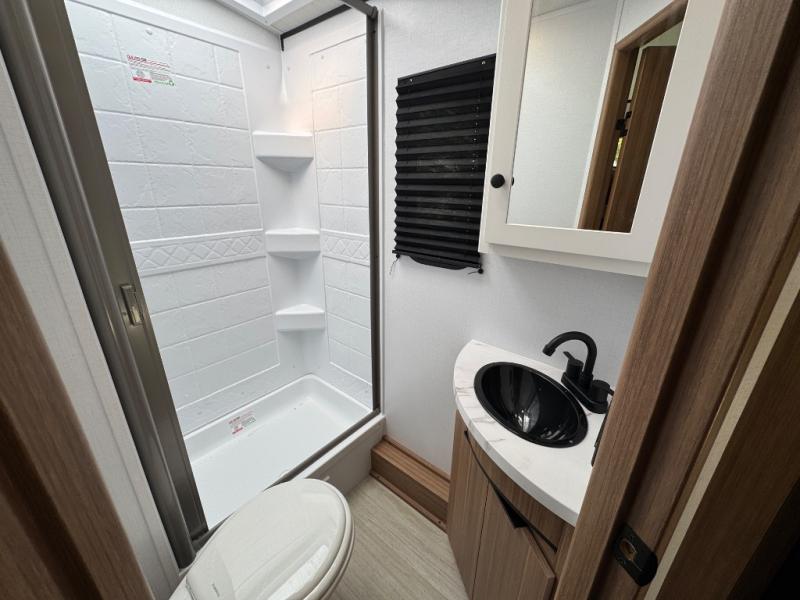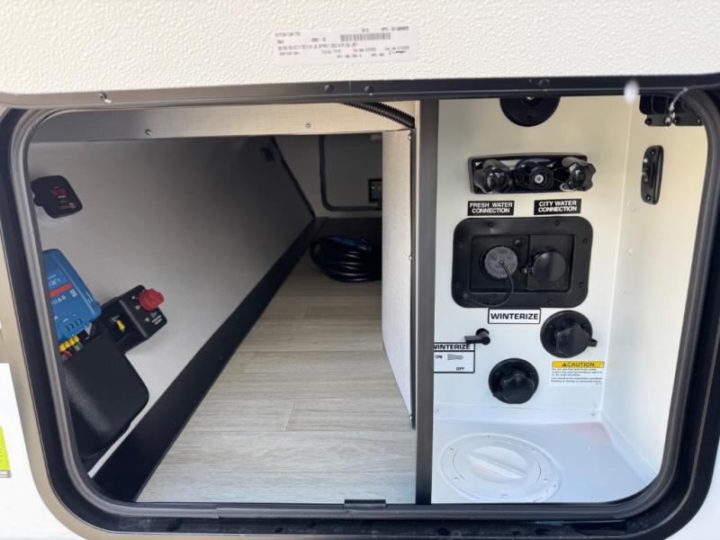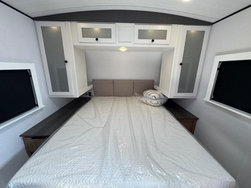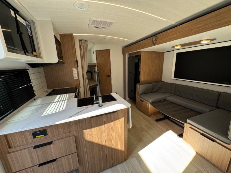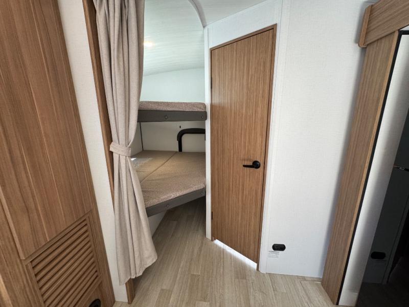 Trips to the lake with a larger group are made easy in this spacious travel trailer! The double-size bunks include a flip-up bunk for added storage, and there is a rear cargo door here so you can easily load gear from outside. The full bath is conveniently located right by the bunks for easy nighttime use, and the pantry is also close by if anyone needs a midnight snack! You will sleep like a baby in the front bedroom that includes a queen bed and dual wardrobes to keep your clothes tidy. In the morning, everyone can meet in the combined living area and kitchen while the chef makes breakfast on the three burner cooktop, and there is a U-shaped do-more dinette table to dine at. If the weather is nice, the chef just may want to cook on the outside kitchen with a griddle, and everyone can sit at the picnic table under the 15' awning!