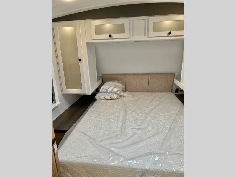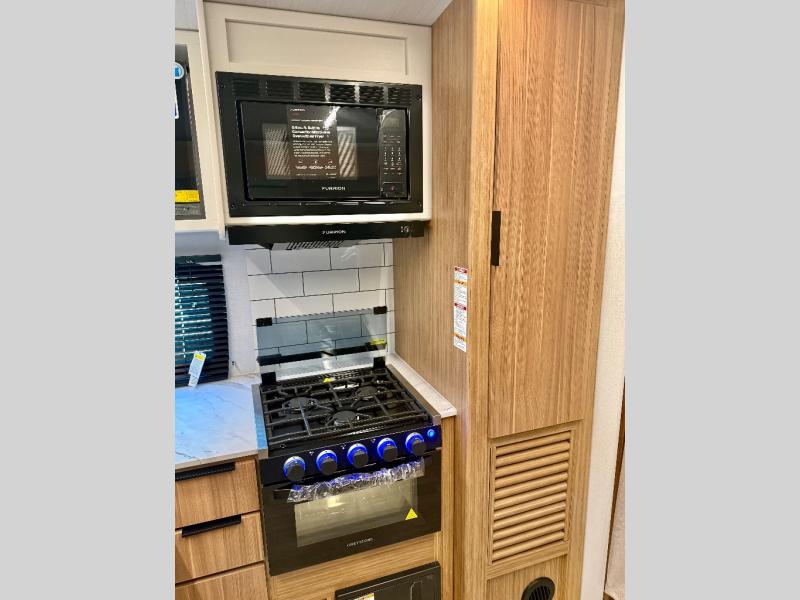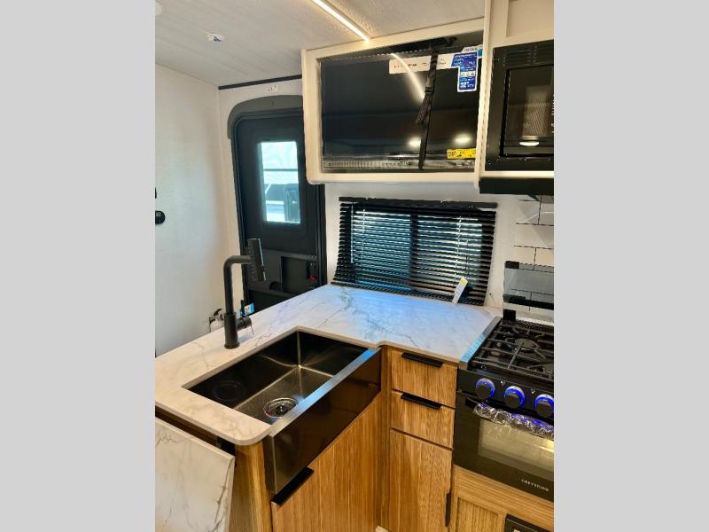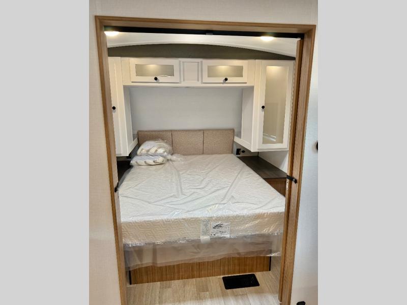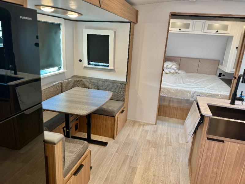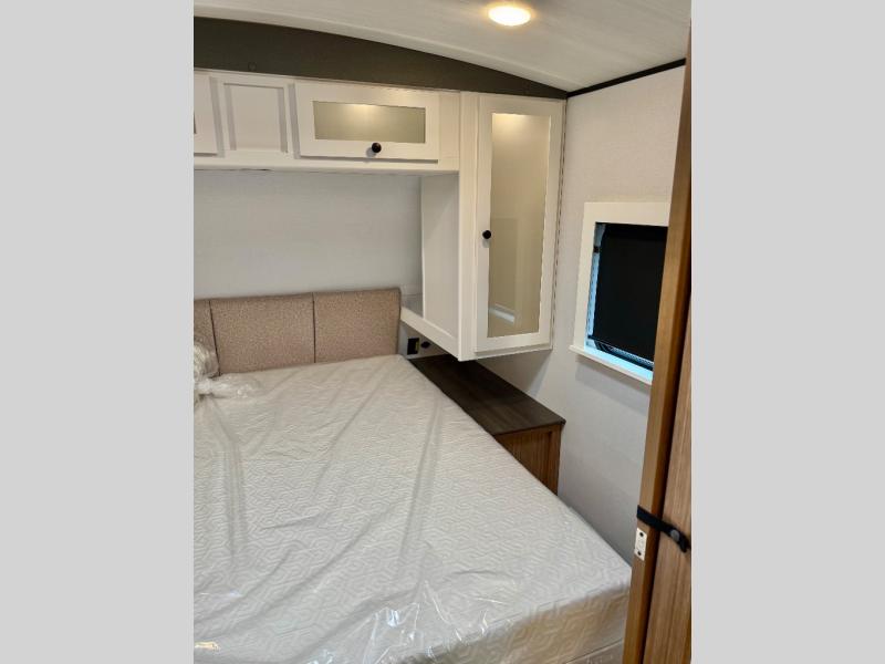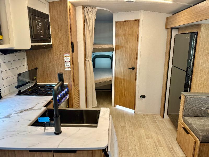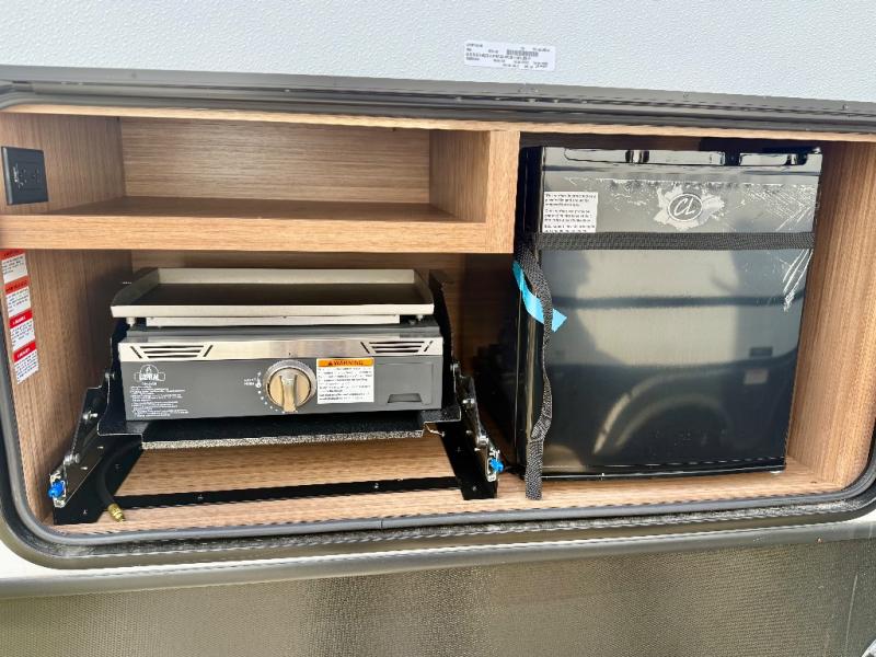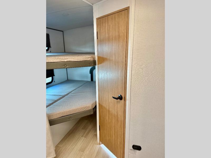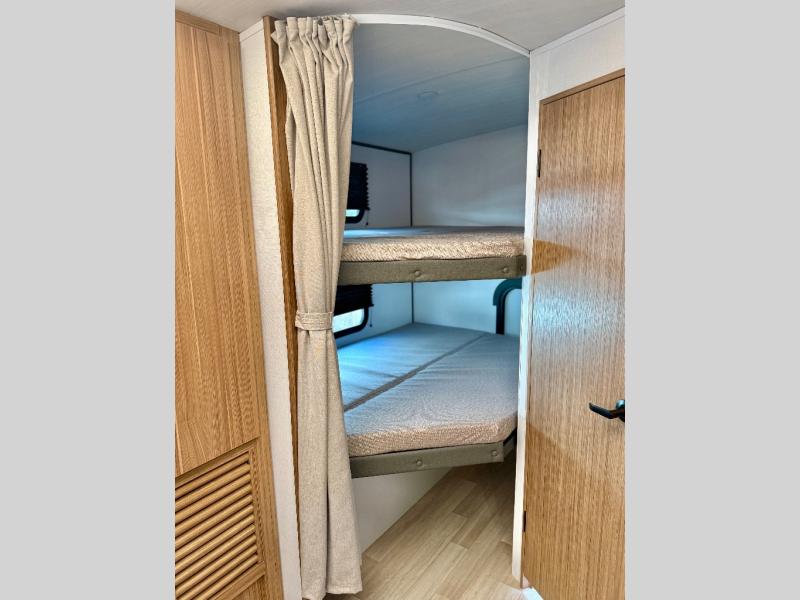 Trips to the lake with a larger group are made easy in this spacious travel trailer! The double-size bunks include a flip-up bunk for added storage, and there is a rear cargo door here so you can easily load gear from outside. The full bath is conveniently located right by the bunks for easy nighttime use, and the pantry is also close by if anyone needs a midnight snack! You will sleep like a baby in the front bedroom that includes a queen bed and dual wardrobes to keep your clothes tidy. In the morning, everyone can meet in the combined living area and kitchen while the chef makes breakfast on the three burner cooktop, and there is a U-shaped do-more dinette table to dine at. If the weather is nice, the chef just may want to cook on the outside kitchen with a griddle, and everyone can sit at the picnic table under the 15' awning!