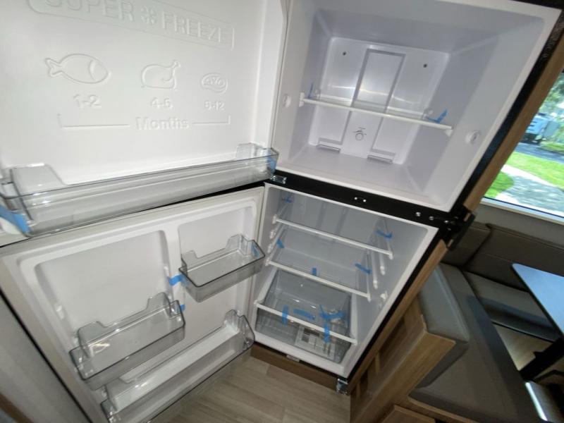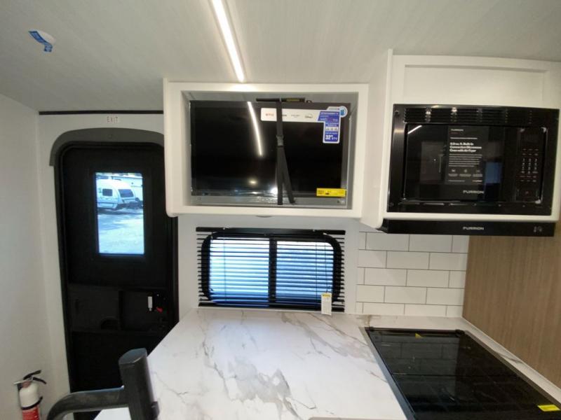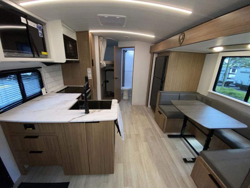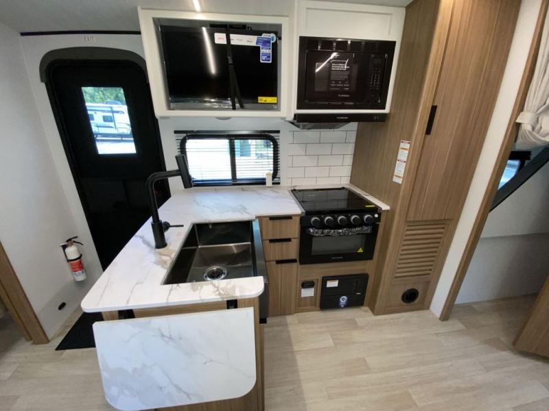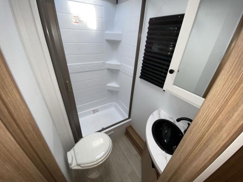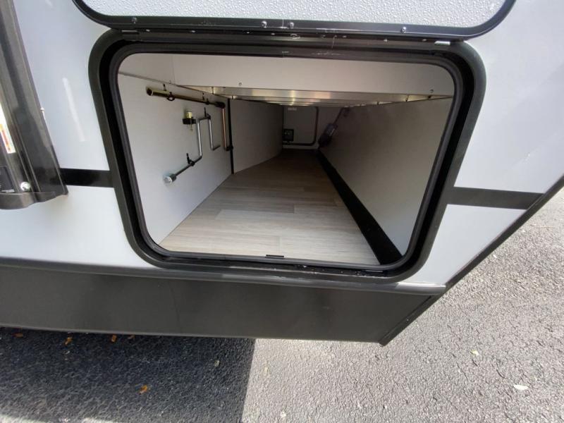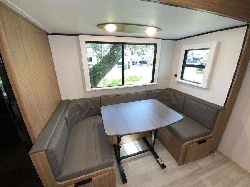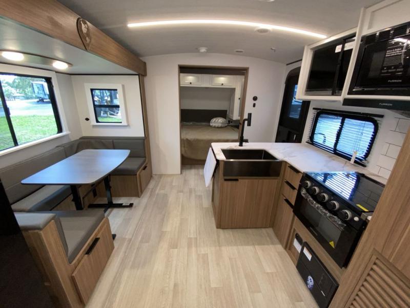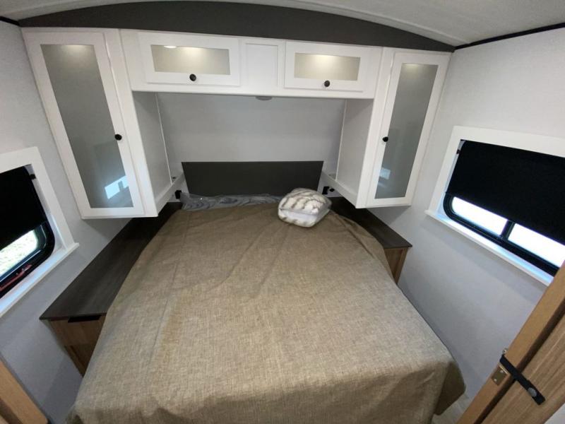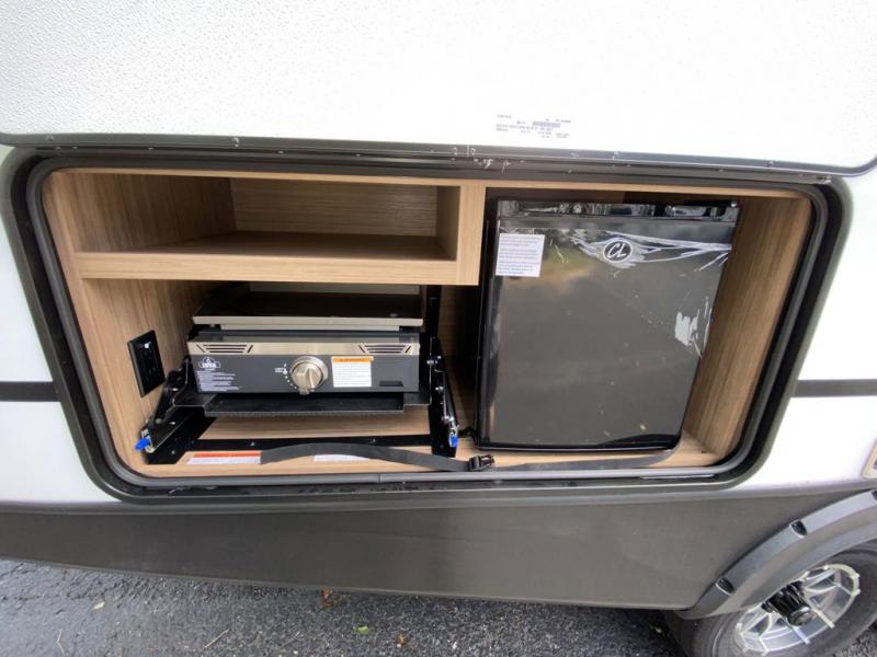 Trips to the lake with a larger group are made easy in this spacious travel trailer! The double-size bunks include a flip-up bunk for added storage, and there is a rear cargo door here so you can easily load gear from outside. The full bath is conveniently located right by the bunks for easy nighttime use, and the pantry is also close by if anyone needs a midnight snack! You will sleep like a baby in the front bedroom that includes a queen bed and dual wardrobes to keep your clothes tidy. In the morning, everyone can meet in the combined living area and kitchen while the chef makes breakfast on the three burner cooktop, and there is a U-shaped do-more dinette table to dine at. If the weather is nice, the chef just may want to cook on the outside kitchen with a griddle, and everyone can sit at the picnic table under the 15' awning!