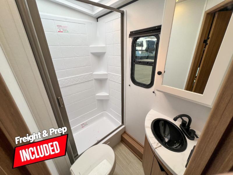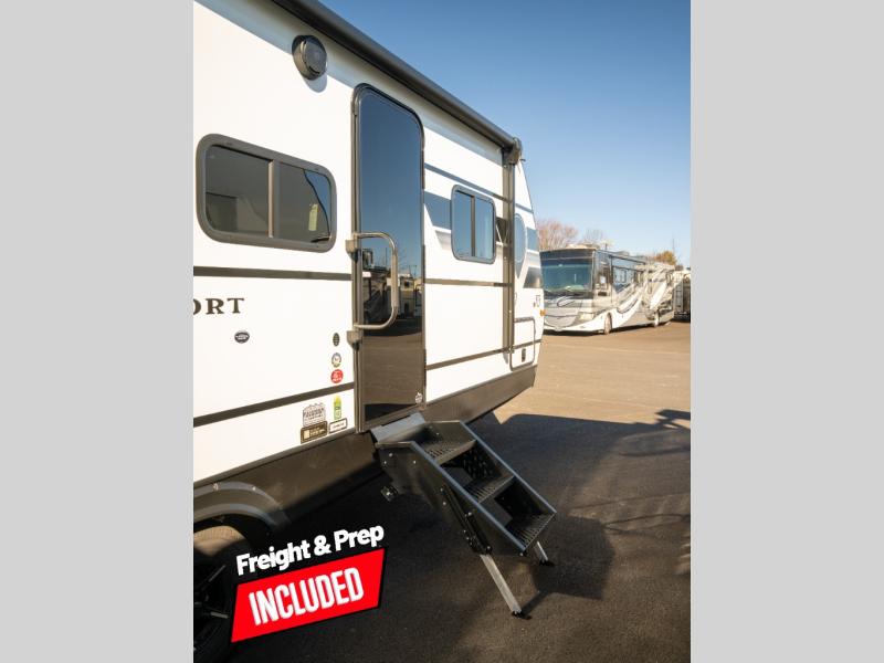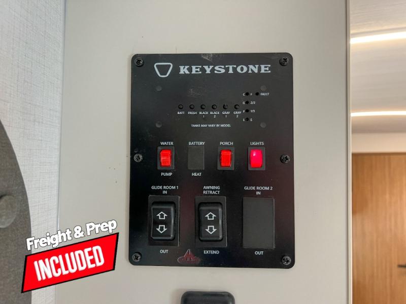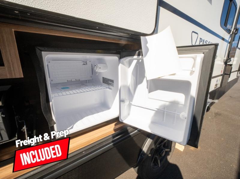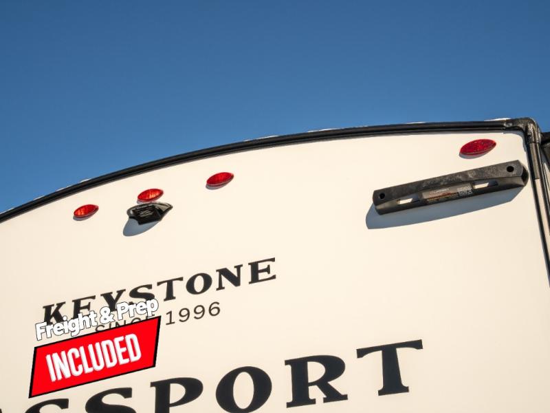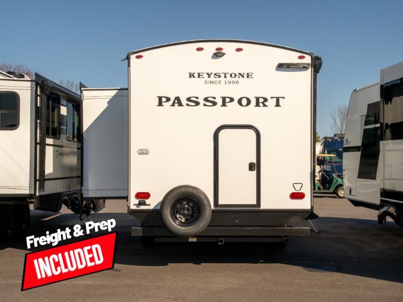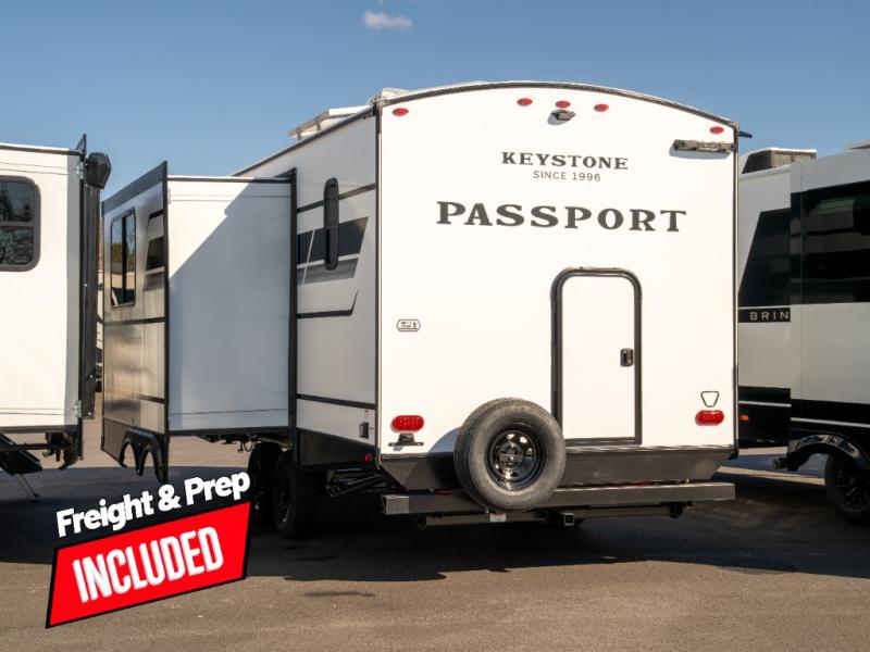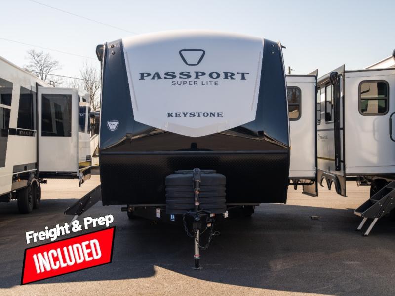 With any Keystone Passport Super Lite travel trailer you will enjoy lightweight towing and lots of interior comforts! The power tongue jack lets you hitch up at the drop of a hat, and the Dexter torsion axle rubber ride suspension will make towing easier than ever. You will appreciate having 4-point power stabilizer jacks for quick setup and an exterior convenience center to monitor tank levels. These trailers feature 5-sided aluminum construction, new premium aluminum wheels, a heated and enclosed underbelly, plus new composite solid entry steps. Inside, you'll enjoy seamless kitchen countertops, interior lights with a dimmer, a rainfall showerhead, and premium pull-down roller shades for added privacy.