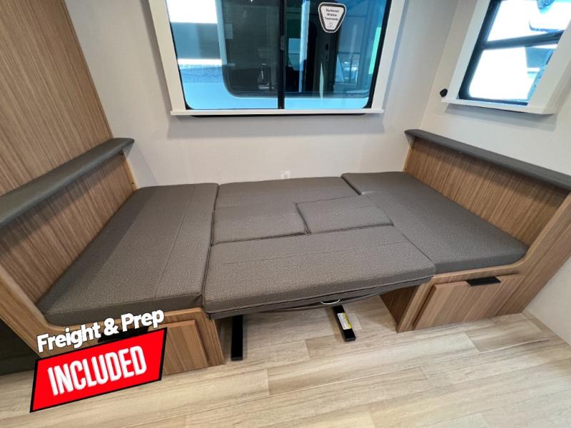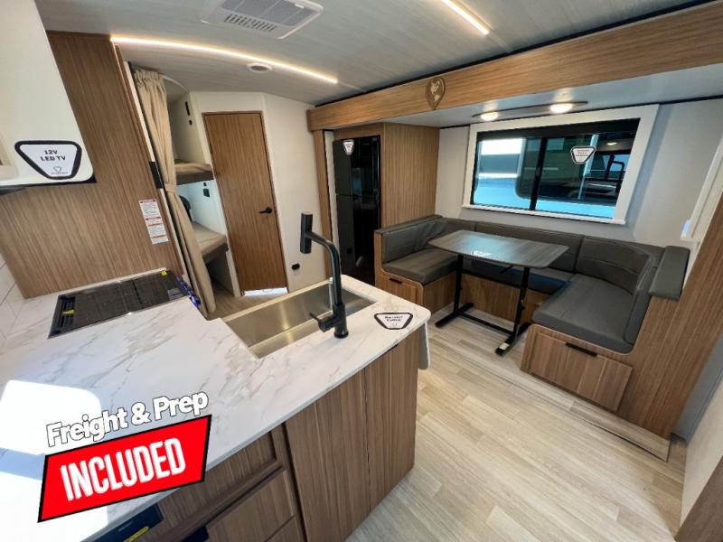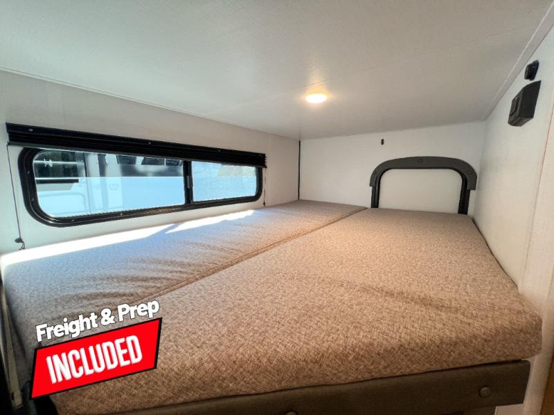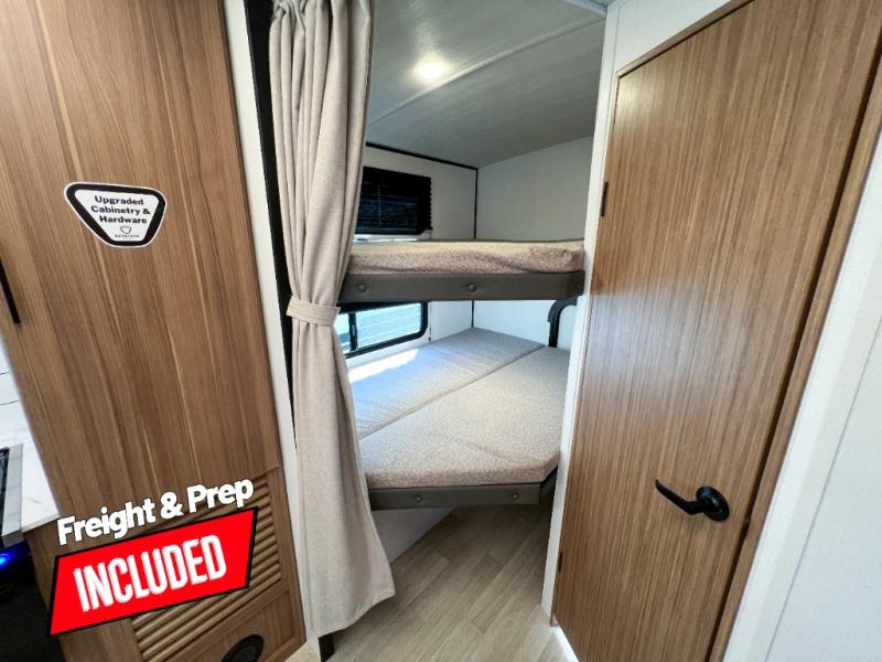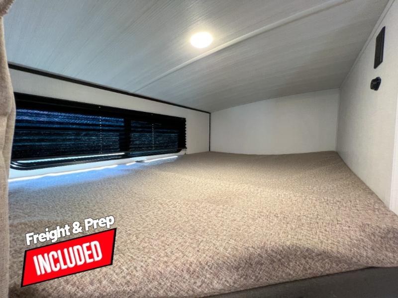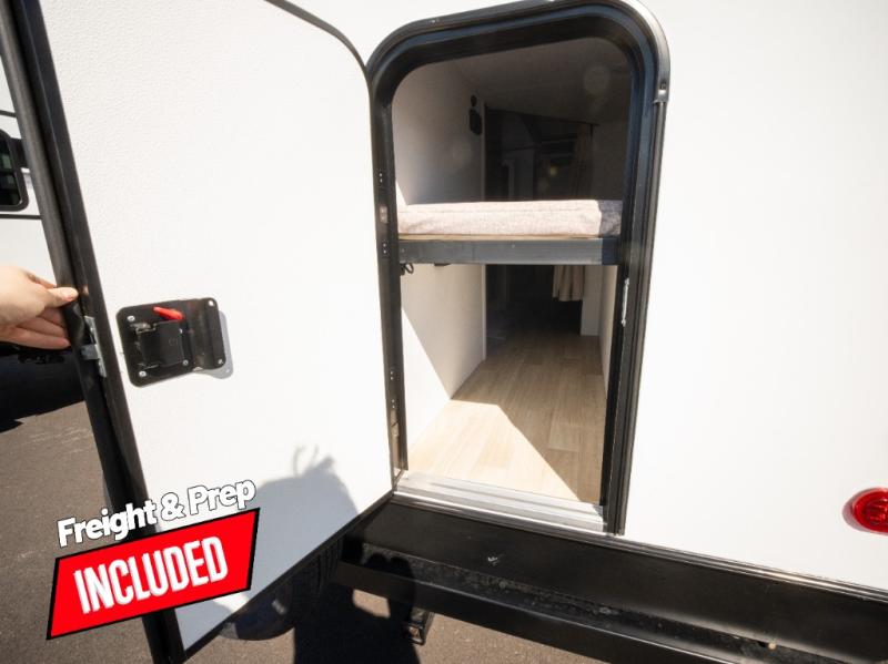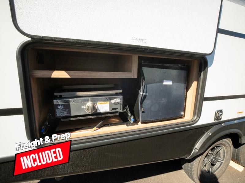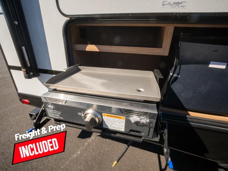 Trips to the lake with a larger group are made easy in this spacious travel trailer! The double-size bunks include a flip-up bunk for added storage, and there is a rear cargo door here so you can easily load gear from outside. The full bath is conveniently located right by the bunks for easy nighttime use, and the pantry is also close by if anyone needs a midnight snack! You will sleep like a baby in the front bedroom that includes a queen bed and dual wardrobes to keep your clothes tidy. In the morning, everyone can meet in the combined living area and kitchen while the chef makes breakfast on the three-burner cooktop, and there is a U-shaped do-more dinette table to dine at. If the weather is nice, the chef just may want to cook on the outside kitchen with a griddle, and everyone can sit at the picnic table under the 15' awning!
