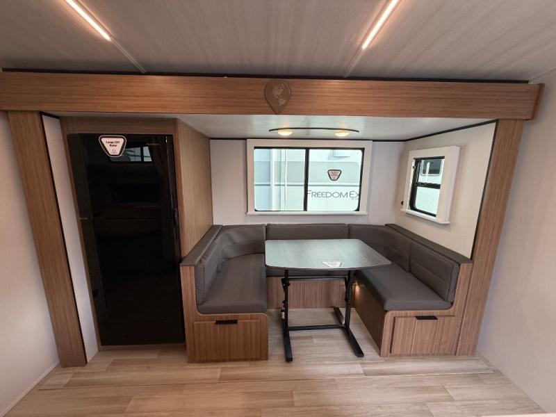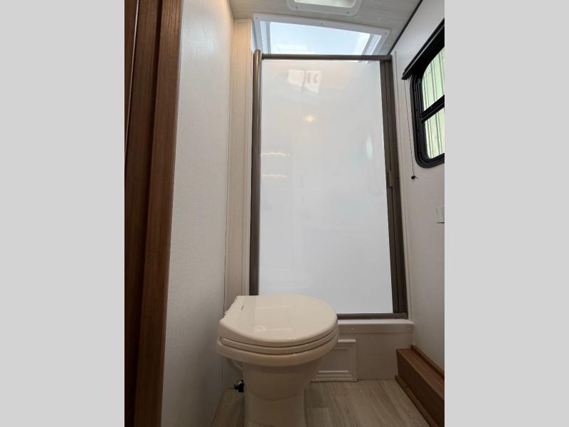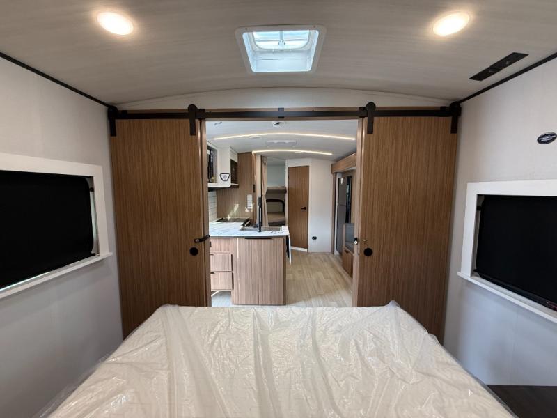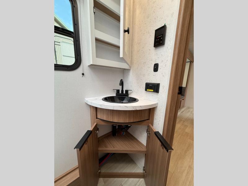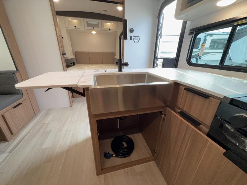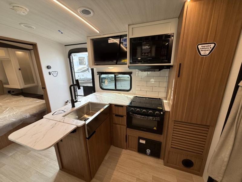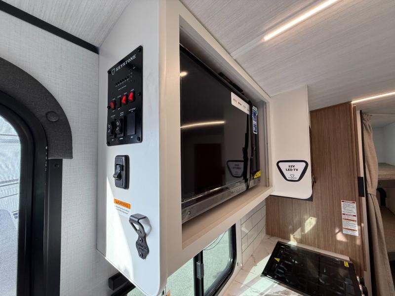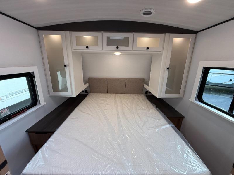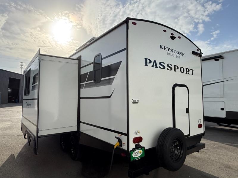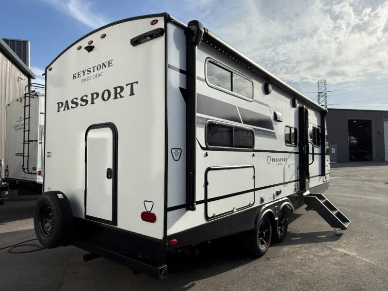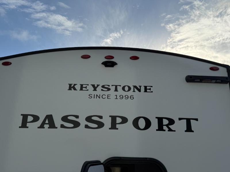 With any Keystone Passport Super Lite travel trailer you will enjoy lightweight towing and lots of interior comforts! The power tongue jack lets you hitch up at the drop of a hat, and the Dexter torsion axle rubber ride suspension will make towing easier than ever. You will appreciate having 4-point power stabilizer jacks for quick setup and an exterior convenience center to monitor tank levels. These trailers feature 5-sided aluminum construction, new premium aluminum wheels, a heated and enclosed underbelly, plus new composite solid entry steps. Inside, you'll enjoy seamless kitchen countertops, interior lights with a dimmer, a rainfall showerhead, and premium pull-down roller shades for added privacy.