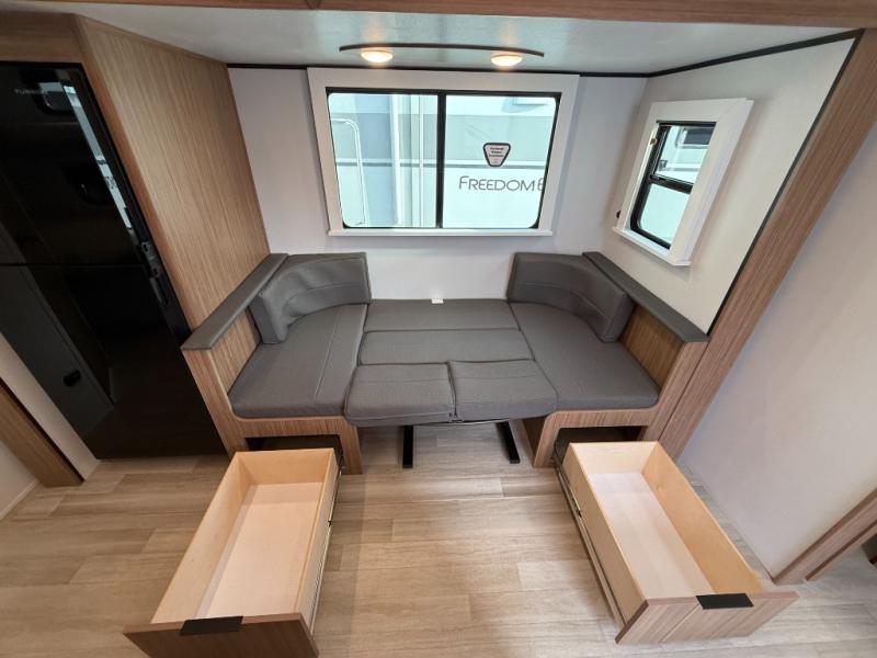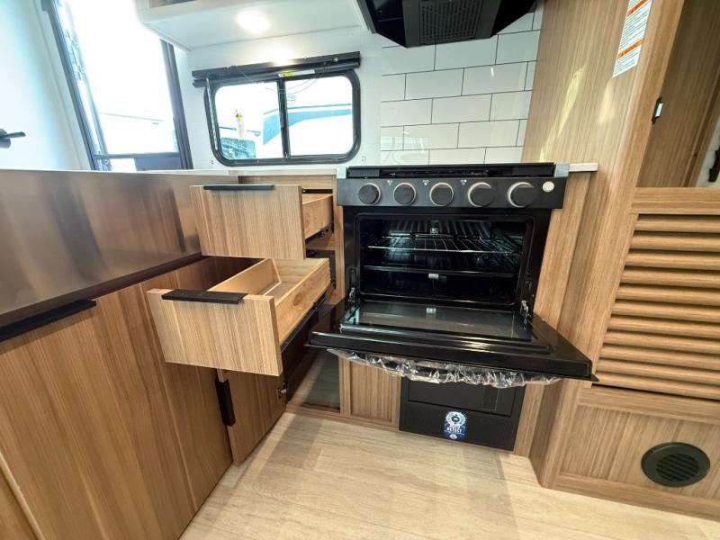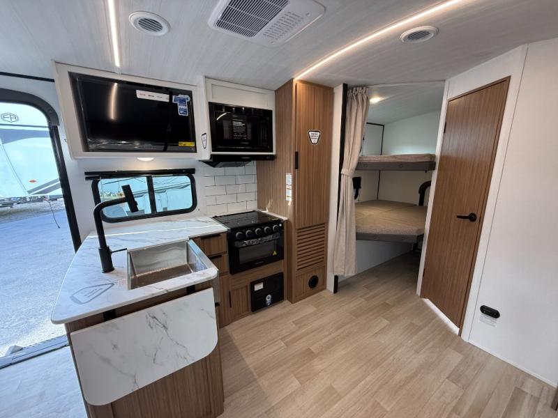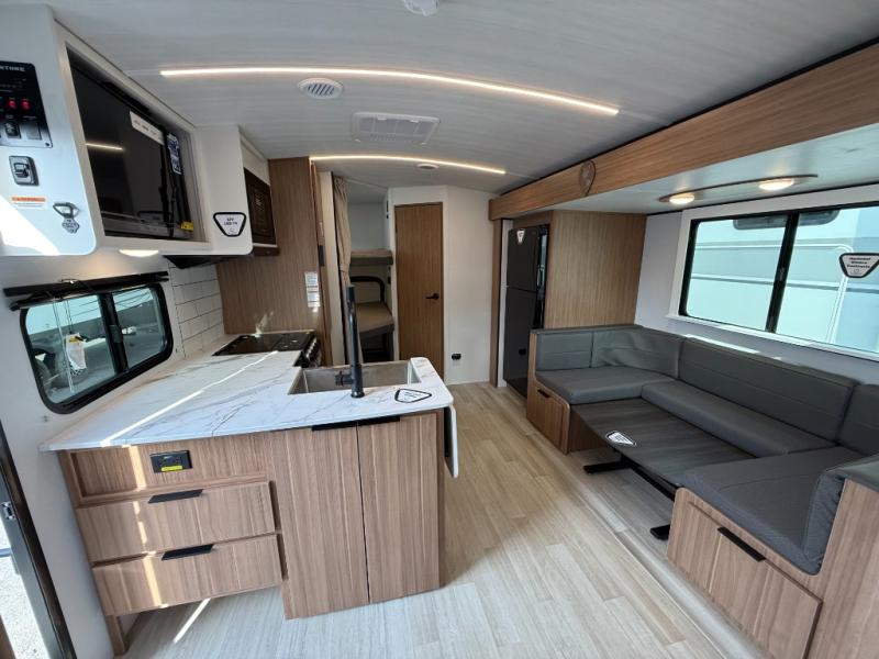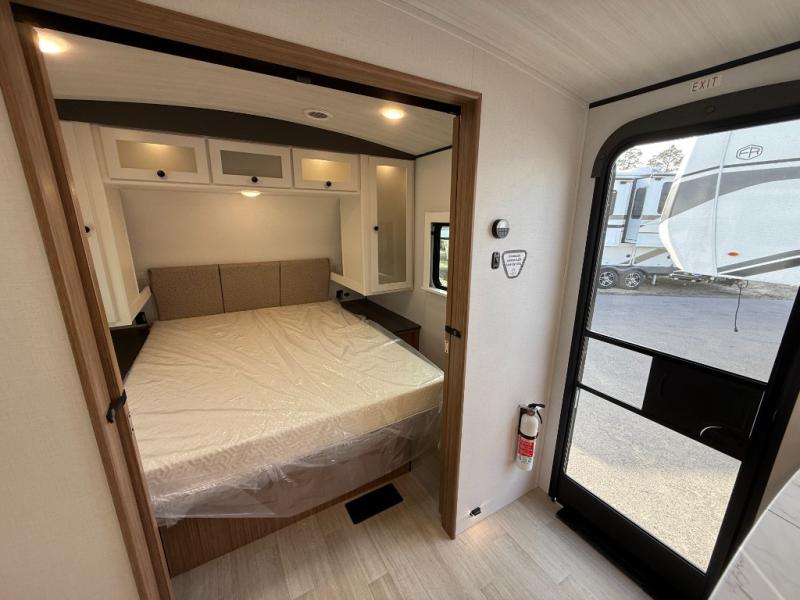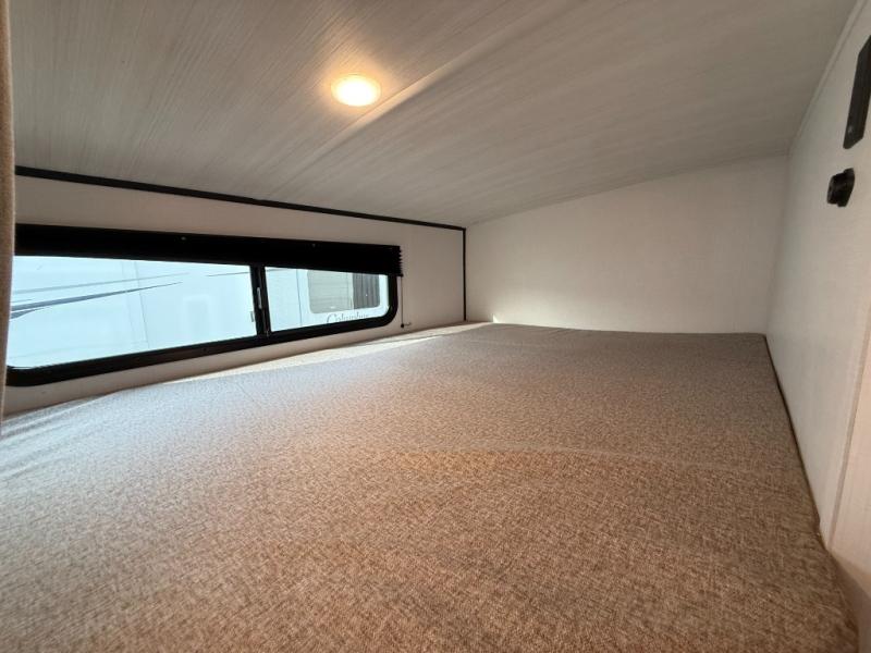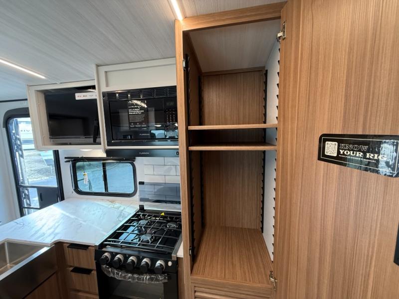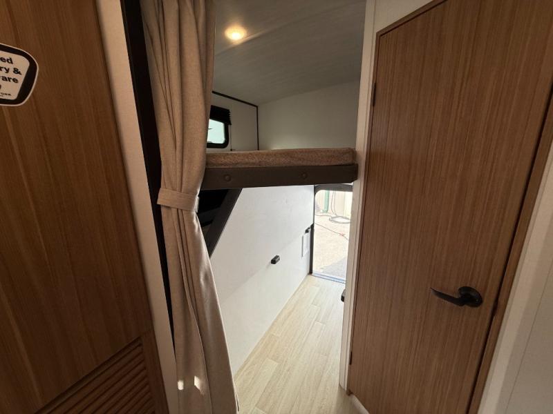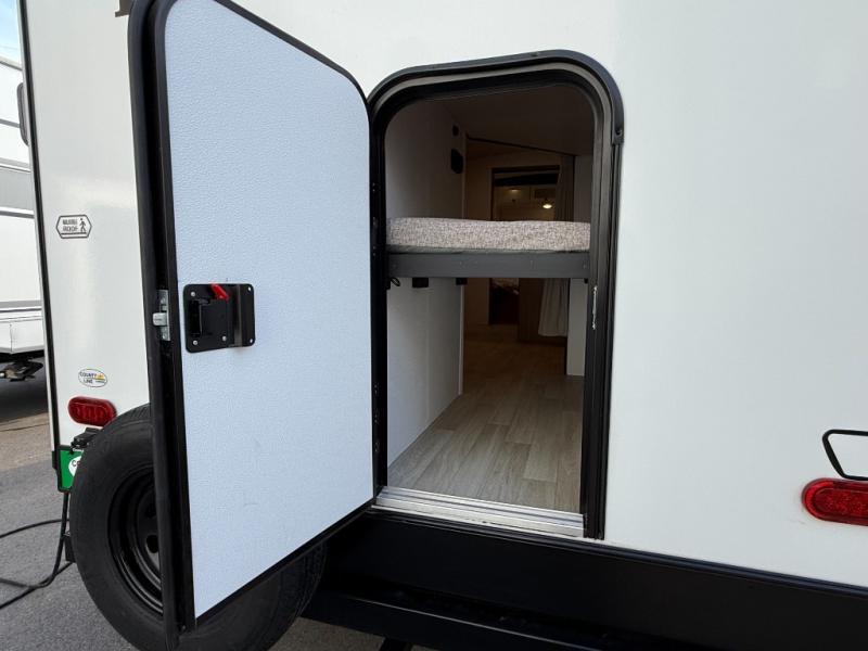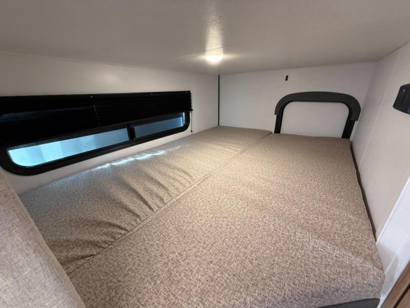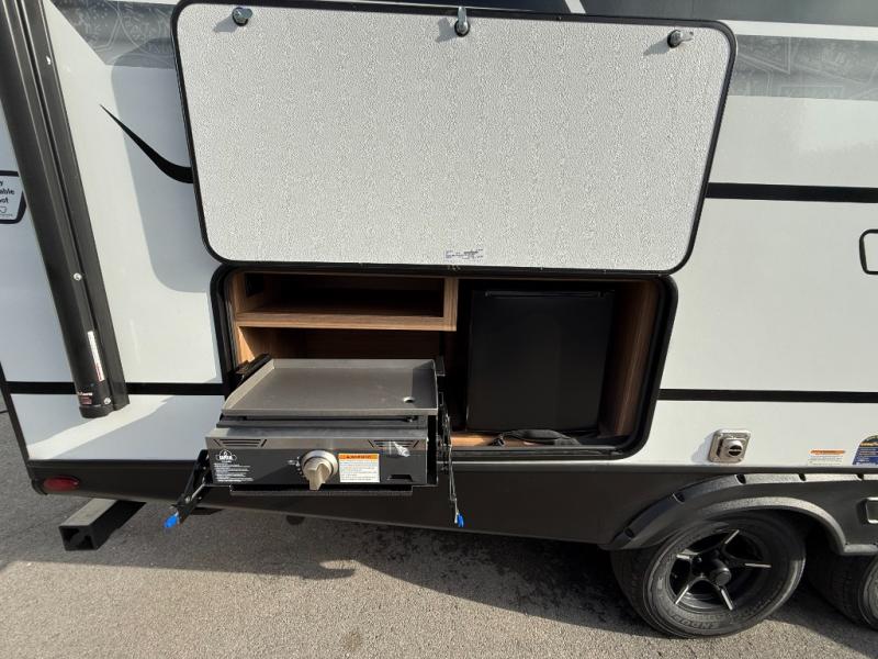 Trips to the lake with a larger group are made easy in this spacious travel trailer! The double-size bunks include a flip-up bunk for added storage, and there is a rear cargo door here so you can easily load gear from outside. The full bath is conveniently located right by the bunks for easy nighttime use, and the pantry is also close by if anyone needs a midnight snack! You will sleep like a baby in the front bedroom that includes a queen bed and dual wardrobes to keep your clothes tidy. In the morning, everyone can meet in the combined living area and kitchen while the chef makes breakfast on the three-burner cooktop, and there is a U-shaped do-more dinette table to dine at. If the weather is nice, the chef just may want to cook on the outside kitchen with a griddle, and everyone can sit at the picnic table under the 15' awning!