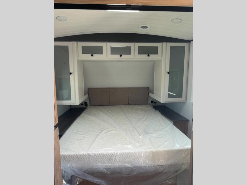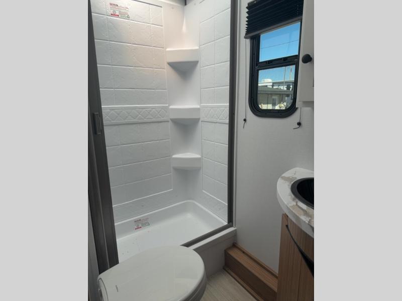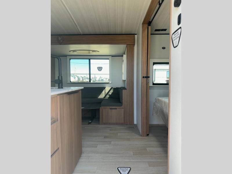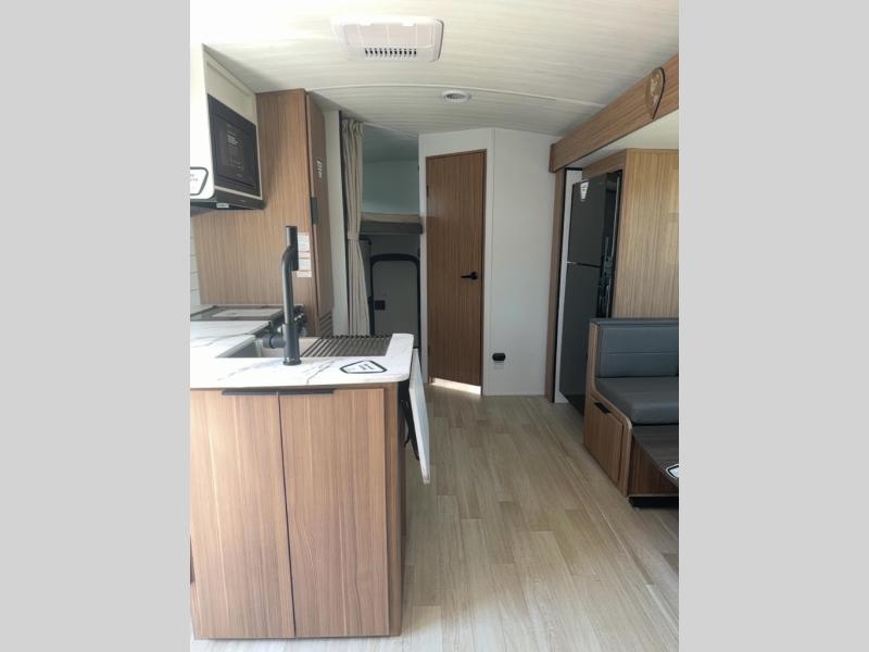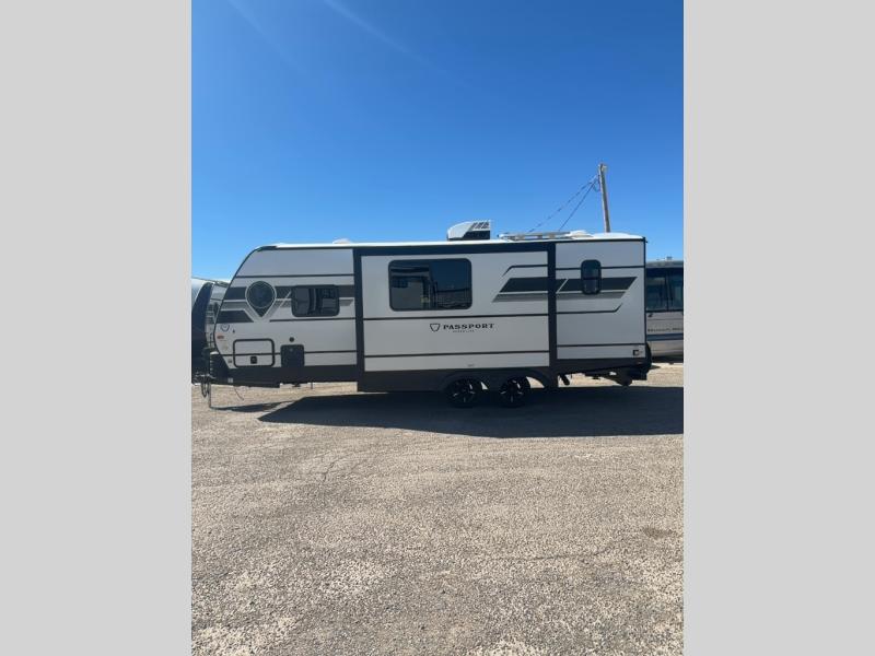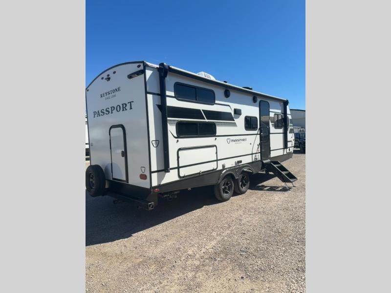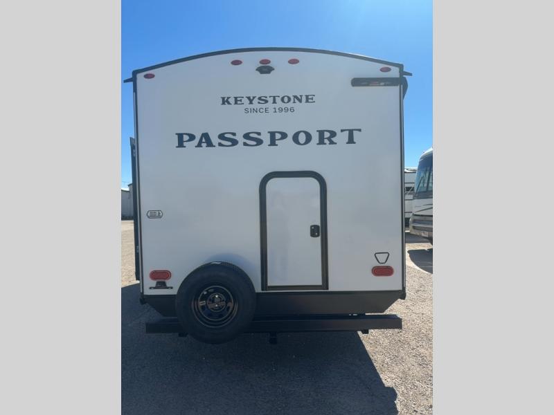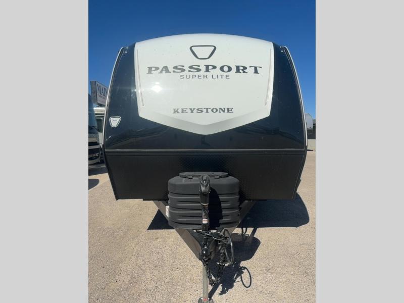 With any Keystone Passport Super Lite travel trailer you will enjoy lightweight towing and lots of interior comforts! The power tongue jack lets you hitch up at the drop of a hat, and the Dexter torsion axle rubber ride suspension will make towing easier than ever. You will appreciate having 4-point power stabilizer jacks for quick setup and an exterior convenience center to monitor tank levels. These trailers feature 5-sided aluminum construction, new premium aluminum wheels, a heated and enclosed underbelly, plus new composite solid entry steps. Inside, you'll enjoy seamless kitchen countertops, interior lights with a dimmer, a rainfall showerhead, and premium pull-down roller shades for added privacy.