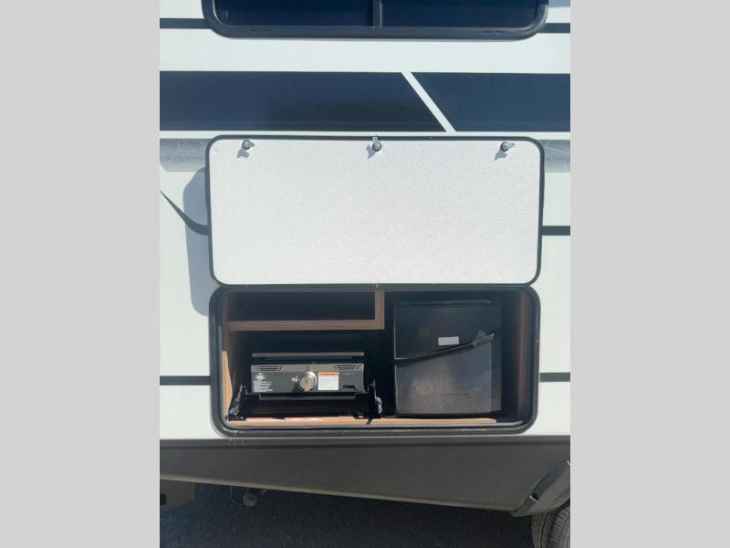 Trips to the lake with a larger group are made easy in this spacious travel trailer! The double-size bunks include a flip-up bunk for added storage, and there is a rear cargo door here so you can easily load gear from outside. The full bath is conveniently located right by the bunks for easy nighttime use, and the pantry is also close by if anyone needs a midnight snack! You will sleep like a baby in the front bedroom that includes a queen bed and dual wardrobes to keep your clothes tidy. In the morning, everyone can meet in the combined living area and kitchen while the chef makes breakfast on the three-burner cooktop, and there is a U-shaped do-more dinette table to dine at. If the weather is nice, the chef just may want to cook on the outside kitchen with a griddle, and everyone can sit at the picnic table under the 15' awning!