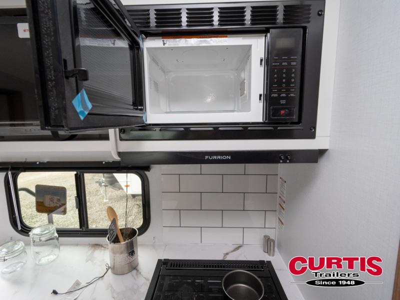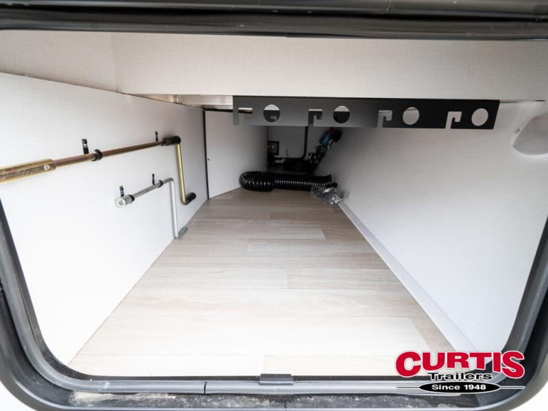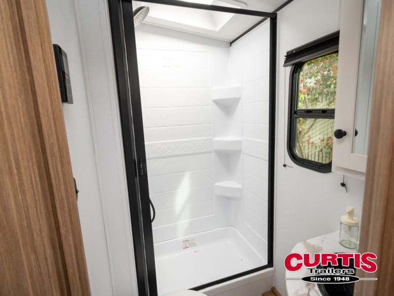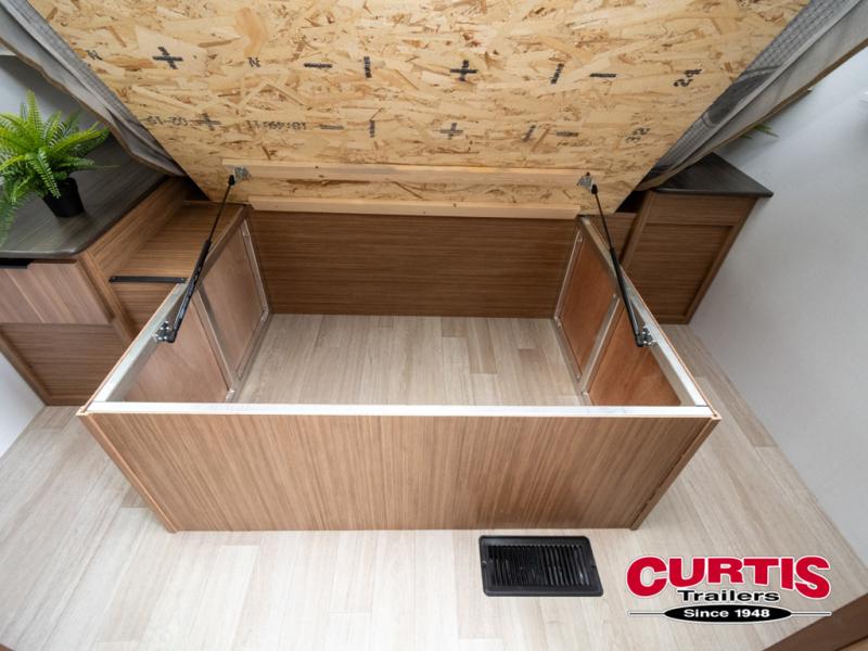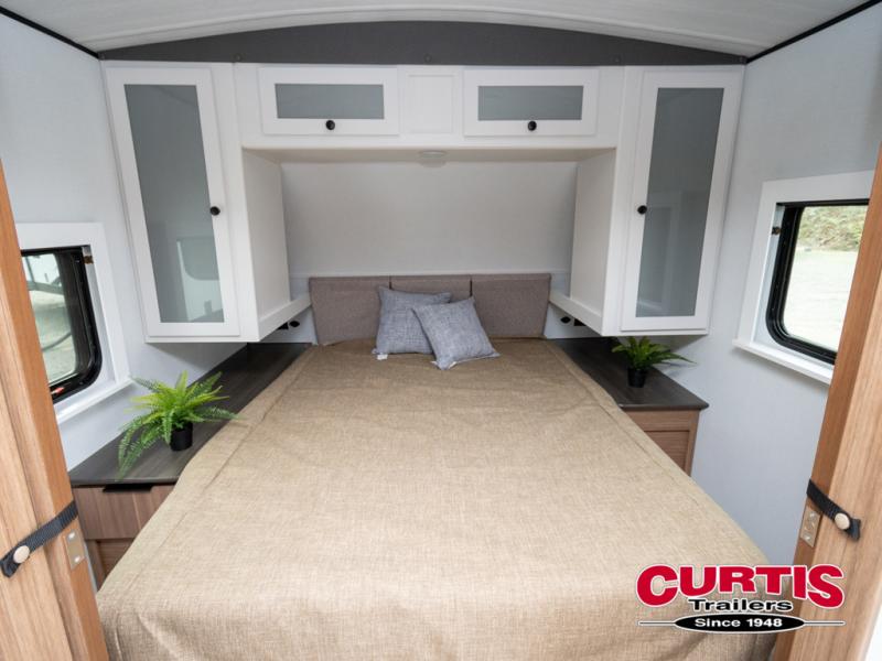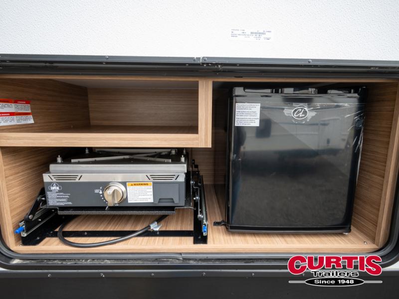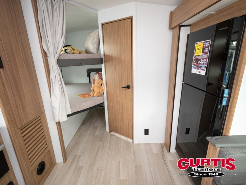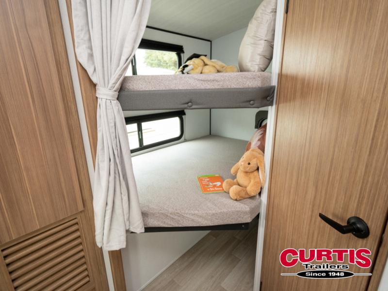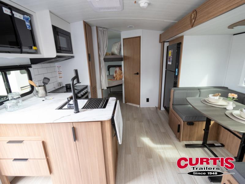 Trips to the lake with a larger group are made easy in this spacious travel trailer! The double-size bunks include a flip-up bunk for added storage, and there is a rear cargo door here so you can easily load gear from outside. The full bath is conveniently located right by the bunks for easy nighttime use, and the pantry is also close by if anyone needs a midnight snack! You will sleep like a baby in the front bedroom that includes a queen bed and dual wardrobes to keep your clothes tidy. In the morning, everyone can meet in the combined living area and kitchen while the chef makes breakfast on the three burner cooktop, and there is a U-shaped do-more dinette table to dine at. If the weather is nice, the chef just may want to cook on the outside kitchen with a griddle, and everyone can sit at the picnic table under the 15' awning!