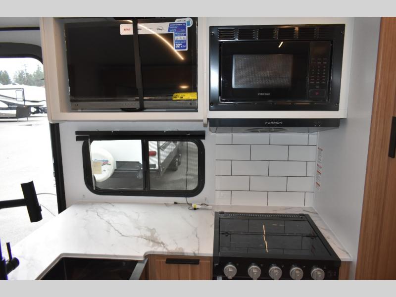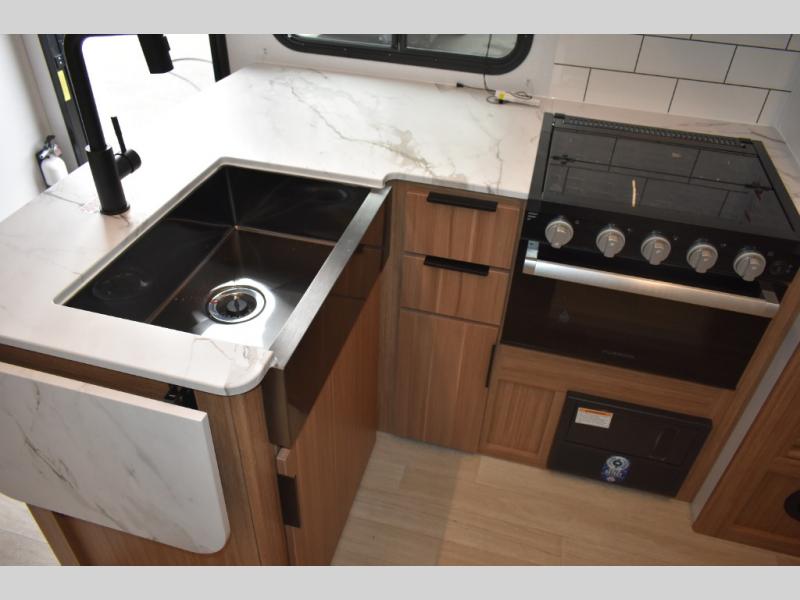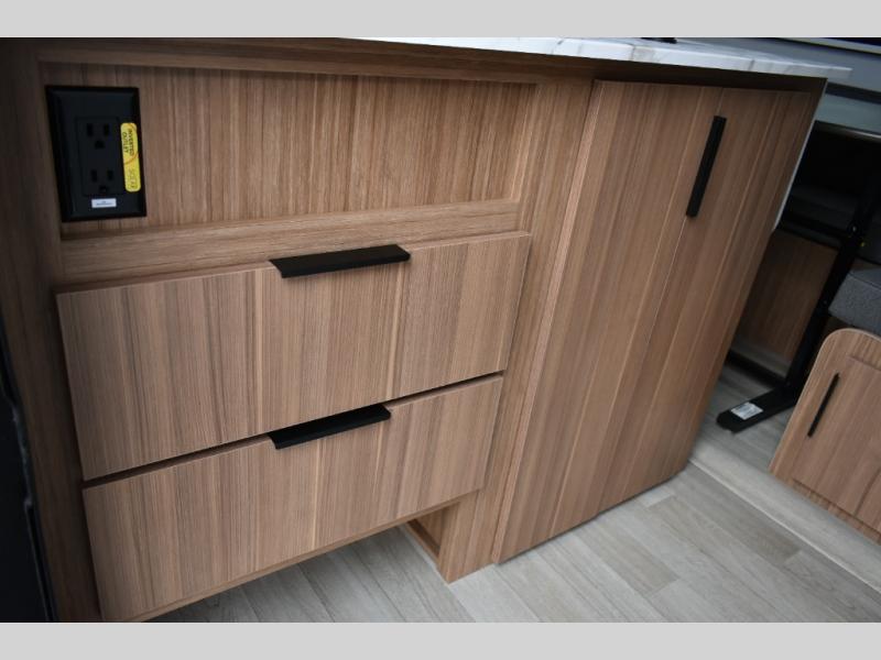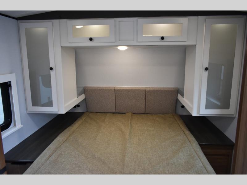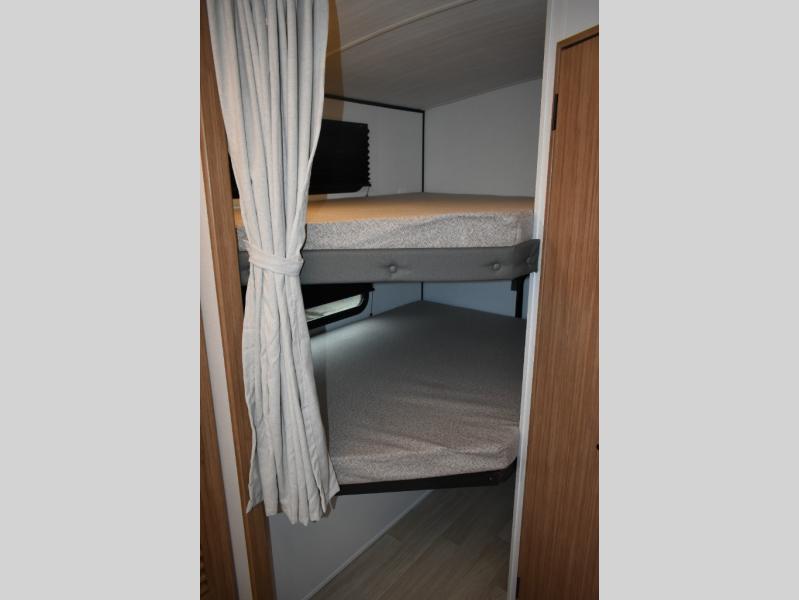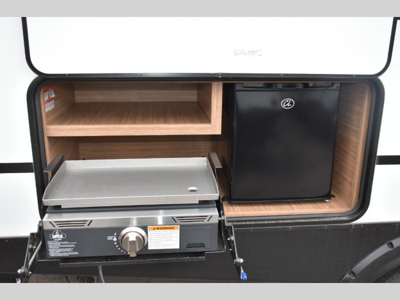 Trips to the lake with a larger group are made easy in this spacious travel trailer! The double-size bunks include a flip-up bunk for added storage, and there is a rear cargo door here so you can easily load gear from outside. The full bath is conveniently located right by the bunks for easy nighttime use, and the pantry is also close by if anyone needs a midnight snack! You will sleep like a baby in the front bedroom that includes a queen bed and dual wardrobes to keep your clothes tidy. In the morning, everyone can meet in the combined living area and kitchen while the chef makes breakfast on the three burner cooktop, and there is a U-shaped do-more dinette table to dine at. If the weather is nice, the chef just may want to cook on the outside kitchen with a griddle, and everyone can sit at the picnic table under the 15' awning!