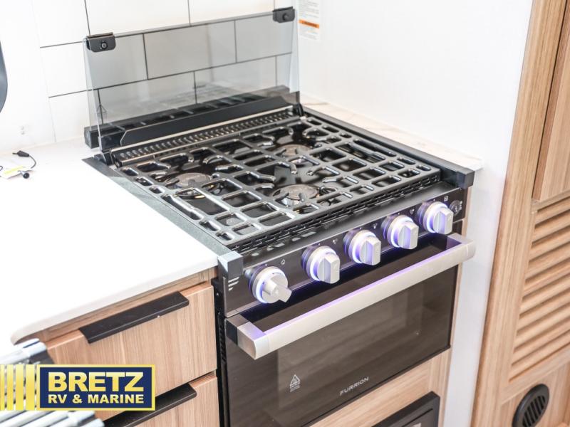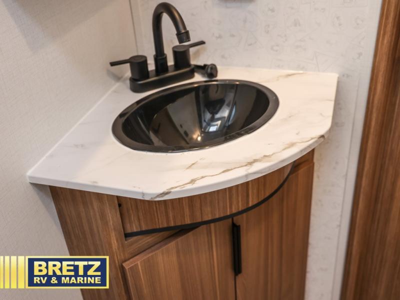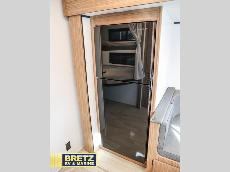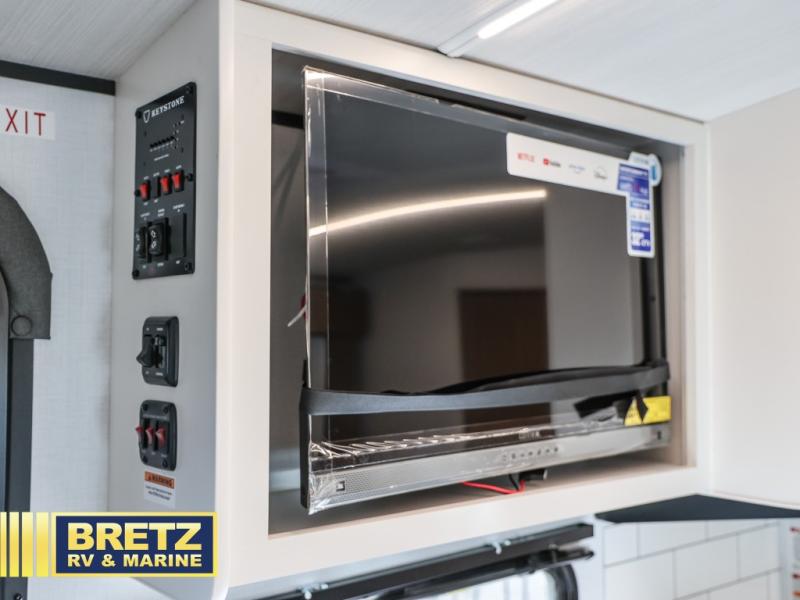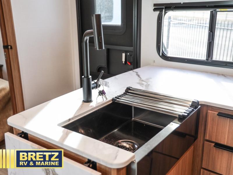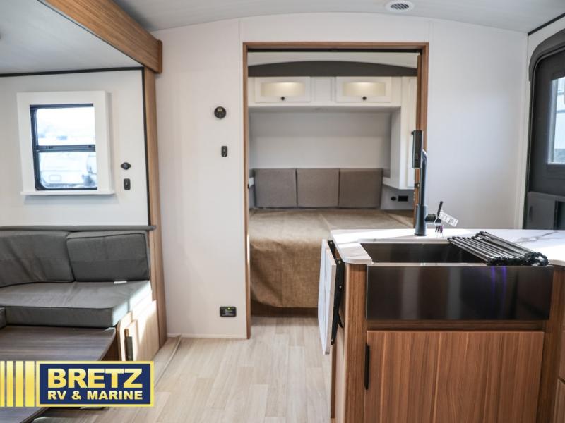 Trips to the lake with a larger group are made easy in this spacious travel trailer! The double-size bunks include a flip-up bunk for added storage, and there is a rear cargo door here so you can easily load gear from outside. The full bath is conveniently located right by the bunks for easy nighttime use, and the pantry is also close by if anyone needs a midnight snack! You will sleep like a baby in the front bedroom that includes a queen bed and dual wardrobes to keep your clothes tidy. In the morning, everyone can meet in the combined living area and kitchen while the chef makes breakfast on the three burner cooktop, and there is a U-shaped do-more dinette table to dine at. If the weather is nice, the chef just may want to cook on the outside kitchen with a griddle, and everyone can sit at the picnic table under the 15' awning!