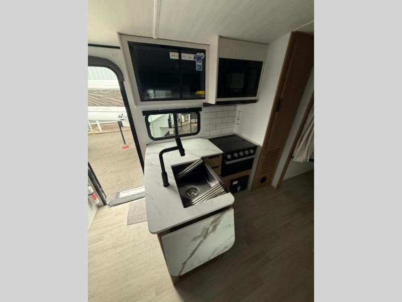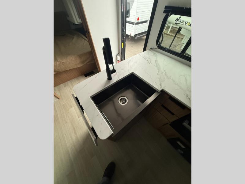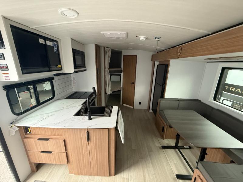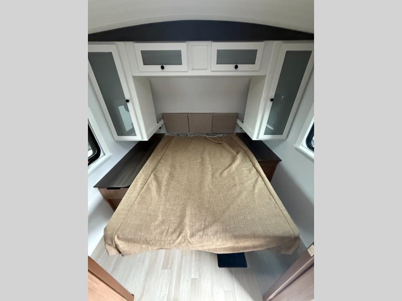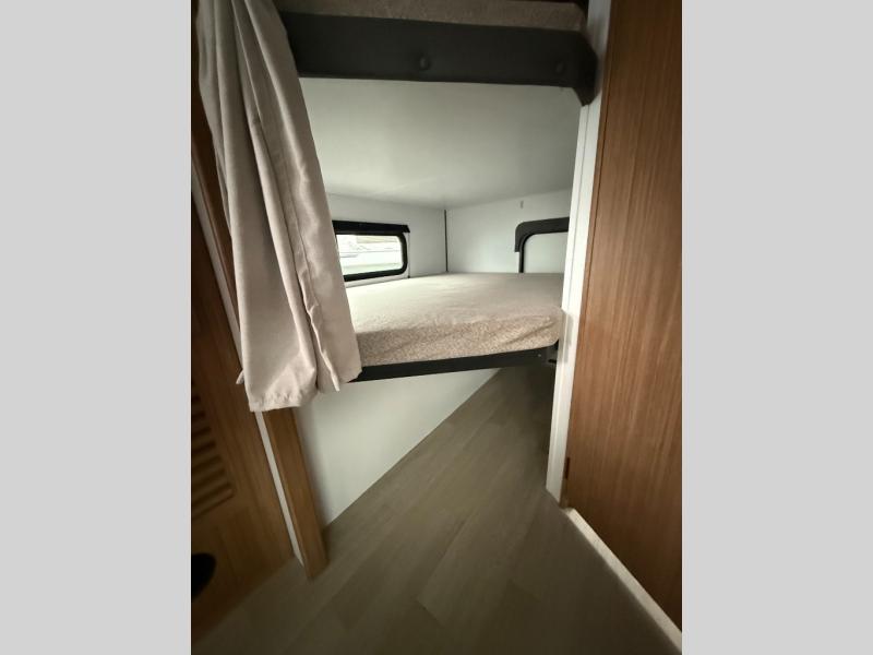 Trips to the lake with a larger group are made easy in this spacious travel trailer! The double-size bunks include a flip-up bunk for added storage, and there is a rear cargo door here so you can easily load gear from outside. The full bath is conveniently located right by the bunks for easy nighttime use, and the pantry is also close by if anyone needs a midnight snack! You will sleep like a baby in the front bedroom that includes a queen bed and dual wardrobes to keep your clothes tidy. In the morning, everyone can meet in the combined living area and kitchen while the chef makes breakfast on the three burner cooktop, and there is a U-shaped do-more dinette table to dine at. If the weather is nice, the chef just may want to cook on the outside kitchen with a griddle, and everyone can sit at the picnic table under the 15' awning!