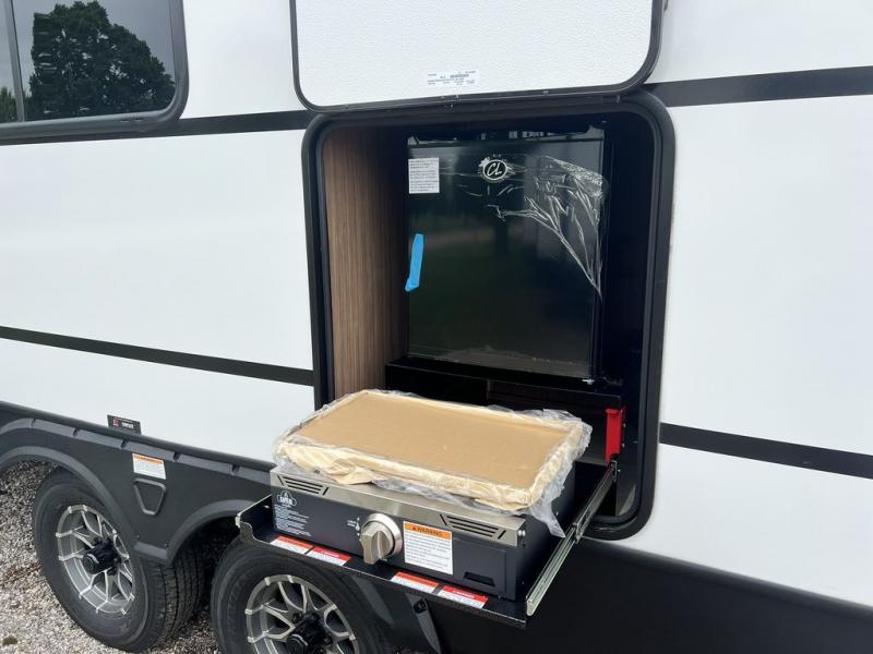 Are you looking to upgrade from a tent to a travel trailer? This dual axle unit may be the one! Since there are dual entry doors, you can enter in through the front master bedroom with a queen bed or the rear kitchen with ample counter space. Your crew can relax on the tri-fold sofa, play a game at the do-more dinette, or visit outdoors under the 19' awning. There is also an outdoor kitchen here for a sunrise breakfast! The walk-thru bath is easily accessible for everyone to use, and you'll find plenty of storage space throughout, including a large pantry, overhead compartments, and dual bedroom wardrobes and nightstands.