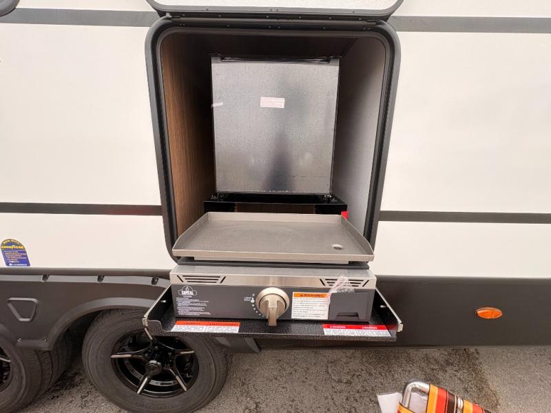 Are you looking to upgrade from a tent to a travel trailer? This dual axle unit may be the one! Since there are dual entry doors, you can enter in through the front master bedroom with a queen bed or the rear kitchen with ample counter space. Your crew can relax on the tri-fold sofa, play a game at the do-more dinette, or visit outdoors under the 19' awning. There is also an outdoor kitchen here for a sunrise breakfast! The walk-thru bath is easily accessible for everyone to use, and you'll find plenty of storage space throughout, including a large pantry, overhead compartments, and dual bedroom wardrobes and nightstands.