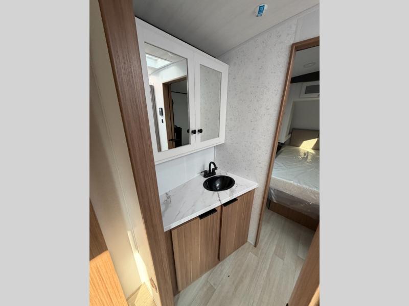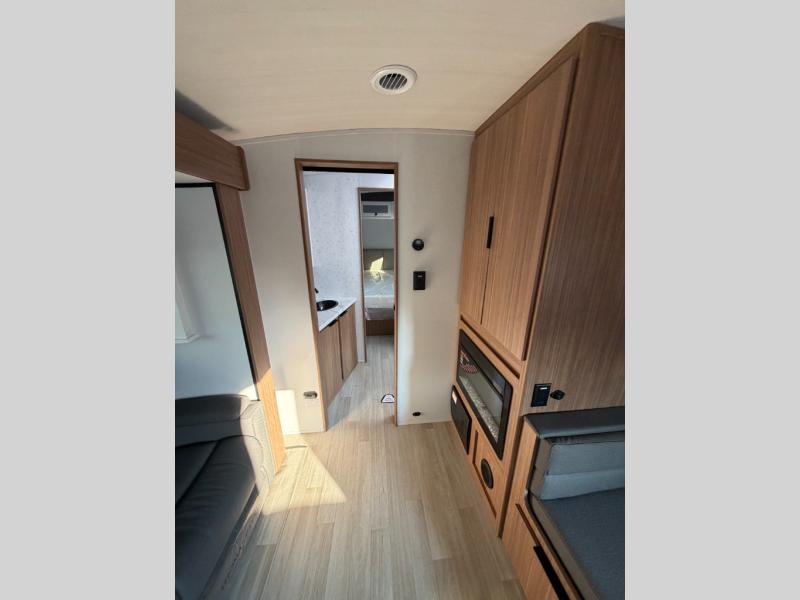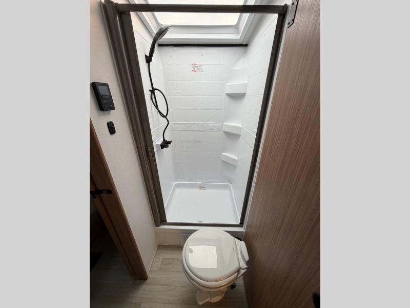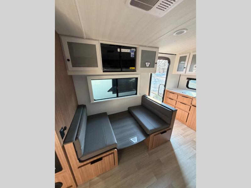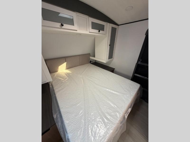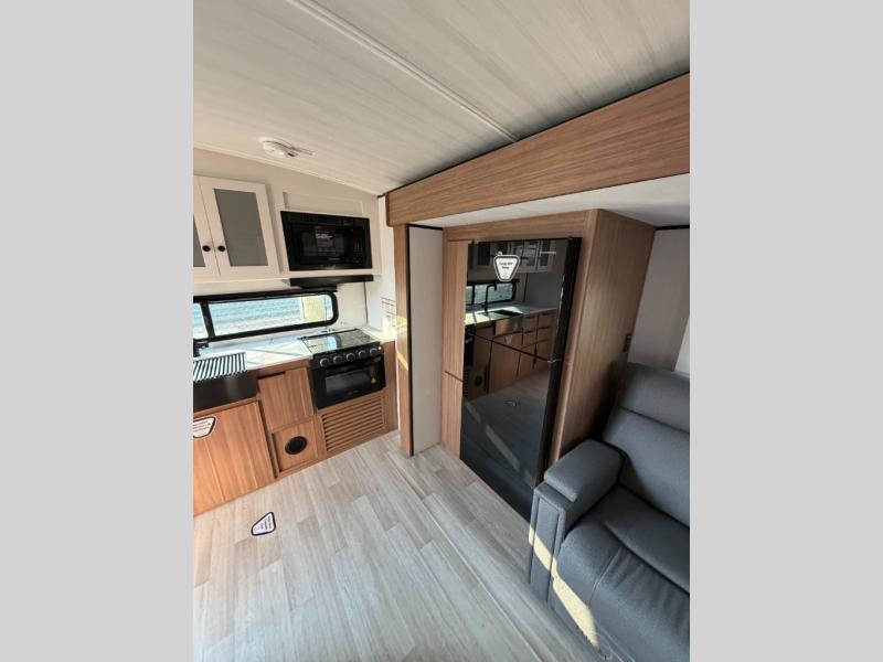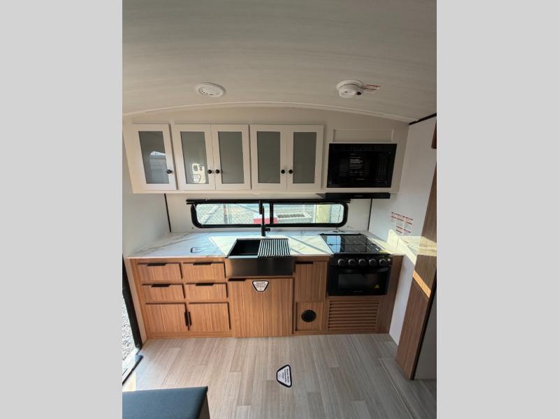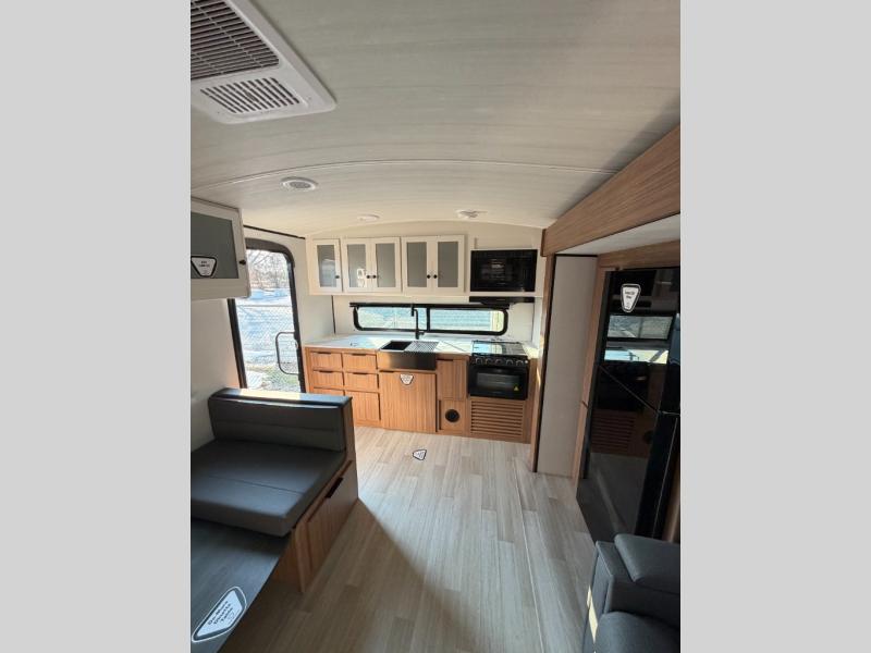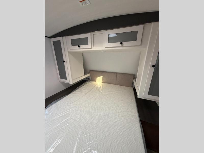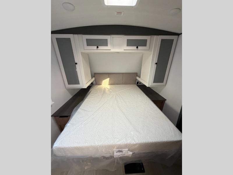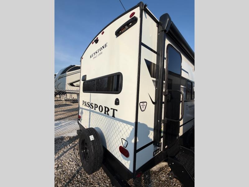 With any Keystone Passport Super Lite travel trailer you will enjoy lightweight towing and lots of interior comforts! The power tongue jack lets you hitch up at the drop of a hat, and the Dexter torsion axle rubber ride suspension will make towing easier than ever. You will appreciate having 4-point power stabilizer jacks for quick setup and an exterior convenience center to monitor tank levels. These trailers feature 5-sided aluminum construction, new premium aluminum wheels, a heated and enclosed underbelly, plus new composite solid entry steps. Inside, you'll enjoy seamless kitchen countertops, interior lights with a dimmer, a rainfall showerhead, and premium pull-down roller shades for added privacy.