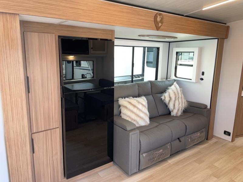 Are you looking to upgrade from a tent to a travel trailer? This dual axle unit may be the one! Since there are dual entry doors, you can enter in through the front master bedroom with a queen bed or the rear kitchen with ample counter space. Your crew can relax on the tri-fold sofa, play a game at the do-more dinette, or visit outdoors under the 19' awning. There is also an outdoor kitchen here for a sunrise breakfast! The walk-thru bath is easily accessible for everyone to use, and you'll find plenty of storage space throughout, including a large pantry, overhead compartments, and dual bedroom wardrobes.