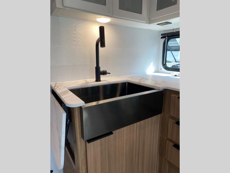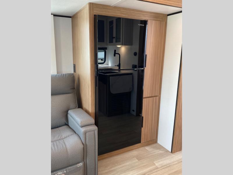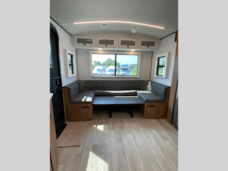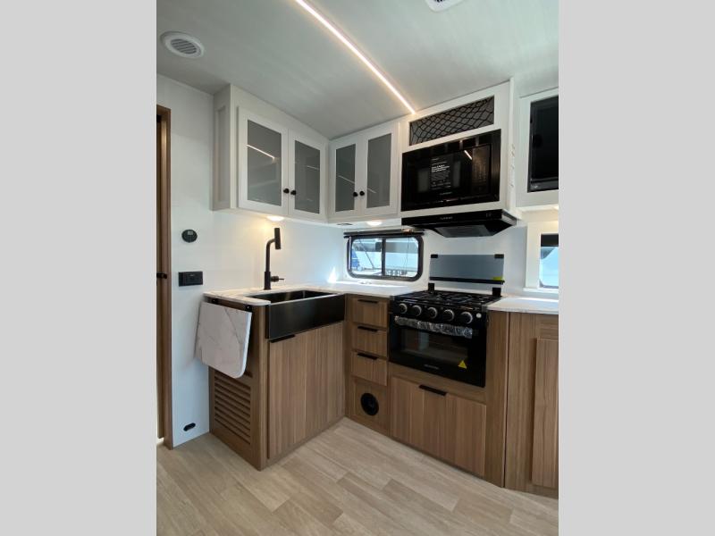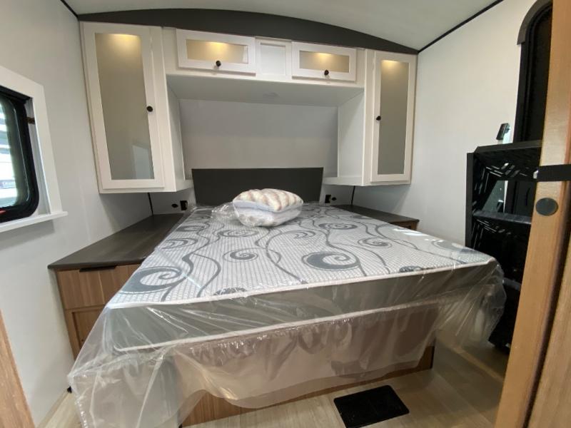 If you're looking to upgrade from a tent to a travel trailer, the time is now with this model! You will love having your own master bedroom up front with a queen bed, dual bedroom wardrobes and your own exterior entry door. The second entry door leads right into the combined kitchen and living area for added convenience. Your crew can dine or play a game around the U-shaped do-more dinette table or relax on the tri-fold sofa across from the entertainment center. These pieces of furniture will also double as your guests' sleeping space at night, and you have the option to choose luxury cinema recliners in place of the sofa if you don't need that much sleeping room. There is also a full walk-through bath to clean up in each day plus a fully-equipped kitchen to make meals!