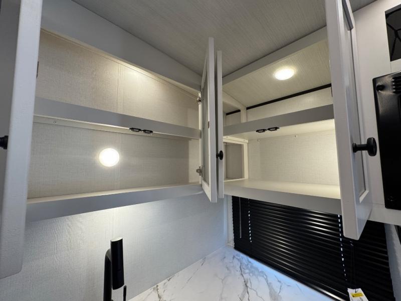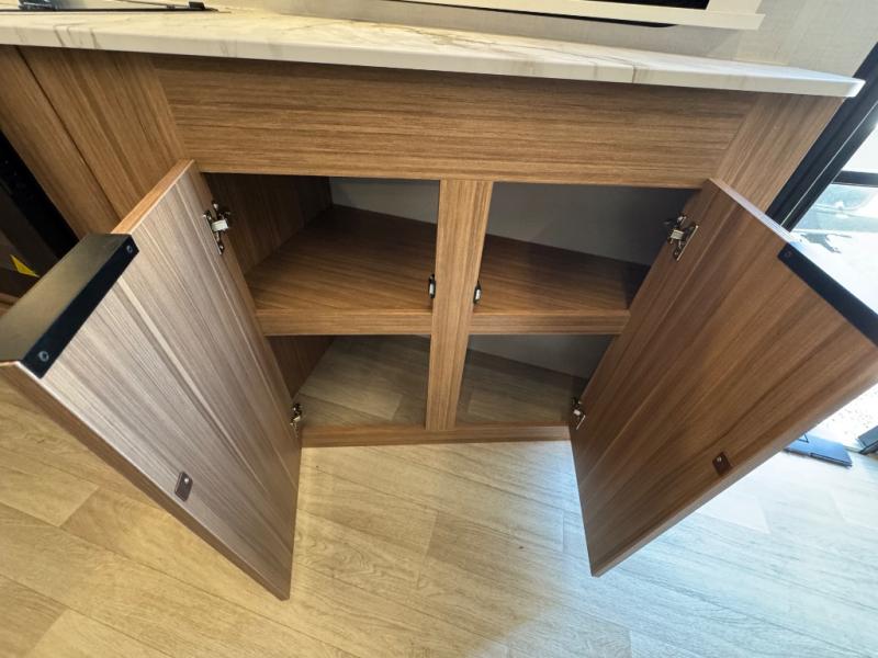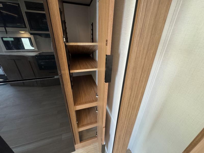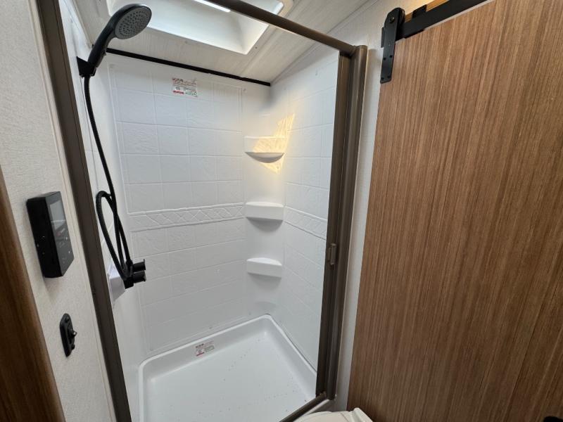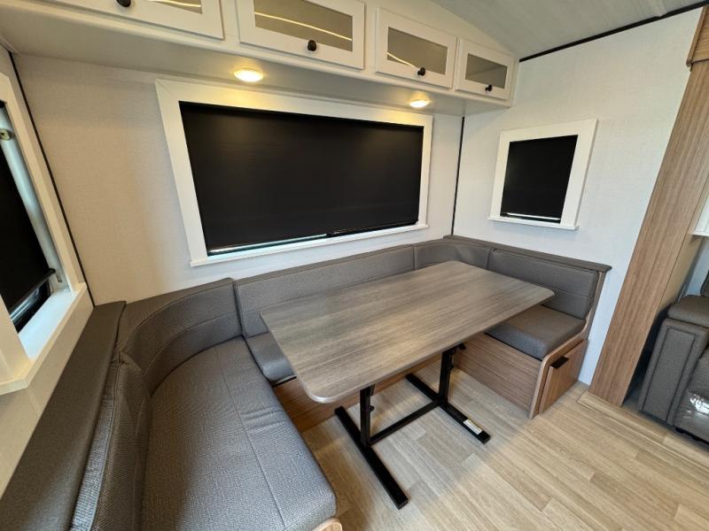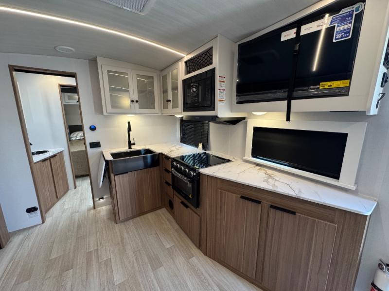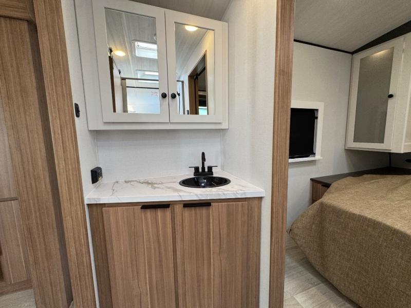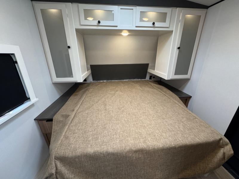 If you're looking to upgrade from a tent to a travel trailer, the time is now with this model! You will love having your own master bedroom up front with a queen bed, dual bedroom wardrobes and your own exterior entry door. The second entry door leads right into the combined kitchen and living area for added convenience. Your crew can dine or play a game around the U-shaped do-more dinette table or relax on the tri-fold sofa across from the entertainment center. These pieces of furniture will also double as your guests' sleeping space at night, and you have the option to choose luxury cinema recliners in place of the sofa if you don't need that much sleeping room. There is also a full walk-through bath to clean up in each day plus a fully-equipped kitchen to make meals!
