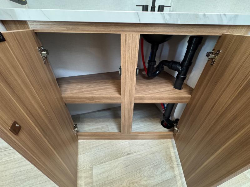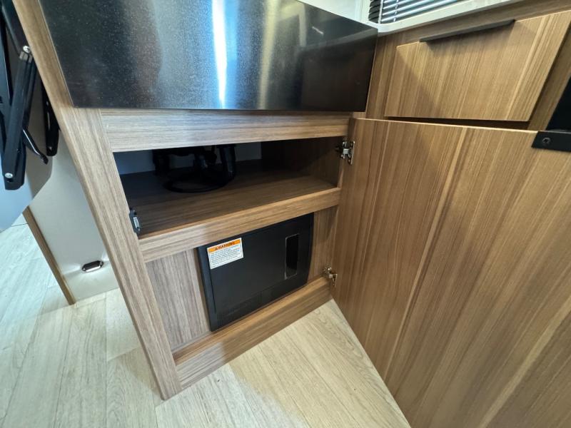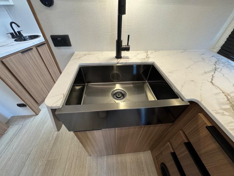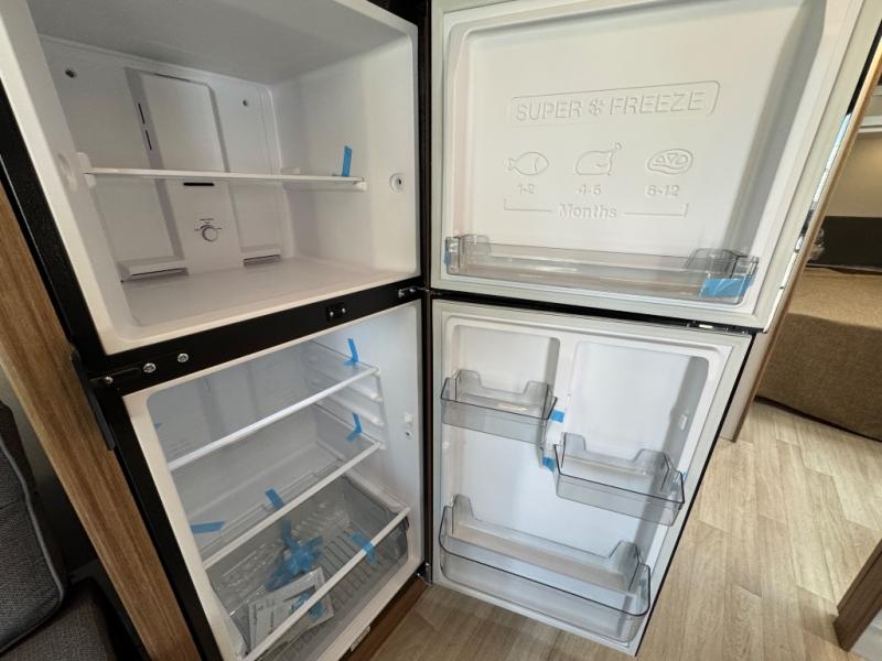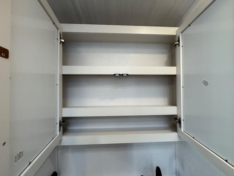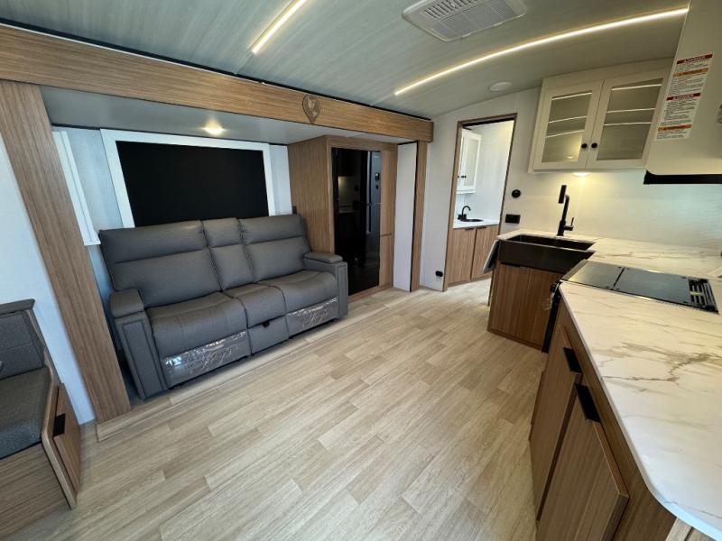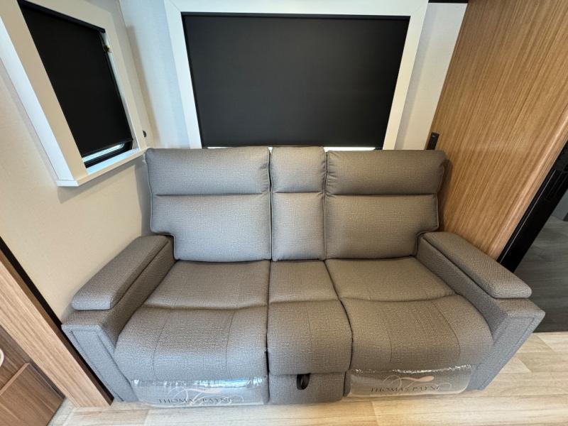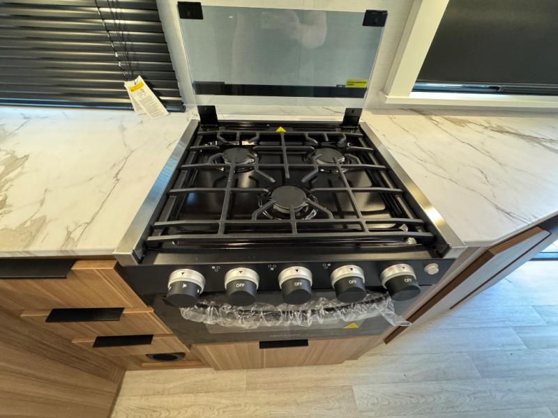 If you're looking to upgrade from a tent to a travel trailer, the time is now with this model! You will love having your own master bedroom up front with a queen bed, dual bedroom wardrobes and your own exterior entry door. The second entry door leads right into the combined kitchen and living area for added convenience. Your crew can dine or play a game around the U-shaped do-more dinette table or relax on the tri-fold sofa across from the entertainment center. These pieces of furniture will also double as your guests' sleeping space at night, and you have the option to choose luxury cinema recliners in place of the sofa if you don't need that much sleeping room. There is also a full walk-through bath to clean up in each day plus a fully-equipped kitchen to make meals!