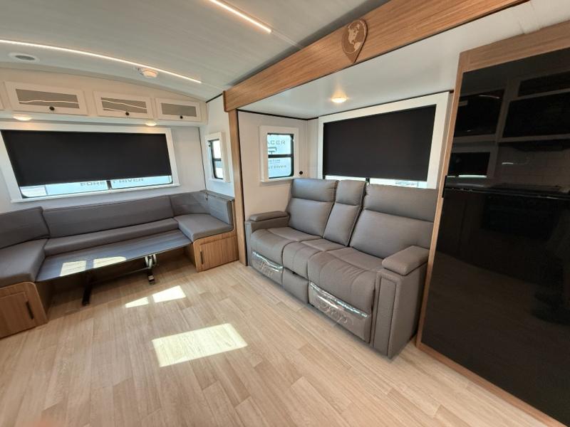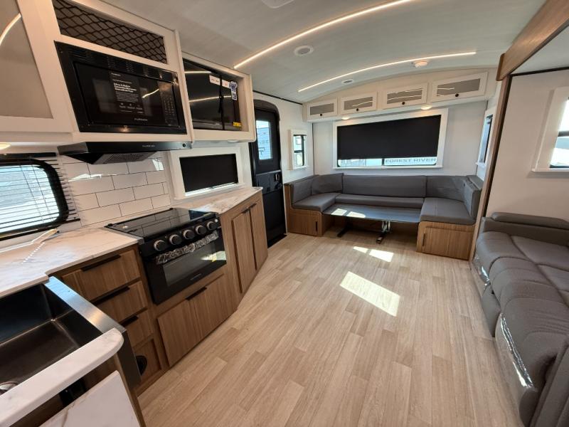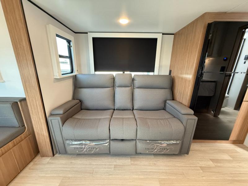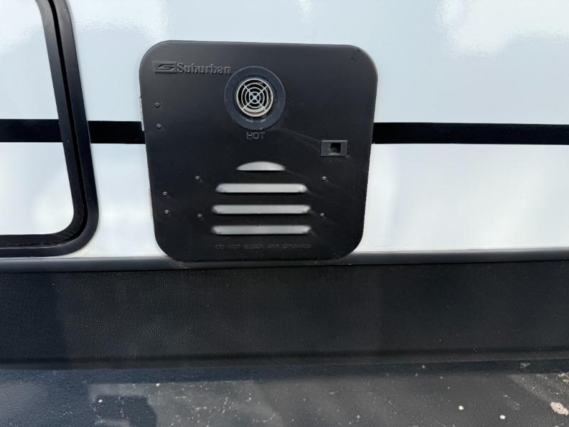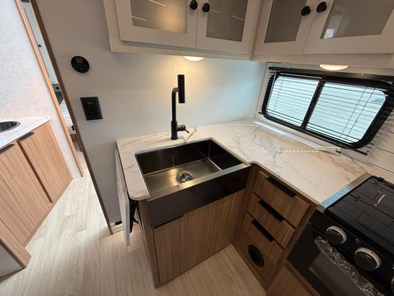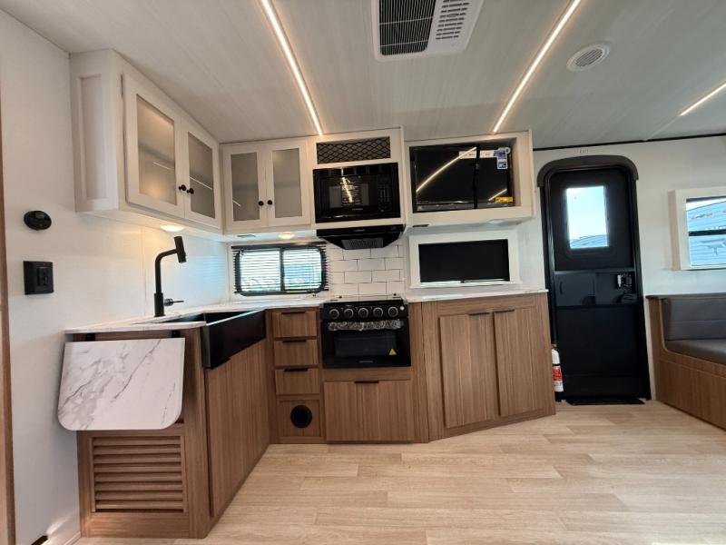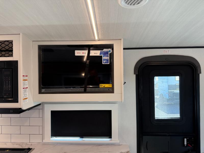 If you're looking to upgrade from a tent to a travel trailer, the time is now with this model! You will love having your own master bedroom up front with a queen bed, dual bedroom wardrobes and your own exterior entry door. The second entry door leads right into the combined kitchen and living area for added convenience. Your crew can dine or play a game around the U-shaped do-more dinette table or relax on the tri-fold sofa across from the entertainment center. These pieces of furniture will also double as your guests' sleeping space at night, and you have the option to choose luxury cinema recliners in place of the sofa if you don't need that much sleeping room. There is also a full walk-through bath to clean up in each day plus a fully-equipped kitchen to make meals!