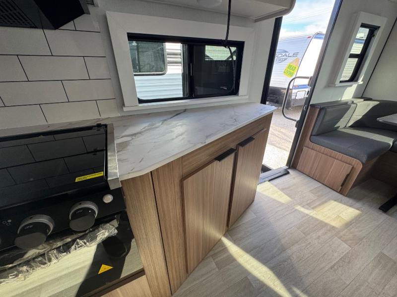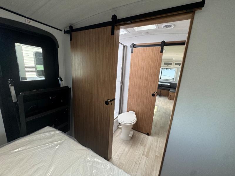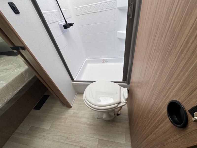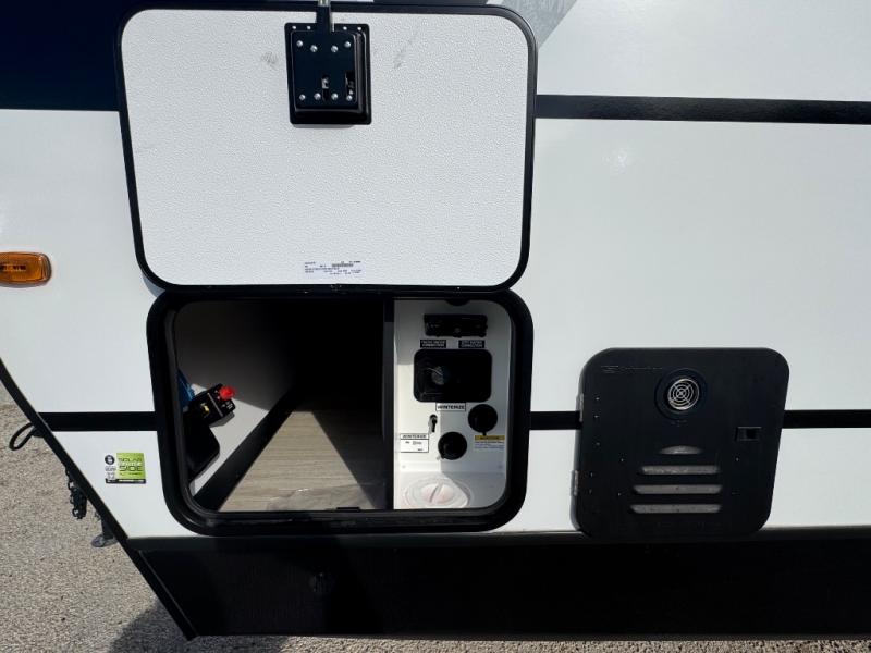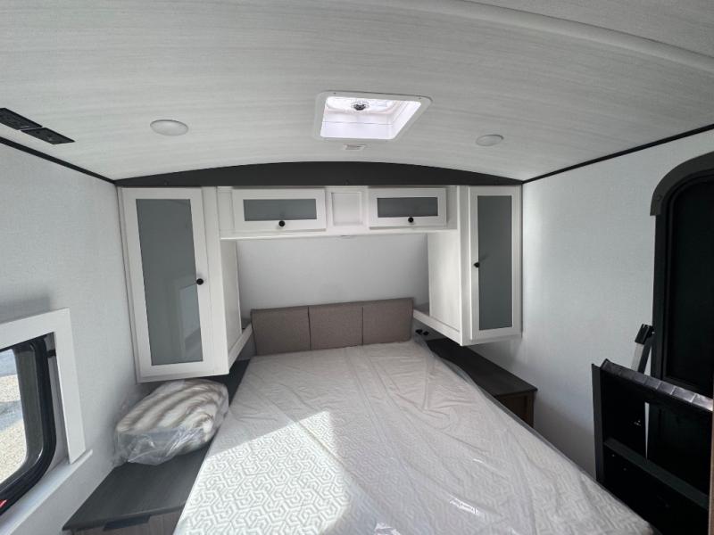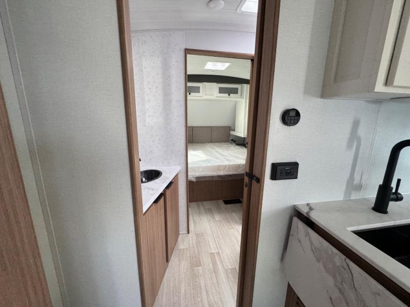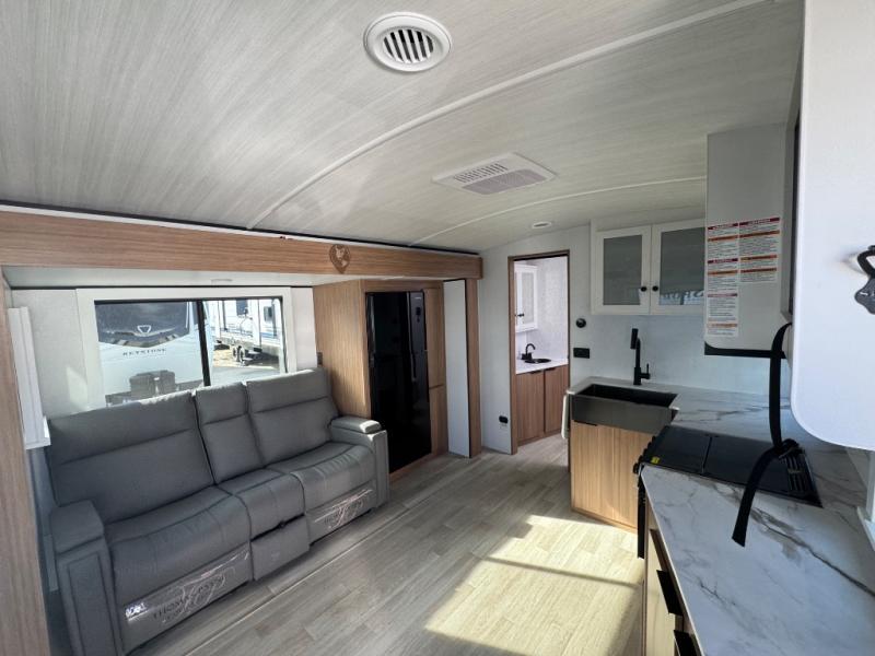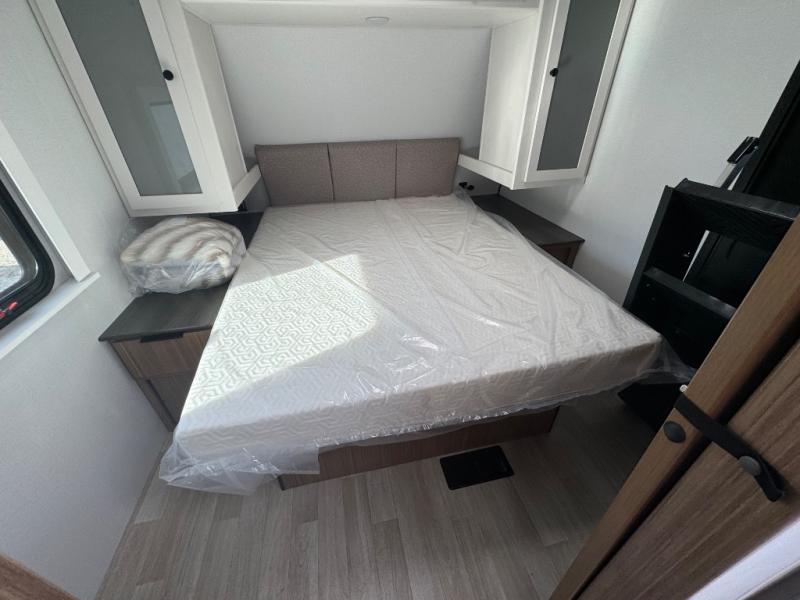 If you're looking to upgrade from a tent to a travel trailer, the time is now with this model! You will love having your own master bedroom up front with a queen bed, dual bedroom wardrobes and your own exterior entry door. The second entry door leads right into the combined kitchen and living area for added convenience. Your crew can dine or play a game around the U-shaped do-more dinette table or relax on the tri-fold sofa across from the entertainment center. These pieces of furniture will also double as your guests' sleeping space at night, and you have the option to choose luxury cinema recliners in place of the sofa if you don't need that much sleeping room. There is also a full walk-through bath to clean up in each day plus a fully-equipped kitchen to make meals!