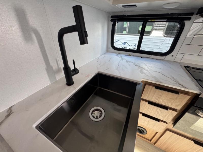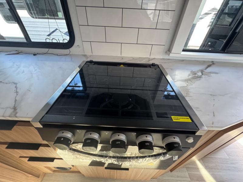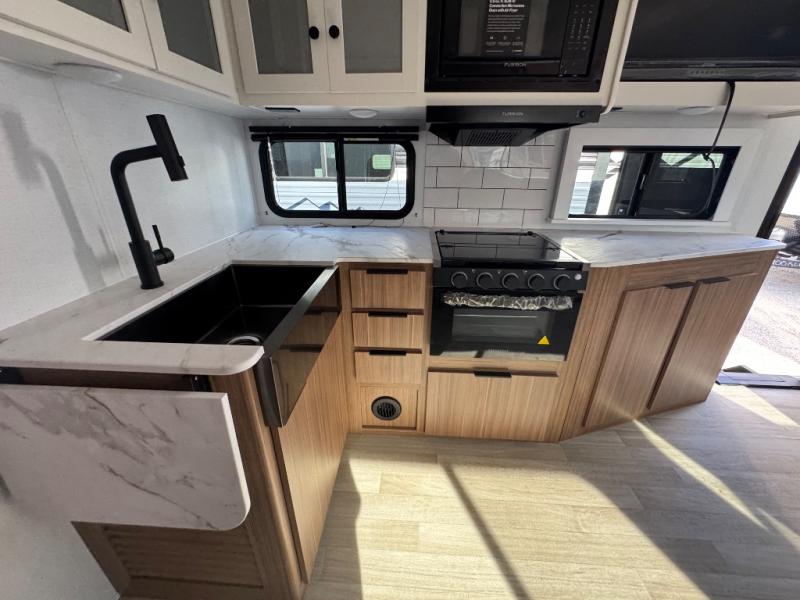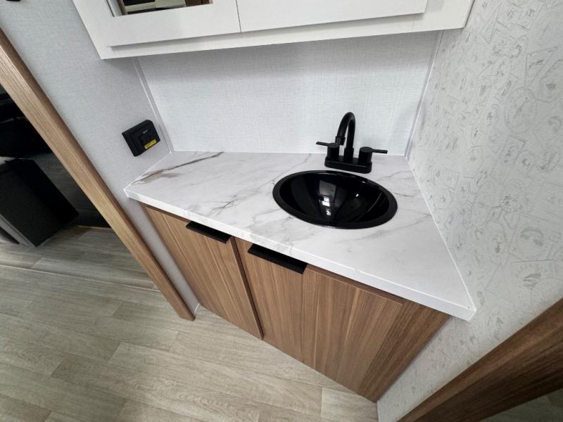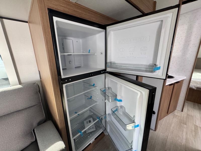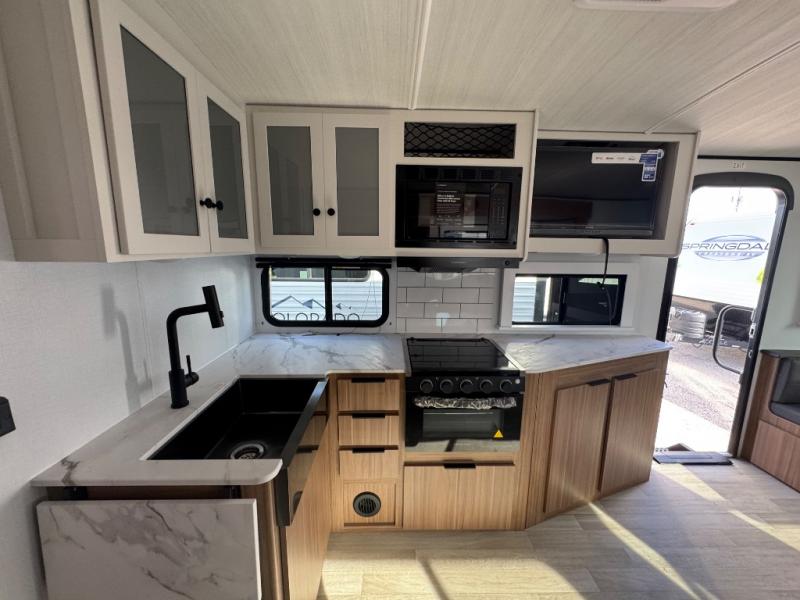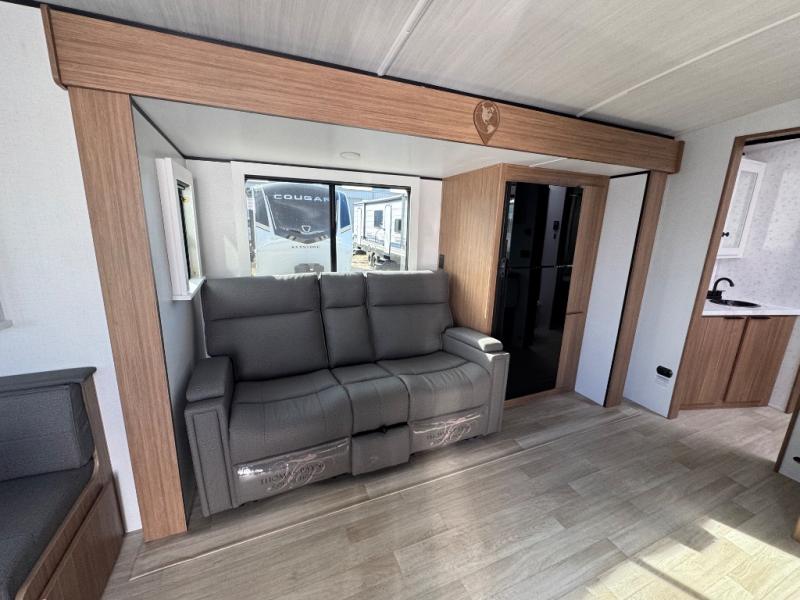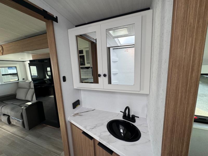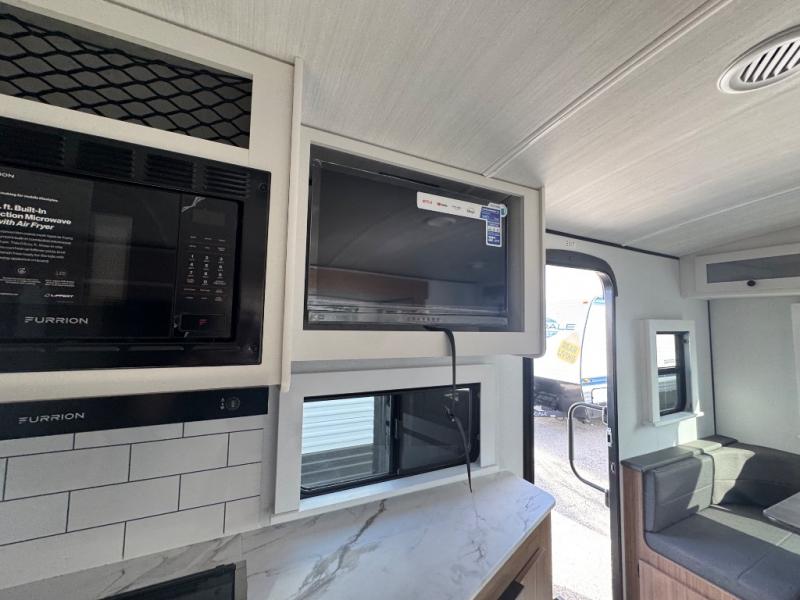 If you're looking to upgrade from a tent to a travel trailer, the time is now with this model! You will love having your own master bedroom up front with a queen bed, dual bedroom wardrobes and your own exterior entry door. The second entry door leads right into the combined kitchen and living area for added convenience. Your crew can dine or play a game around the U-shaped do-more dinette table or relax on the tri-fold sofa across from the entertainment center. These pieces of furniture will also double as your guests' sleeping space at night, and you have the option to choose luxury cinema recliners in place of the sofa if you don't need that much sleeping room. There is also a full walk-through bath to clean up in each day plus a fully-equipped kitchen to make meals!
