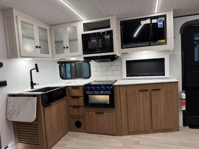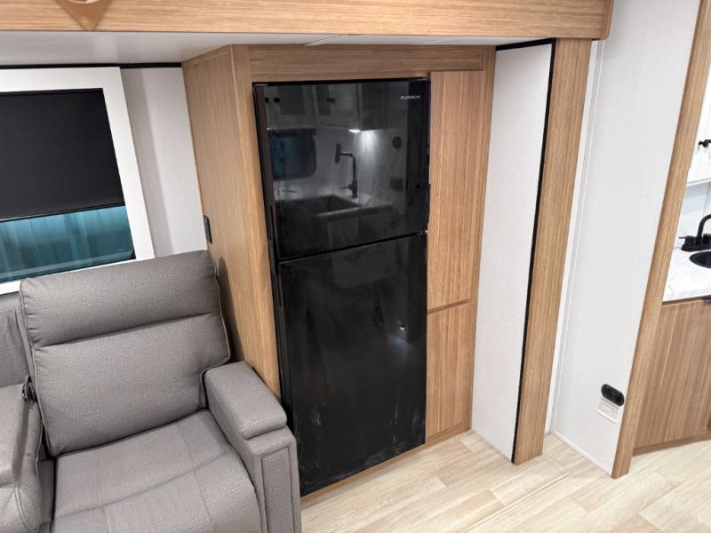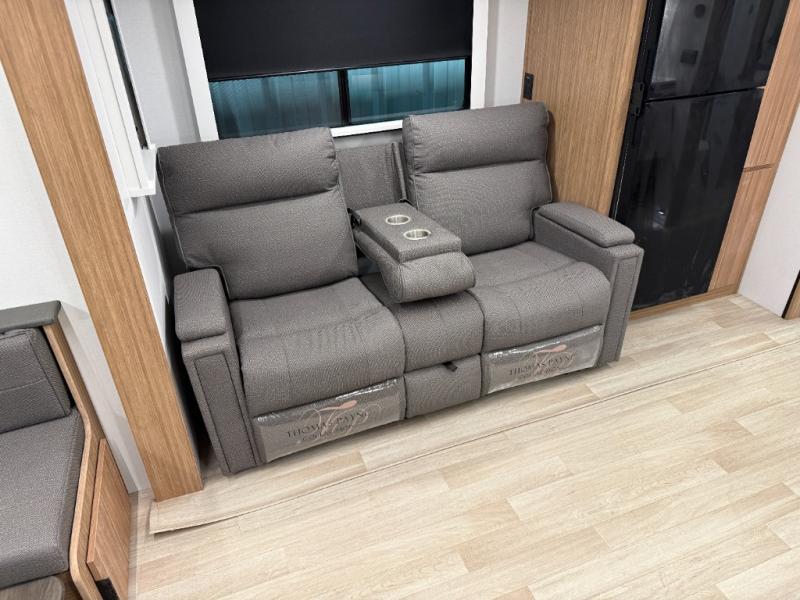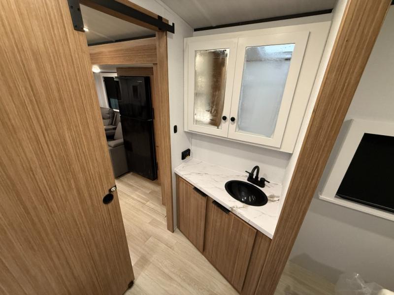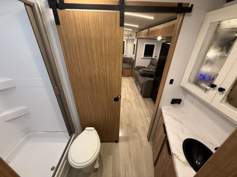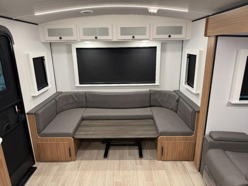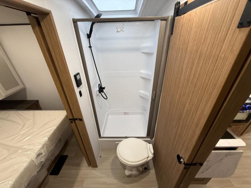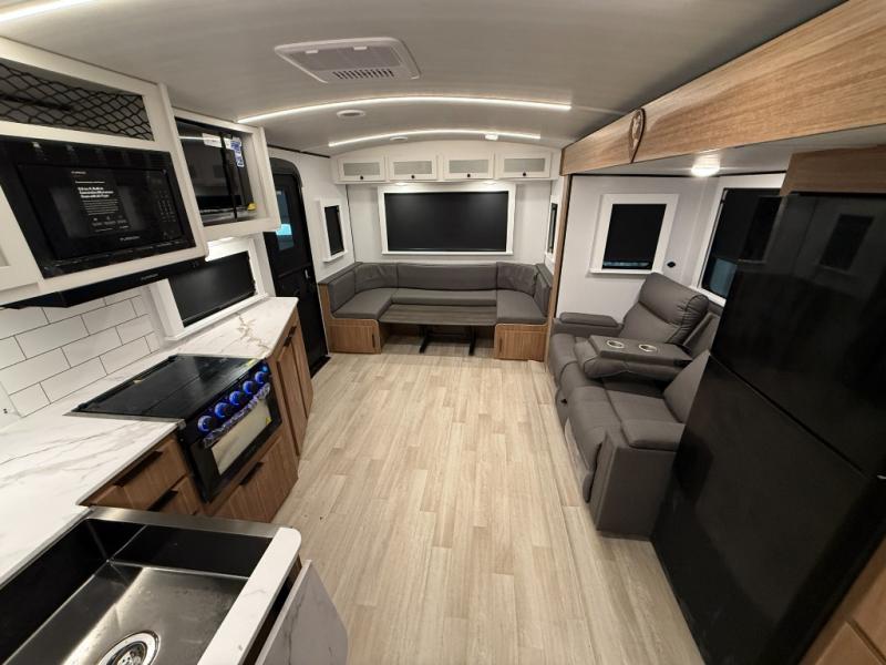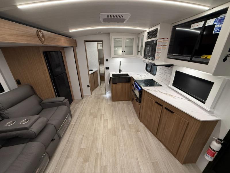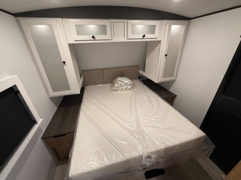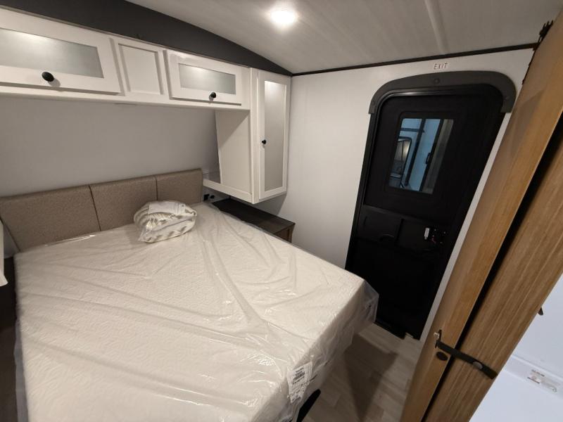If you're looking to upgrade from a tent to a travel trailer, the time is now with this model! You will love having your own master bedroom up front with a queen bed, dual bedroom wardrobes and your own exterior entry door. The second entry door leads right into the combined kitchen and living area for added convenience. Your crew can dine or play a game around the U-shaped do-more dinette table or relax on the tri-fold sofa across from the entertainment center. These pieces of furniture will also double as your guests' sleeping space at night, and you have the option to choose luxury cinema recliners in place of the sofa if you don't need that much sleeping room. There is also a full walk-through bath to clean up in each day plus a fully equipped kitchen to make meals!