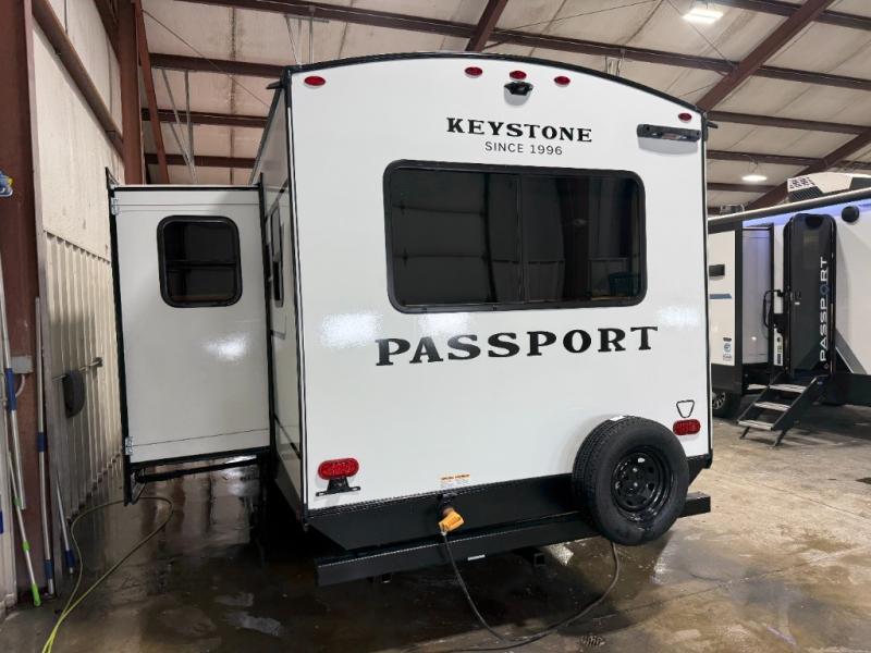 With any Keystone Passport Super Lite travel trailer you will enjoy lightweight towing and lots of interior comforts! The power tongue jack lets you hitch up at the drop of a hat, and the Dexter torsion axle rubber ride suspension will make towing easier than ever. You will appreciate having 4-point power stabilizer jacks for quick setup and an exterior convenience center to monitor tank levels. These trailers feature 5-sided aluminum construction, new premium aluminum wheels, a heated and enclosed underbelly, plus new composite solid entry steps. Inside, you'll enjoy seamless kitchen countertops, interior lights with a dimmer, a rainfall showerhead, and premium pull-down roller shades for added privacy.