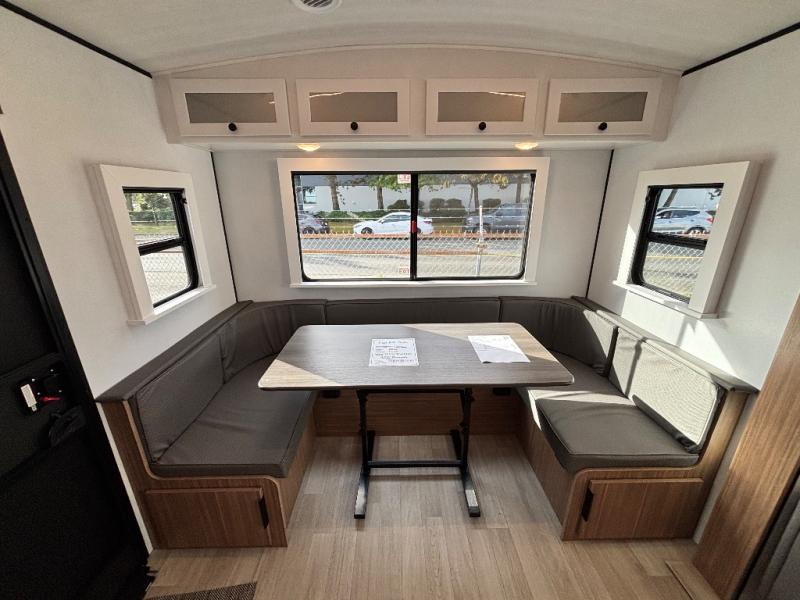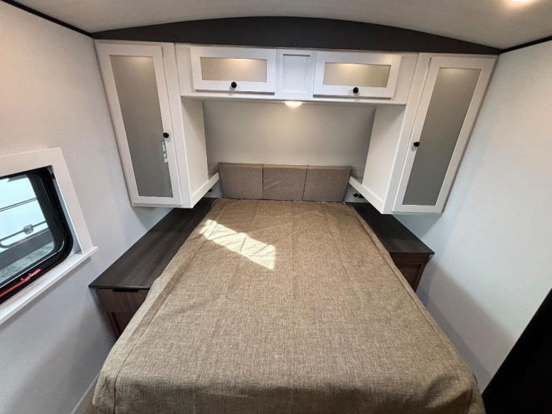 If you're looking to upgrade from a tent to a travel trailer, the time is now with this model! You will love having your own master bedroom up front with a queen bed, dual bedroom wardrobes and your own exterior entry door. The second entry door leads right into the combined kitchen and living area for added convenience. Your crew can dine or play a game around the U-shaped dinette or relax on the tri-fold sofa across from the entertainment center. These pieces of furniture will also double as your guests' sleeping space at night, and you have the option to choose luxury cinema recliners in place of the sofa if you don't need that much sleeping room. There is also a full walk-through bath to clean up in each day plus a fully-equipped kitchen to make meals!