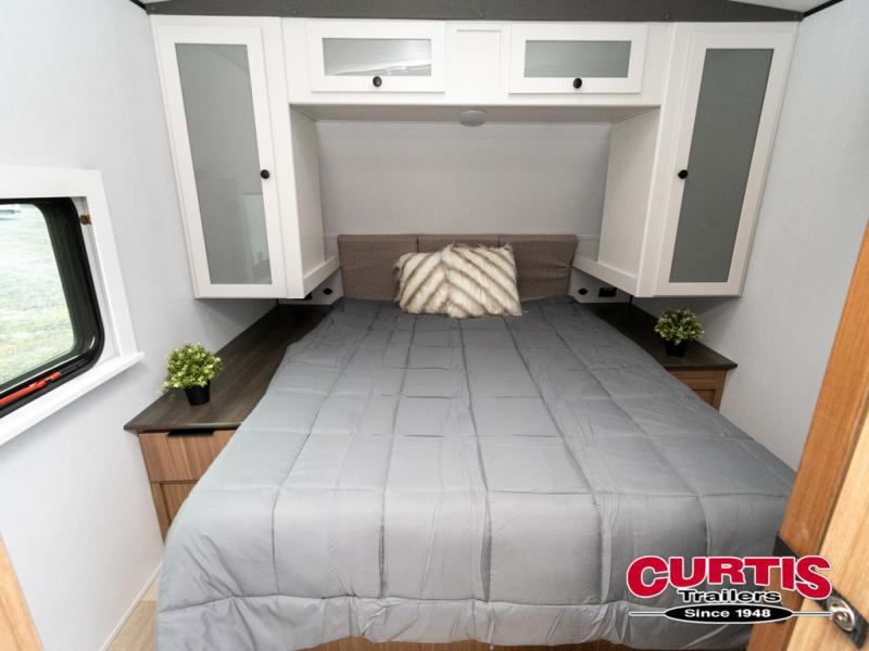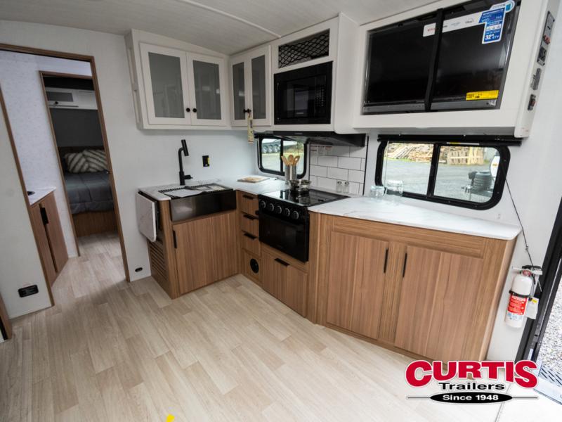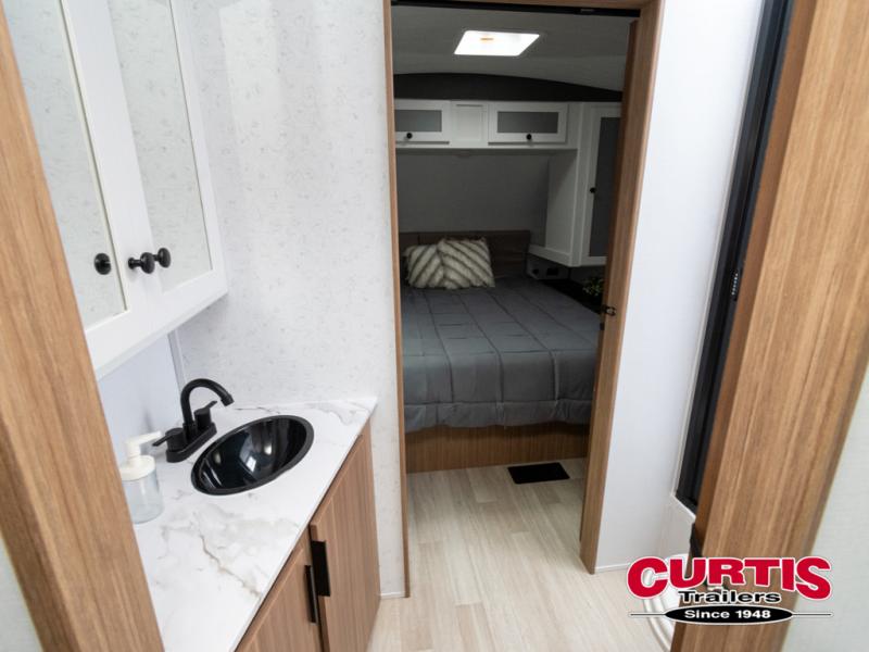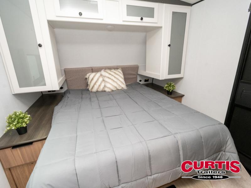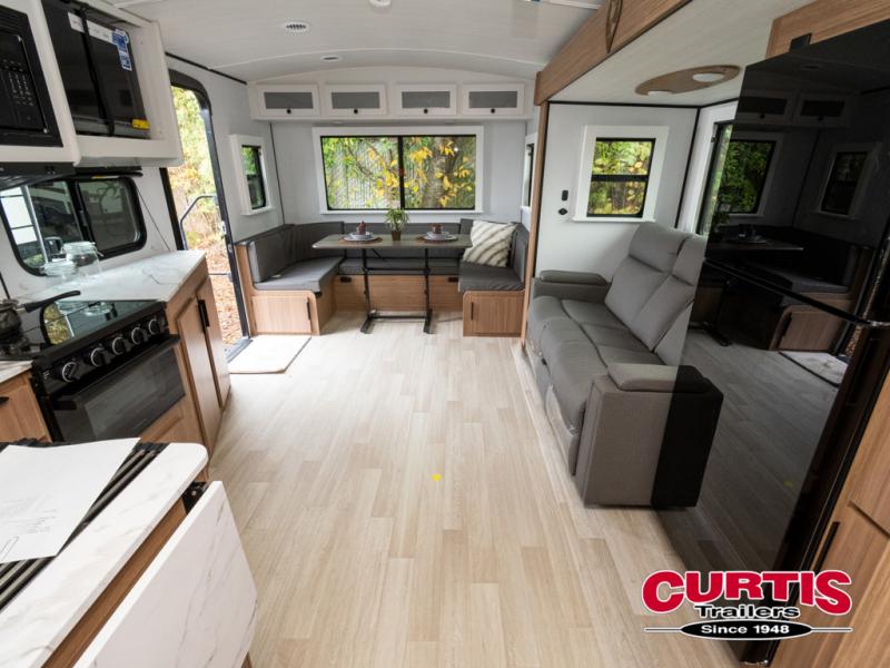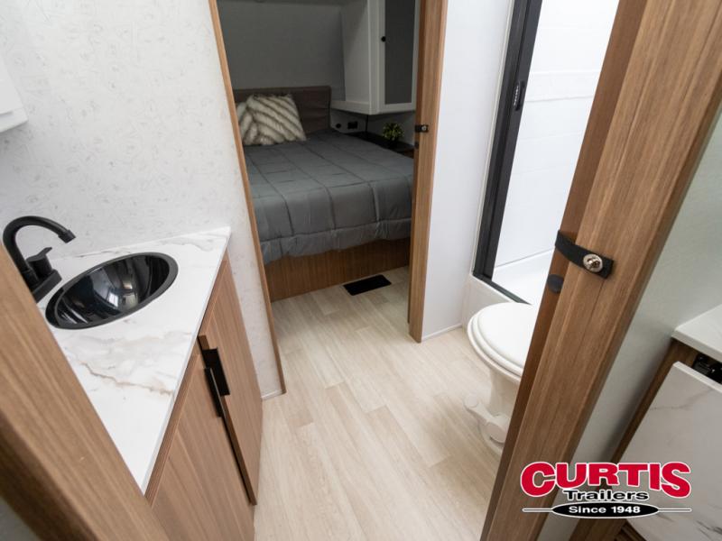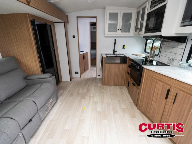 If you're looking to upgrade from a tent to a travel trailer, the time is now with this model! You will love having your own master bedroom up front with a queen bed, dual bedroom wardrobes and your own exterior entry door. The second entry door leads right into the combined kitchen and living area for added convenience. Your crew can dine or play a game around the U-shaped dinette or relax on the tri-fold sofa across from the entertainment center. These pieces of furniture will also double as your guests' sleeping space at night, and you have the option to choose luxury cinema recliners in place of the sofa if you don't need that much sleeping room. There is also a full walk-through bath to clean up in each day plus a fully-equipped kitchen to make meals!
