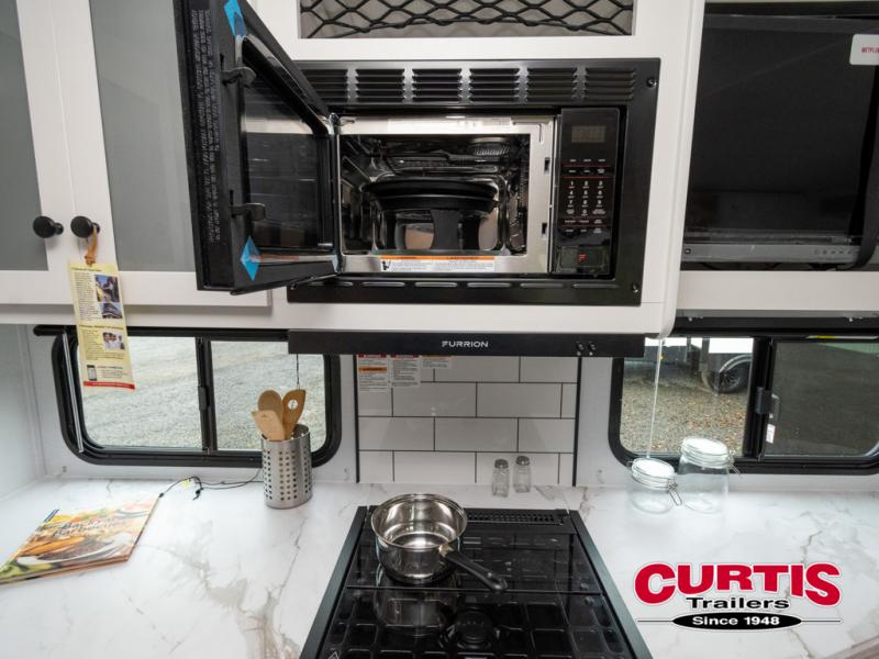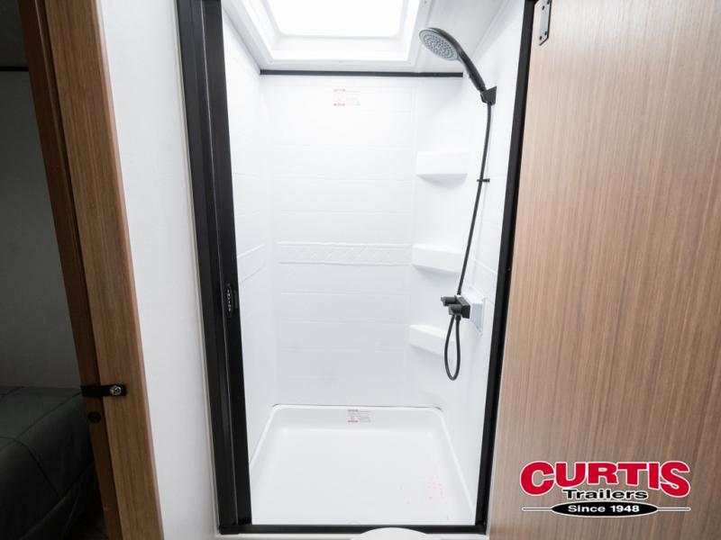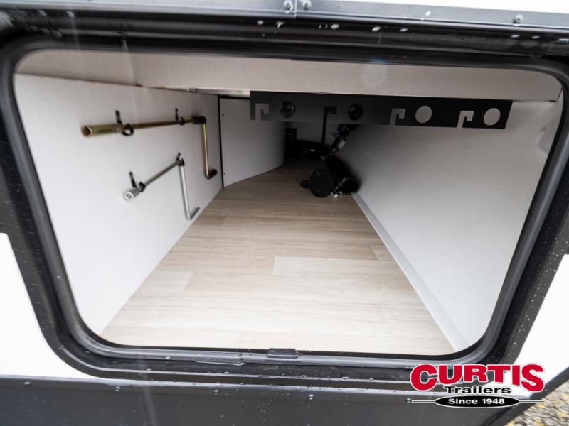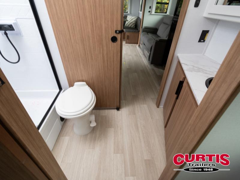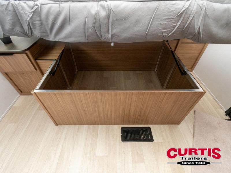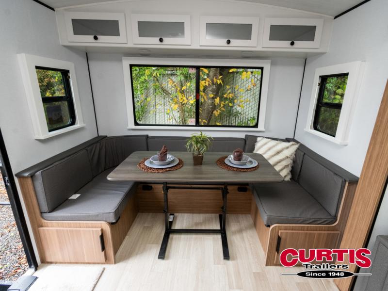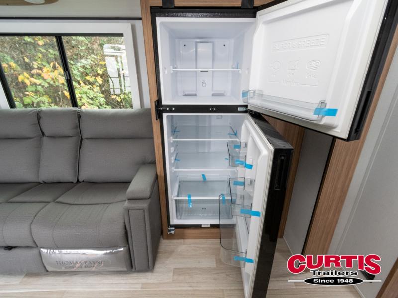 If you're looking to upgrade from a tent to a travel trailer, the time is now with this model! You will love having your own master bedroom up front with a queen bed, dual bedroom wardrobes and your own exterior entry door. The second entry door leads right into the combined kitchen and living area for added convenience. Your crew can dine or play a game around the U-shaped dinette or relax on the tri-fold sofa across from the entertainment center. These pieces of furniture will also double as your guests' sleeping space at night, and you have the option to choose luxury cinema recliners in place of the sofa if you don't need that much sleeping room. There is also a full walk-through bath to clean up in each day plus a fully-equipped kitchen to make meals!
